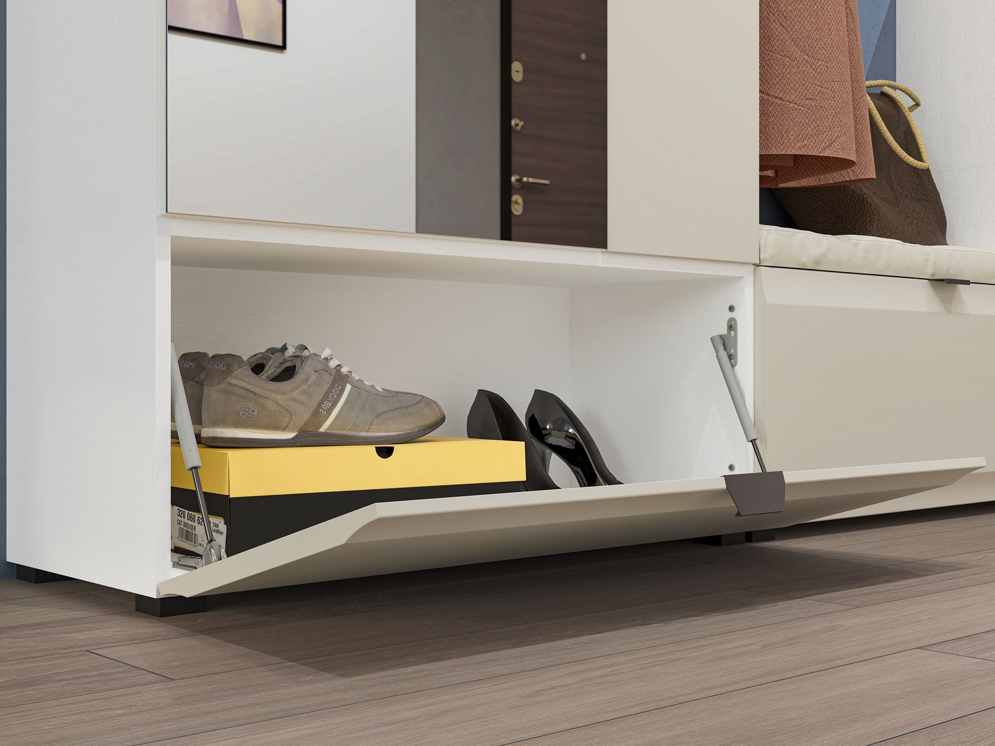 Тумба TURIN с откидным фасадом оснащена газовым лифтом с открыванием вниз. Крышка в тон фасада входит в стоимость. На выбор предлагается несколько вариантов ручек и опор, благодаря чему можно придать мебели индивидуальный стиль.