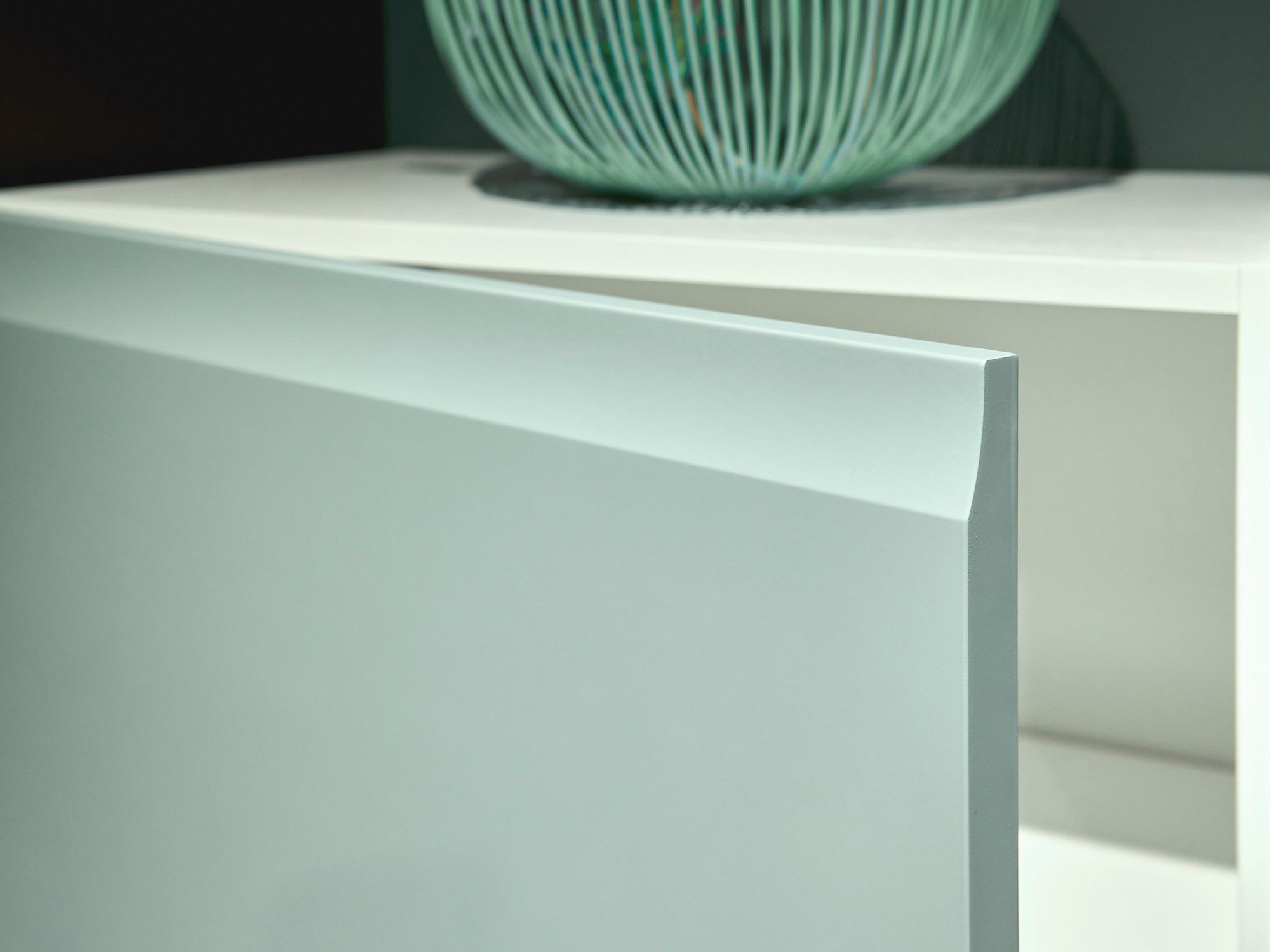 Благодаря многослойной отделке эмалью фасады коллекции не имеют острых кромок, что делает взаимодействие с мебелью тактильно приятным и повышает безопасность использования.