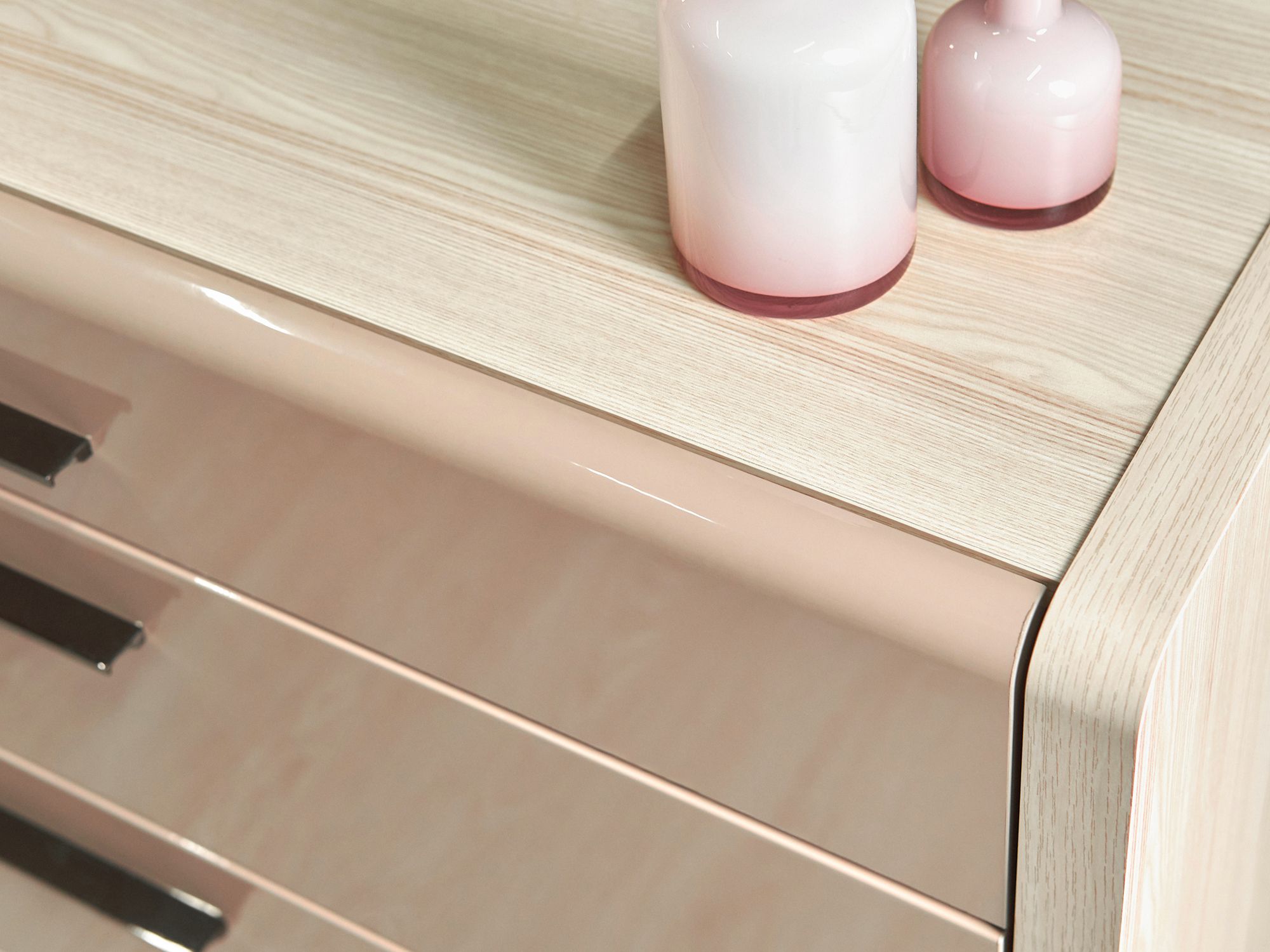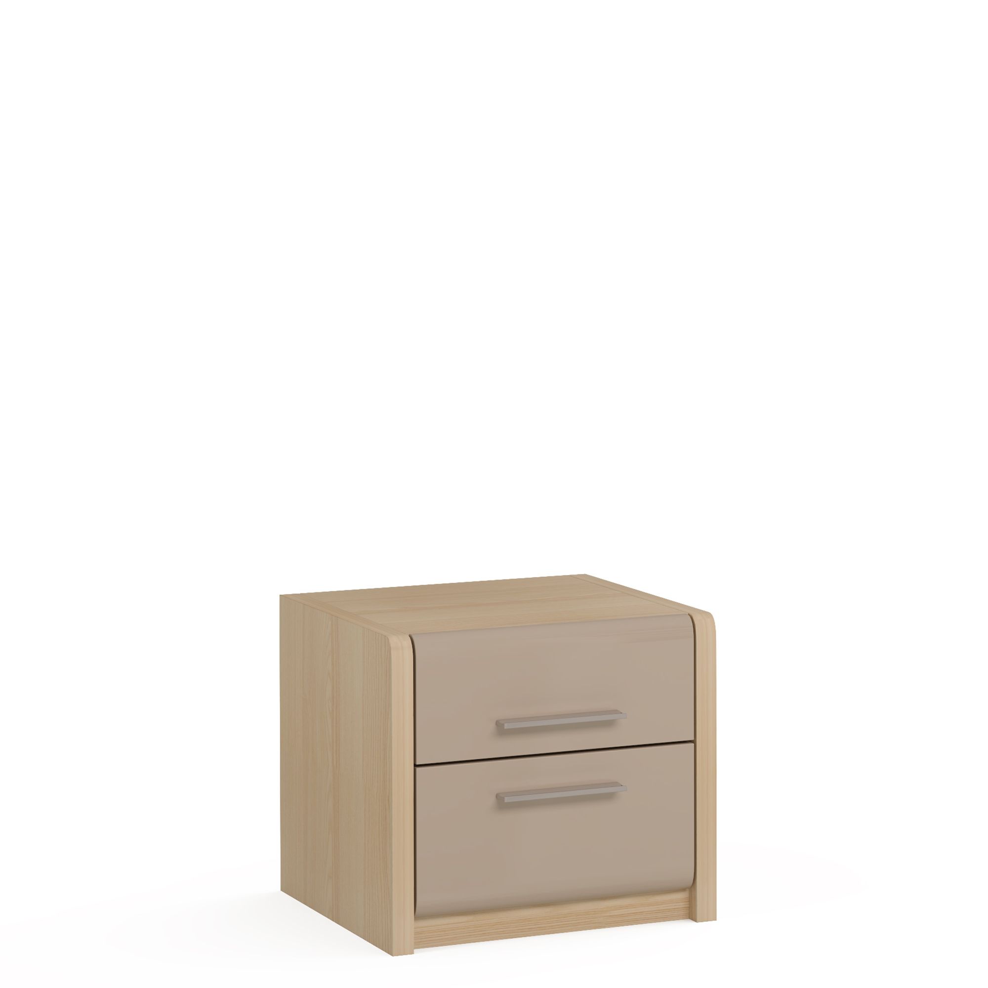 Прикроватная тумба ESTE оснащена двумя выдвижными ящиками с плавными, скругленными гранями фасадов, которые делают взаимодействие с мебелью особенно приятным. В производстве фасадов использована технология окутывания, позволяющая получить детали без кромок.