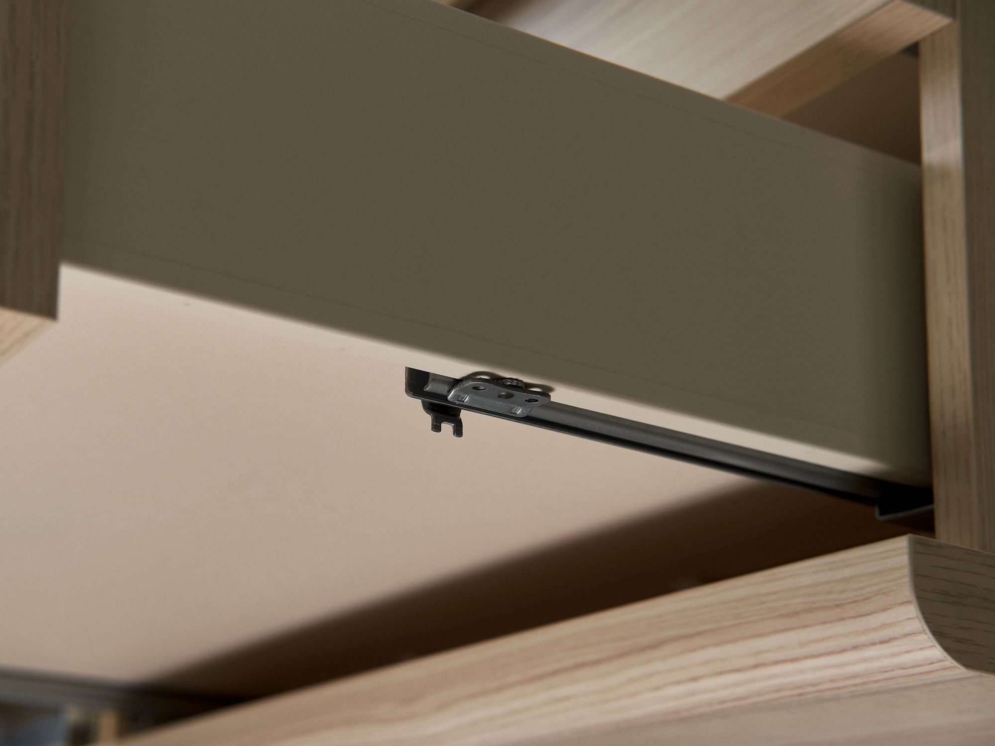 Для выдвижных ящиков используются направляющие скрытого монтажа. Плавное бесшумное движение ящиков обеспечено благодаря специальной геометрии профиля, а долговечный комфорт использования создают стальные шарикоподшипники. Ящик двигается легко и плавно даже при экстремальных нагрузках.