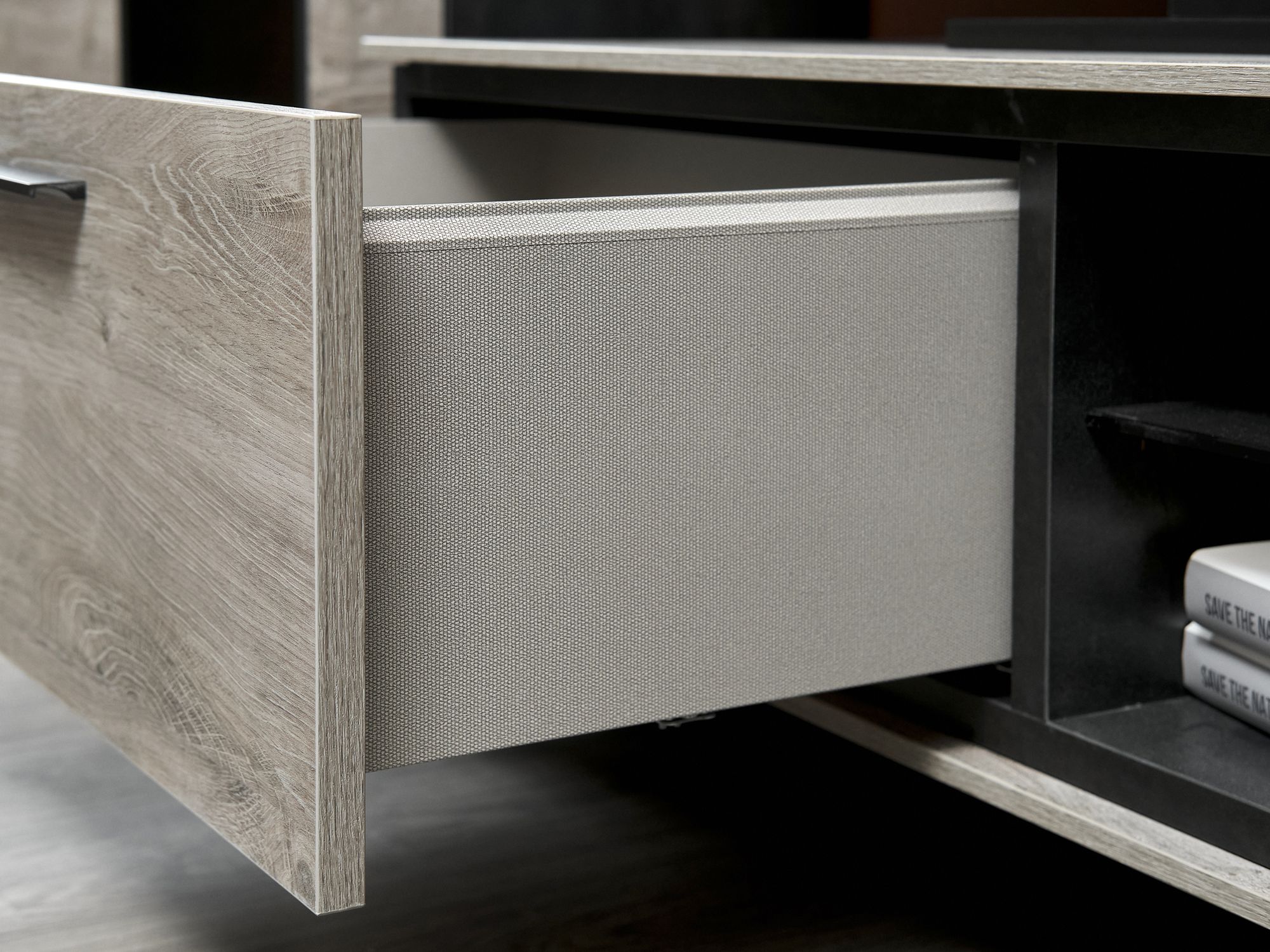 Внутреннее пространство выдвижных ящиков выполнено в отделке текстурой Шенилл, которая в точности воспроизводит рисунок плетения натуральной ткани и применяется, как правило, исключительно в европейских премиальных коллекциях. Эксклюзивность дизайна подчеркнута изящными верхними гранями боковых стенок, выполненными с применением специальной технологии фрезерования.
