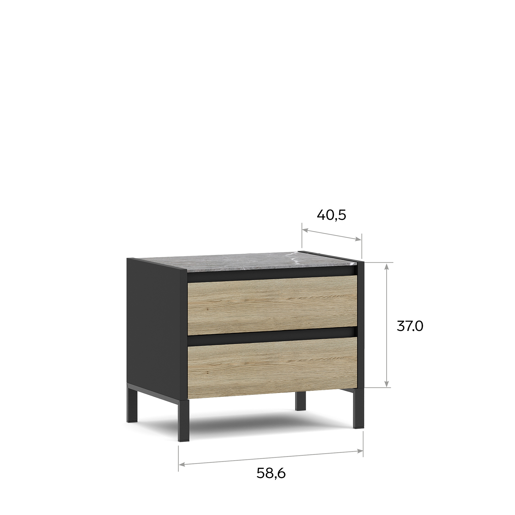 Прикроватная тумба BRUNO оснащена двумя выдвижными ящиками с эргономичной J-ручкой. Внутренняя отделка в текстуре Шенилл создает ощущение, что ящики застелены натуральной тканью. Верхняя крышка тумбы декорирована текстурой Мрамор Patagonia. Модель оснащается низкими регулируемыми опорами из пластика либо высокими опорами из металла в черной матовой отделке на выбор (в стоимость изделия не входят). ВАЖНО! Высота изделия указана без учета опор (опоры высотой 1,8 см или 11,5 см заказываются отдельно). * Внешний вид реальных изделий может незначительно отличаться от представленных на сайте. В частности, допустимо смещение рисунков древесной текстуры относительно друг друга.