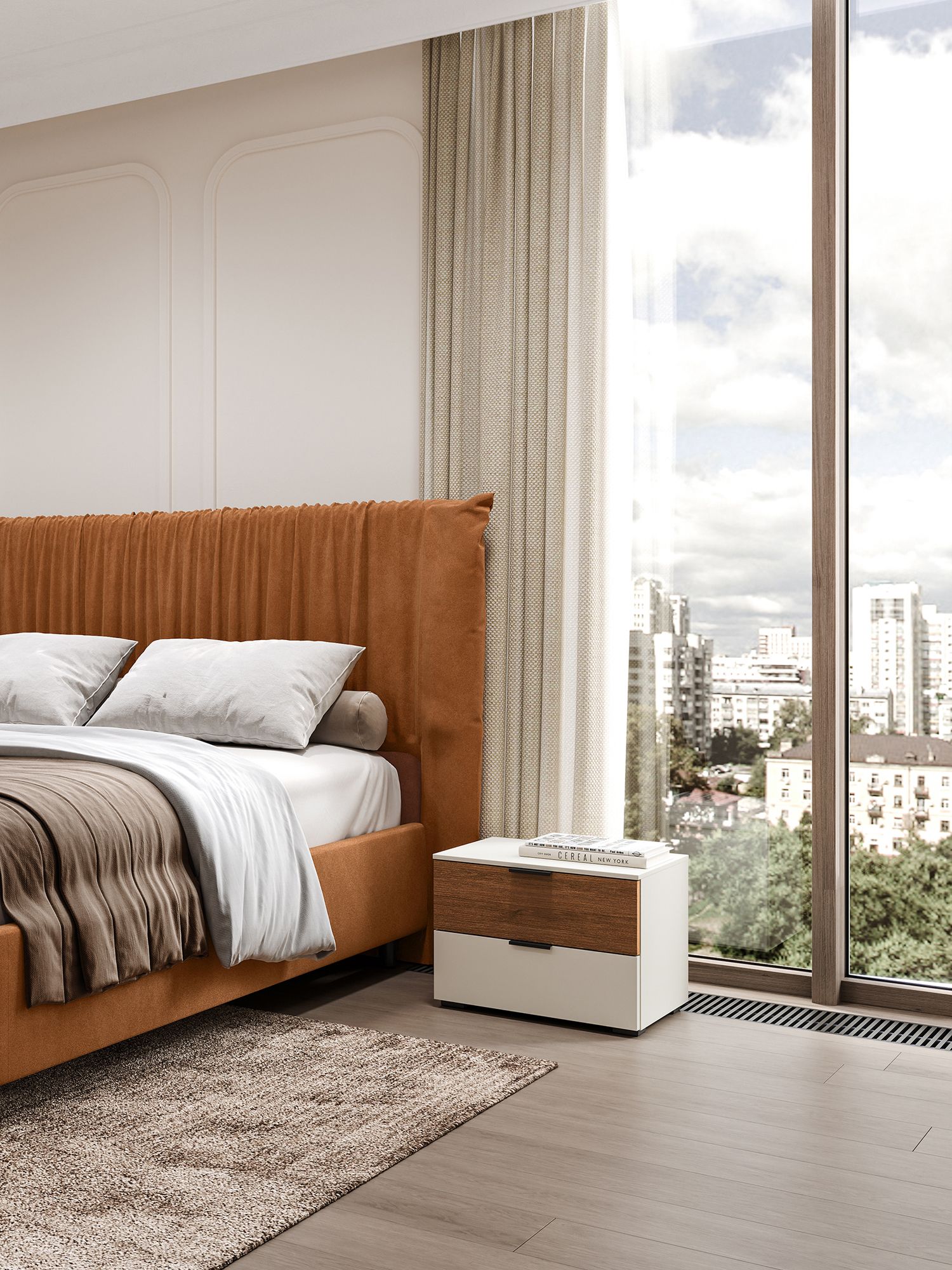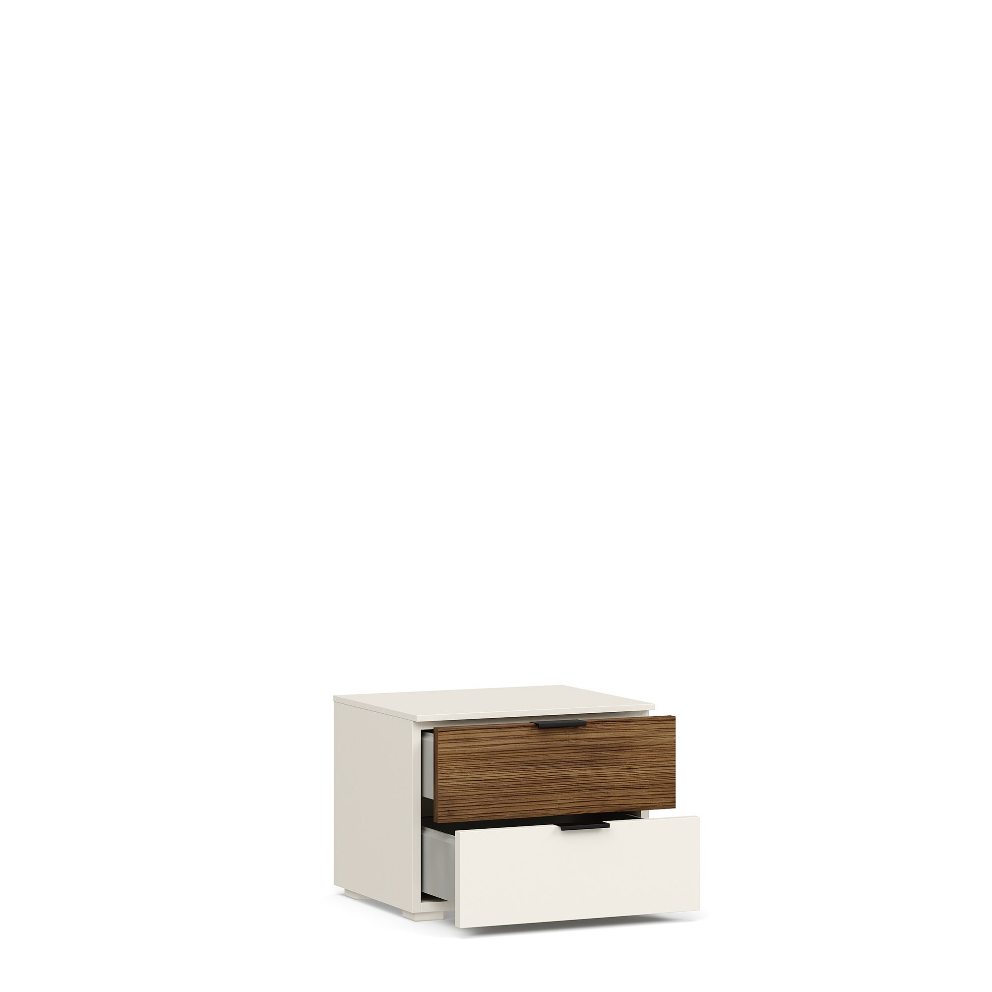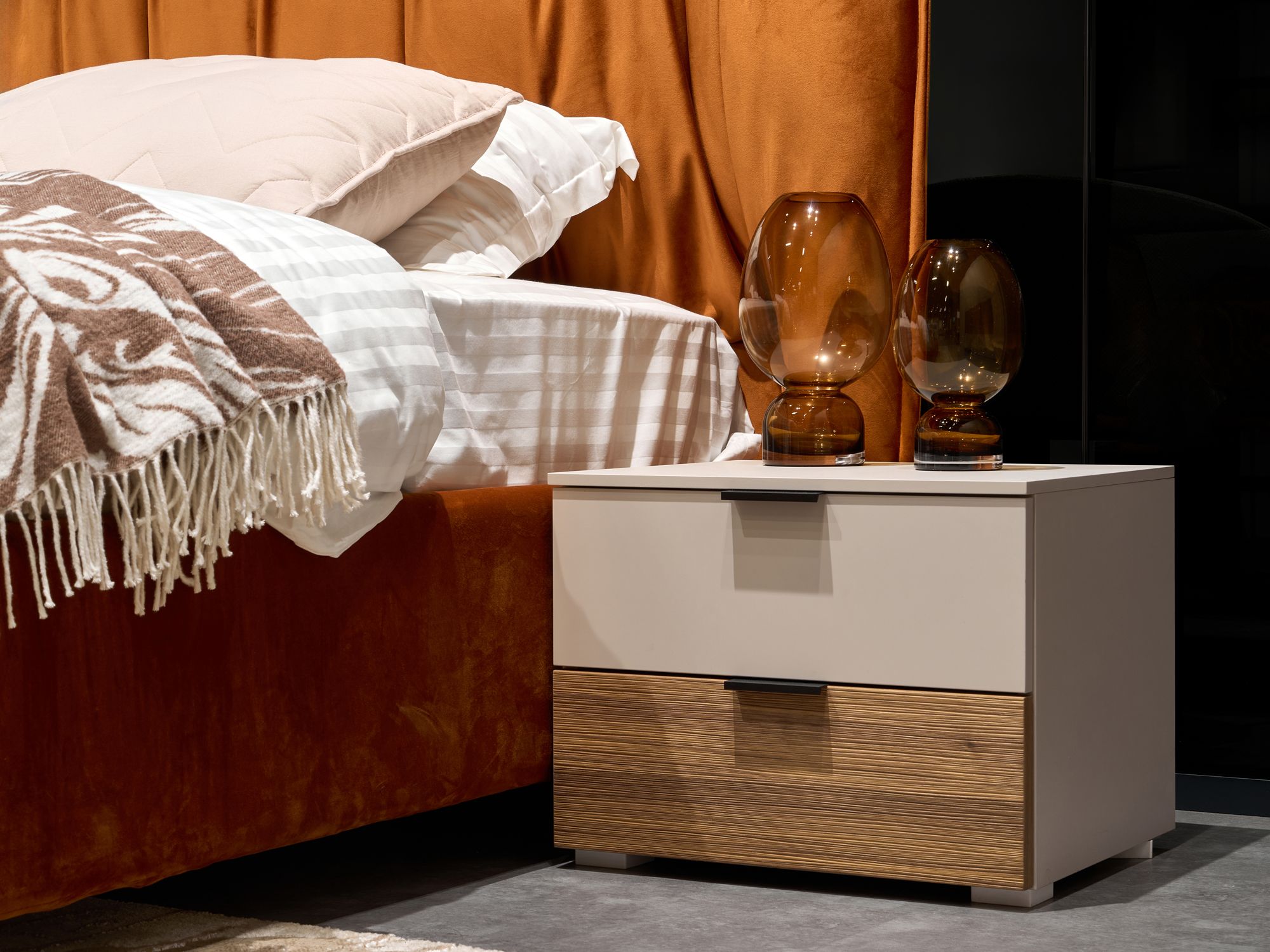 Прикроватная тумба MONAKO оснащена двумя выдвижными ящиками, верхний из которых выполнен в отделке натуральным шпоном, а нижний – премиальной шелковой эмалью.