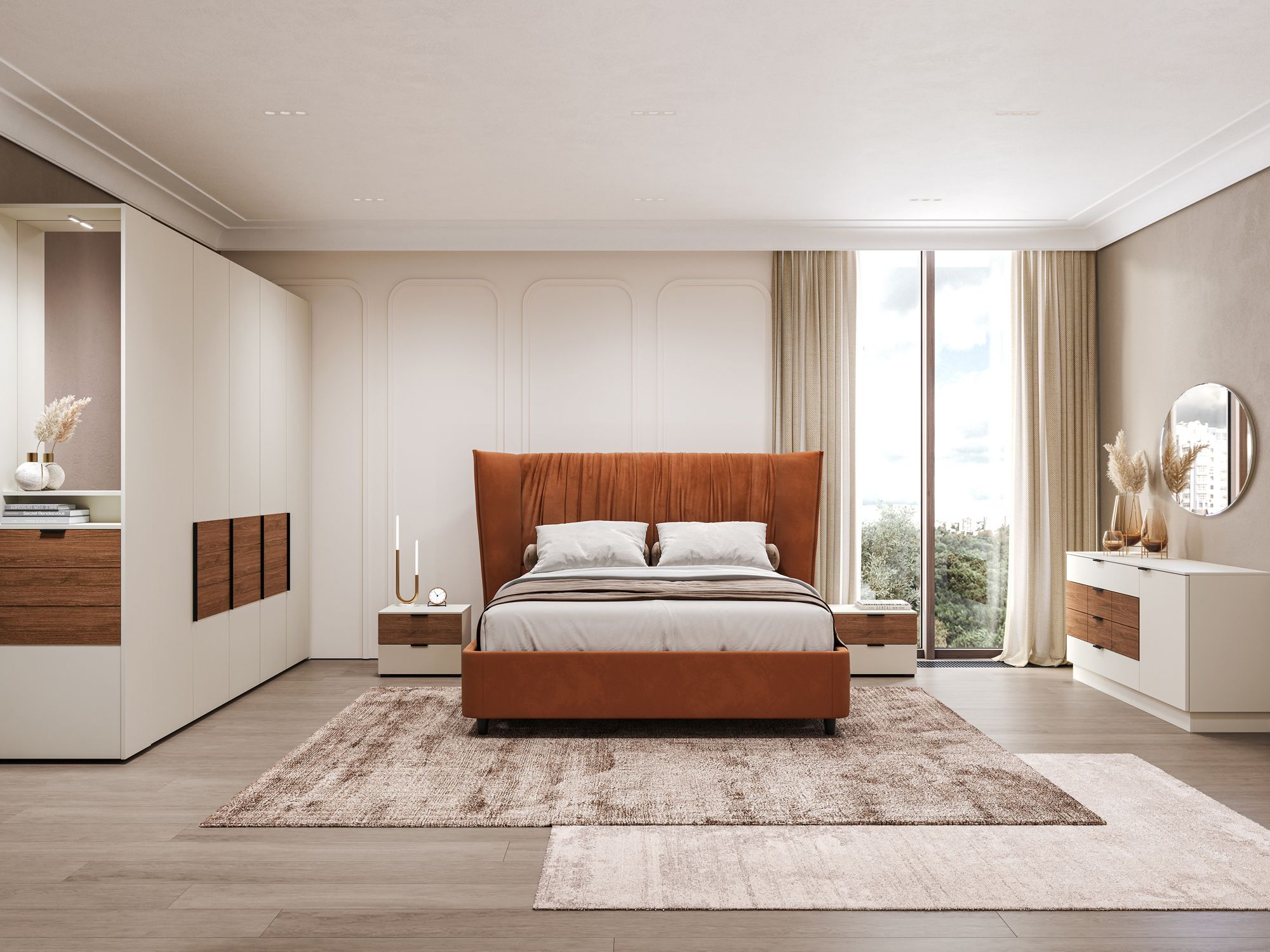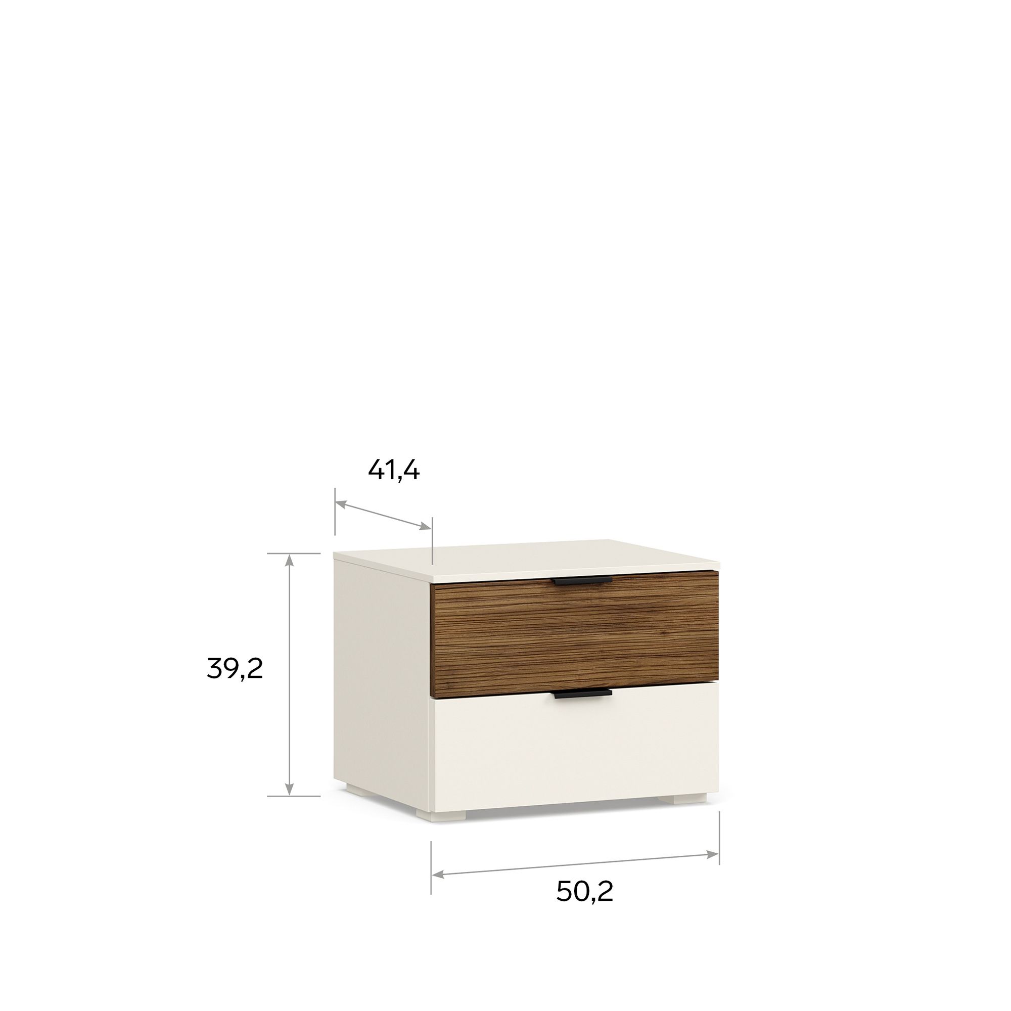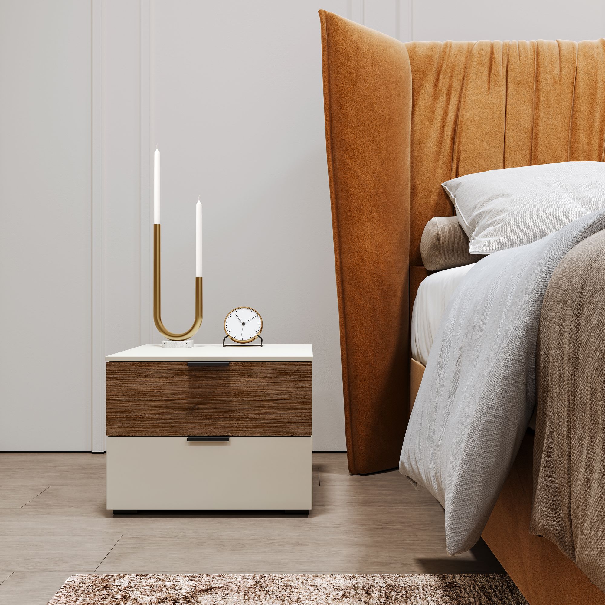 Прикроватная тумба MONAKO оснащена двумя выдвижными ящиками, верхний из которых выполнен в отделке натуральным шпоном, а нижний – премиальной шелковой эмалью.