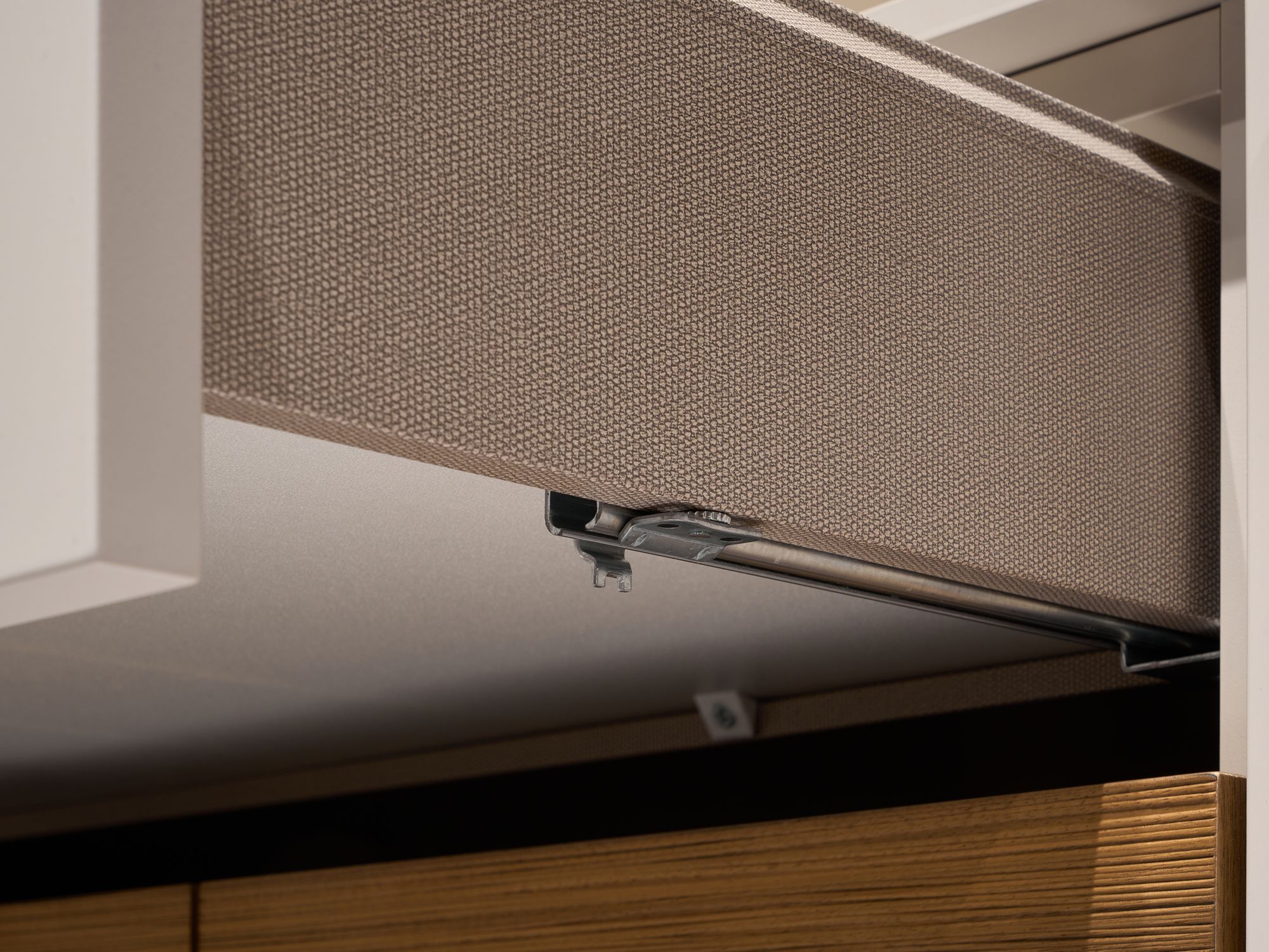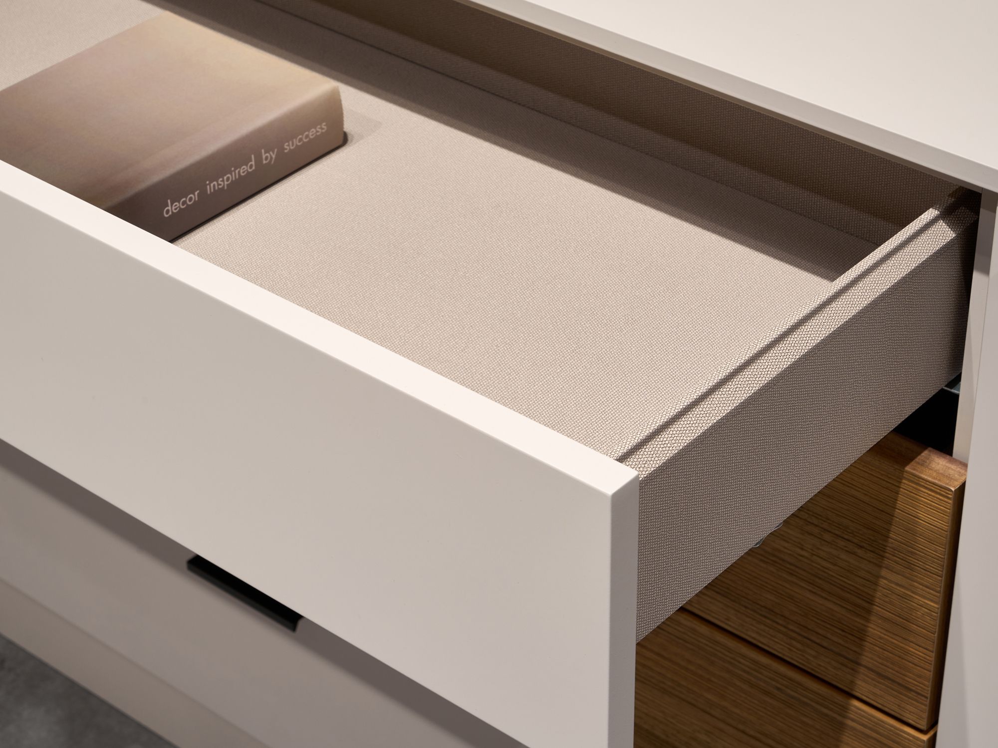 Выдвижные ящики с изящной скошенной гранью боковины выполнены в отделке текстурой Шенилл, в точности воспроизводящей рисунок плетения натуральной ткани.