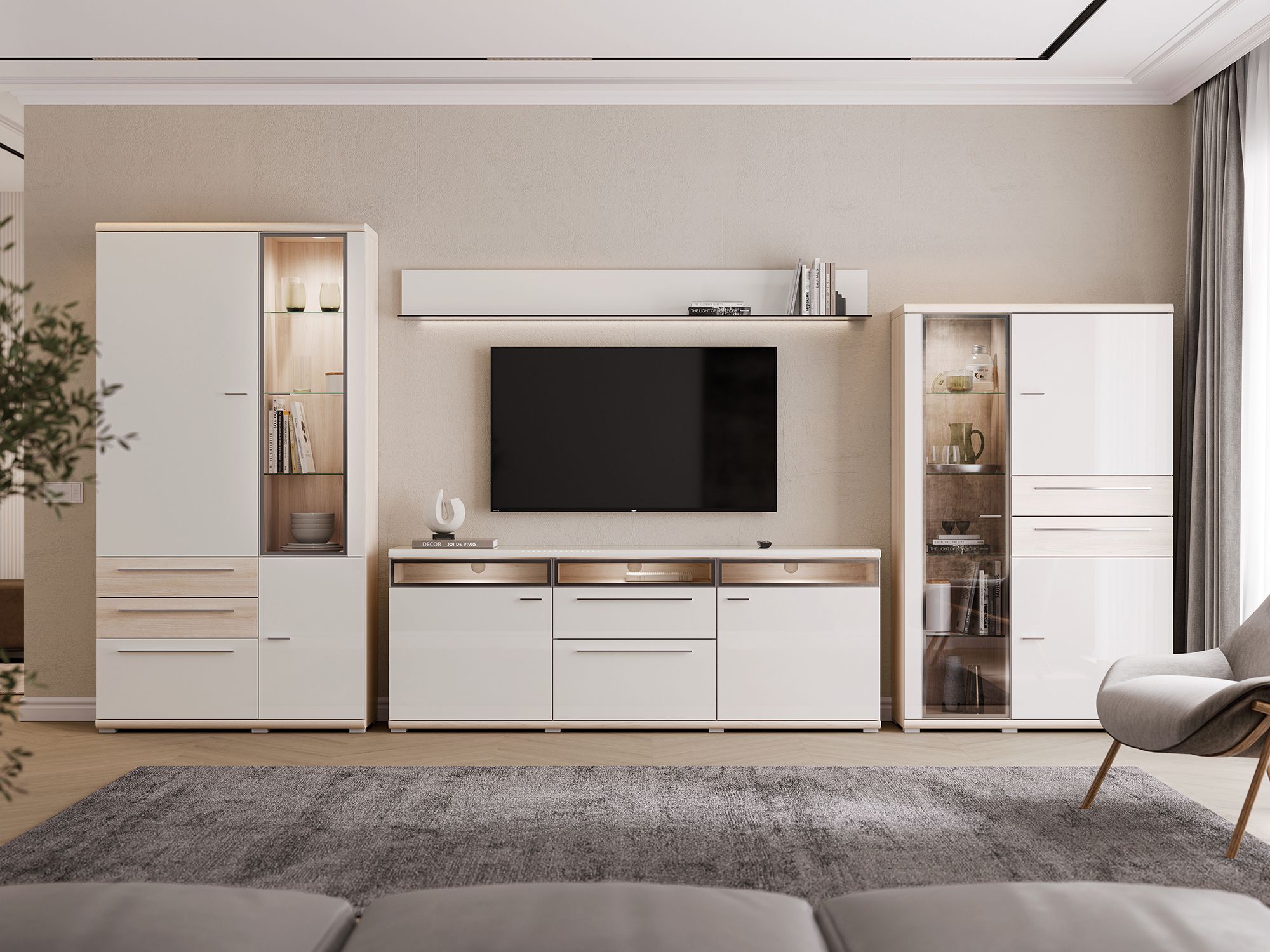Сочетание светлой древесной текстуры с нежными сливочными оттенками глянцевых и матовых фасадов придает коллекции особое благородство, делая ее прекрасным выбором для современных аристократов.