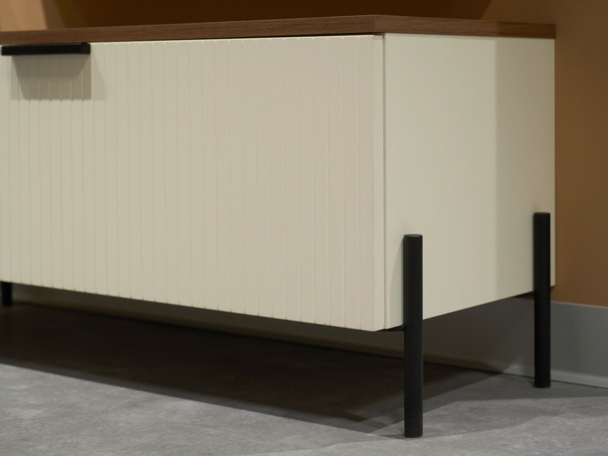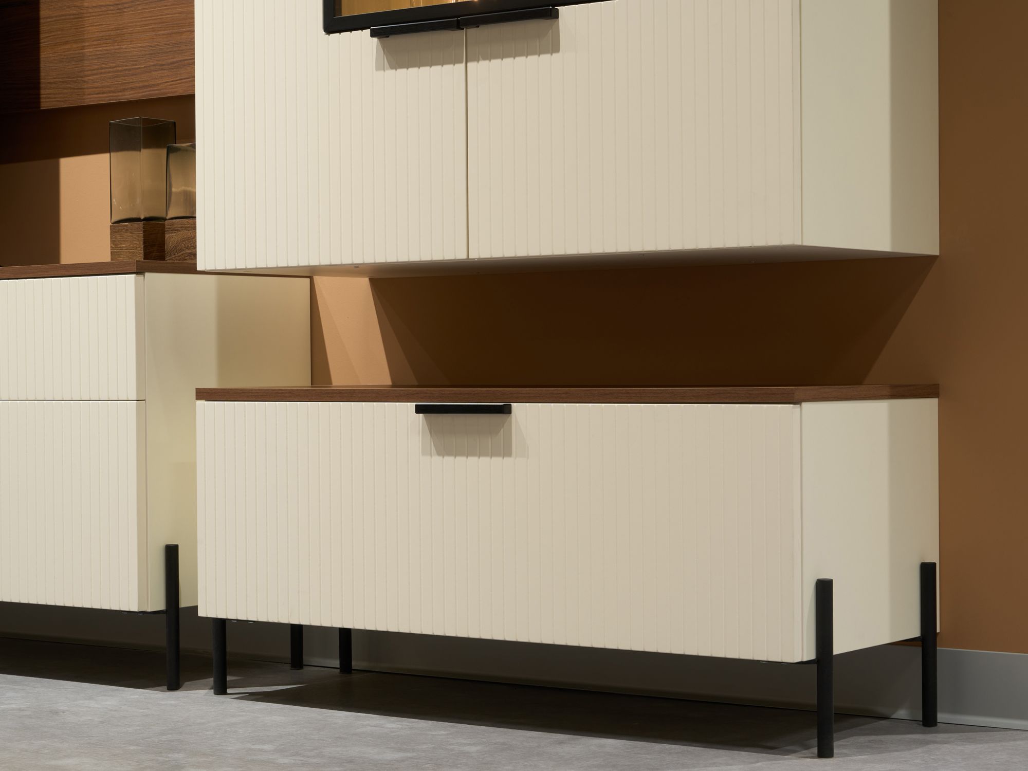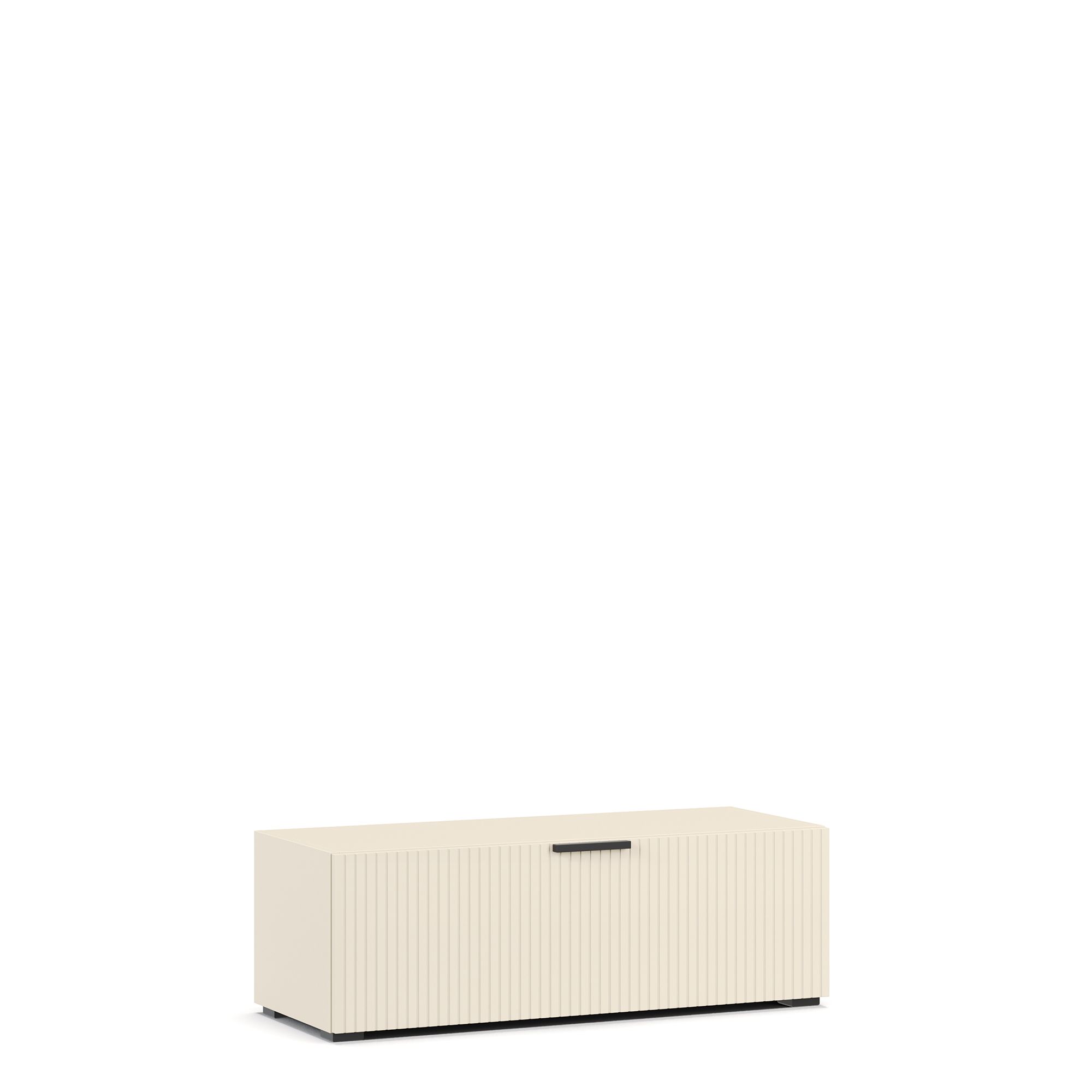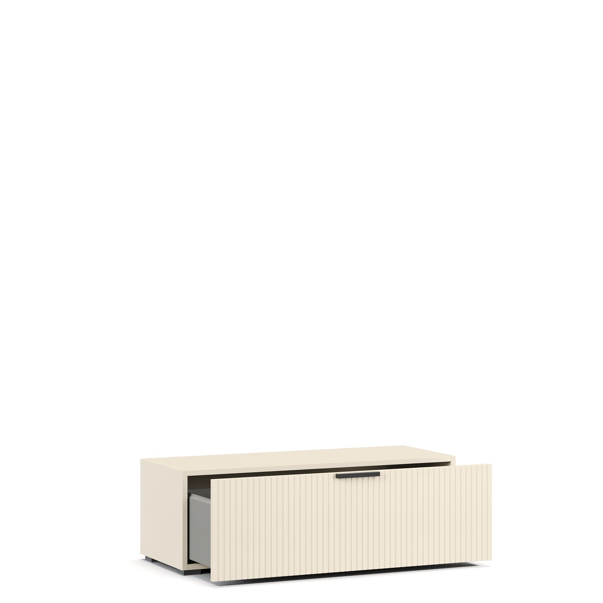 ТВ-тумба NAPOLI с фасадом, декорированным вертикальной фрезеровкой, оснащена одним выдвижным ящиком. В качестве опции предлагается возможность установки тумбы на опоры высотой 12 см (заказываются отдельно). В стоимость изделия включена крышка в тон фасадов (возможна замена на крышку в древесной текстуре). Использование тумбы без этого элемента дизайном не предусмотрено.