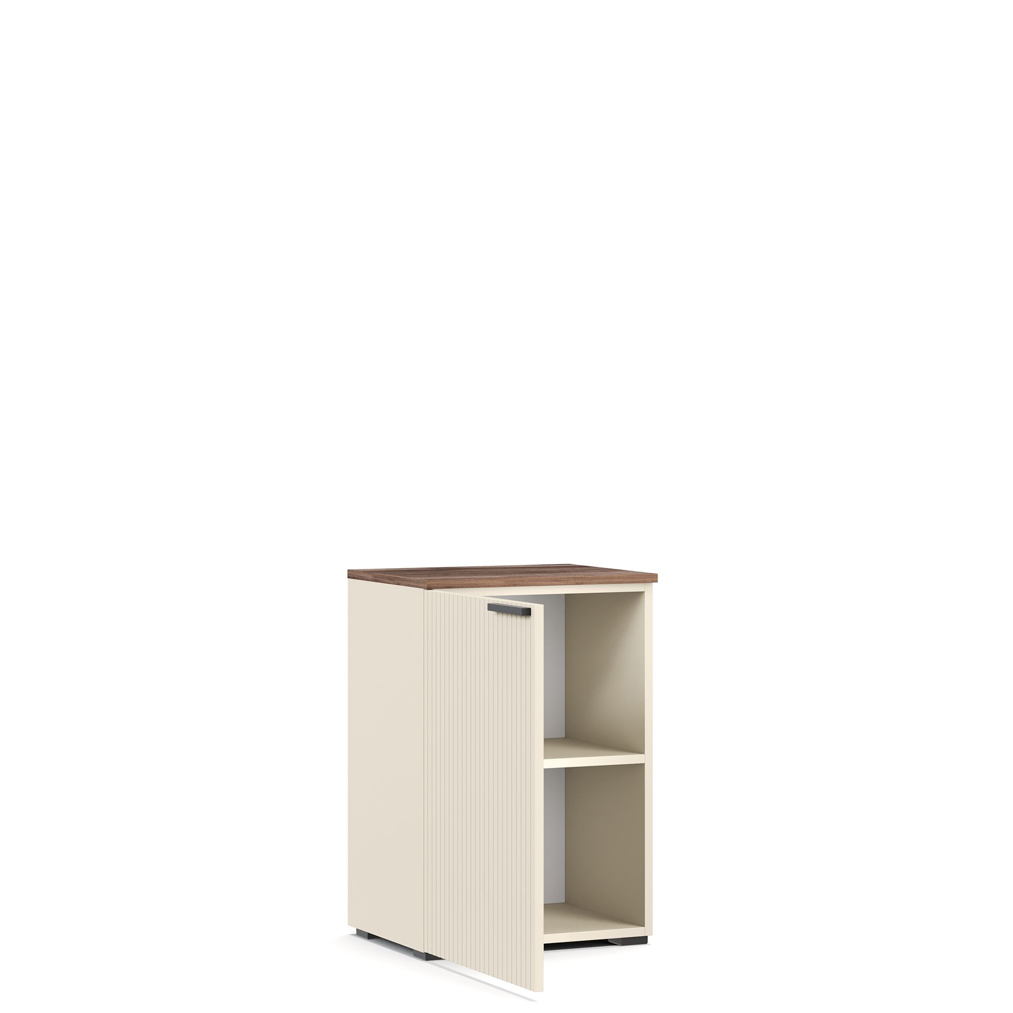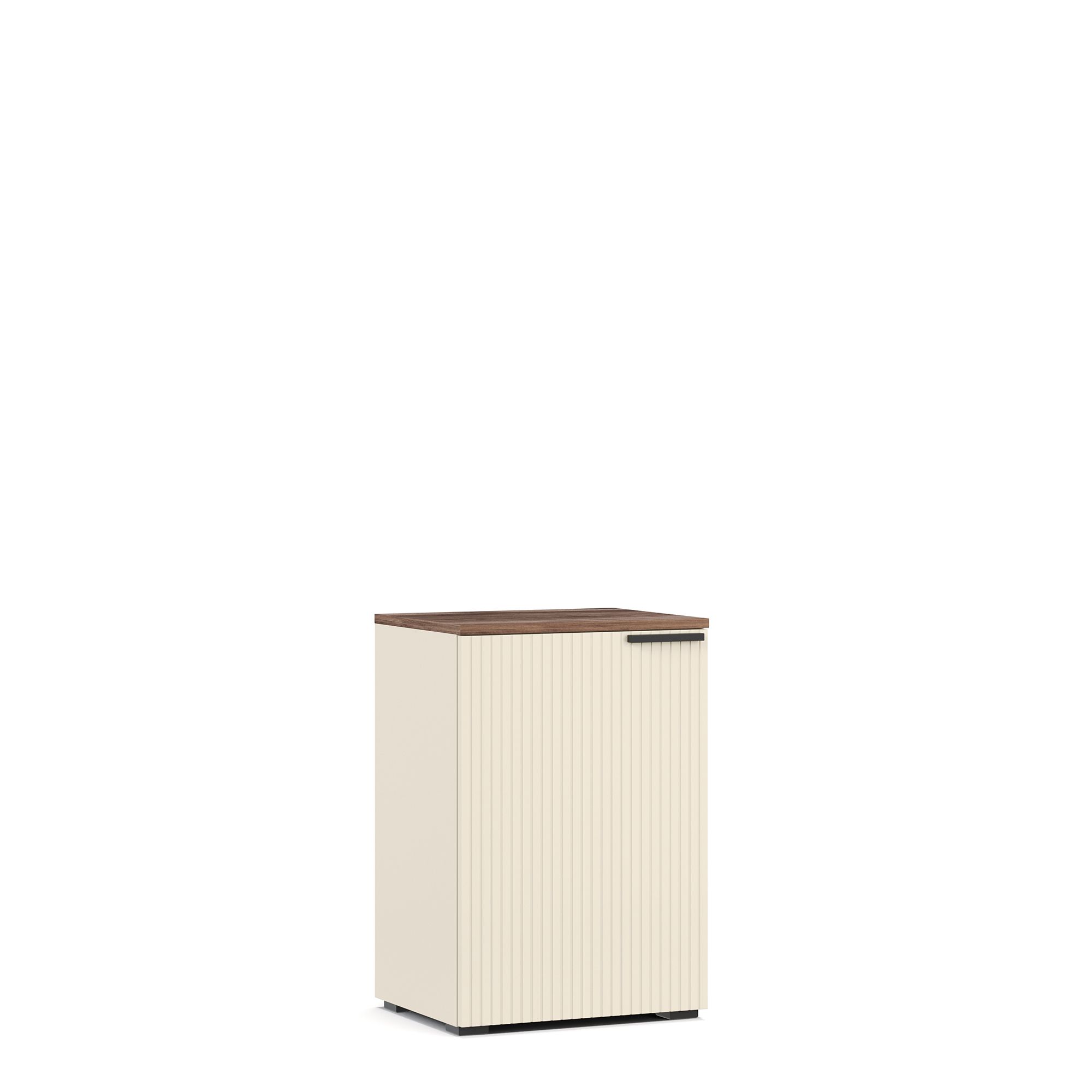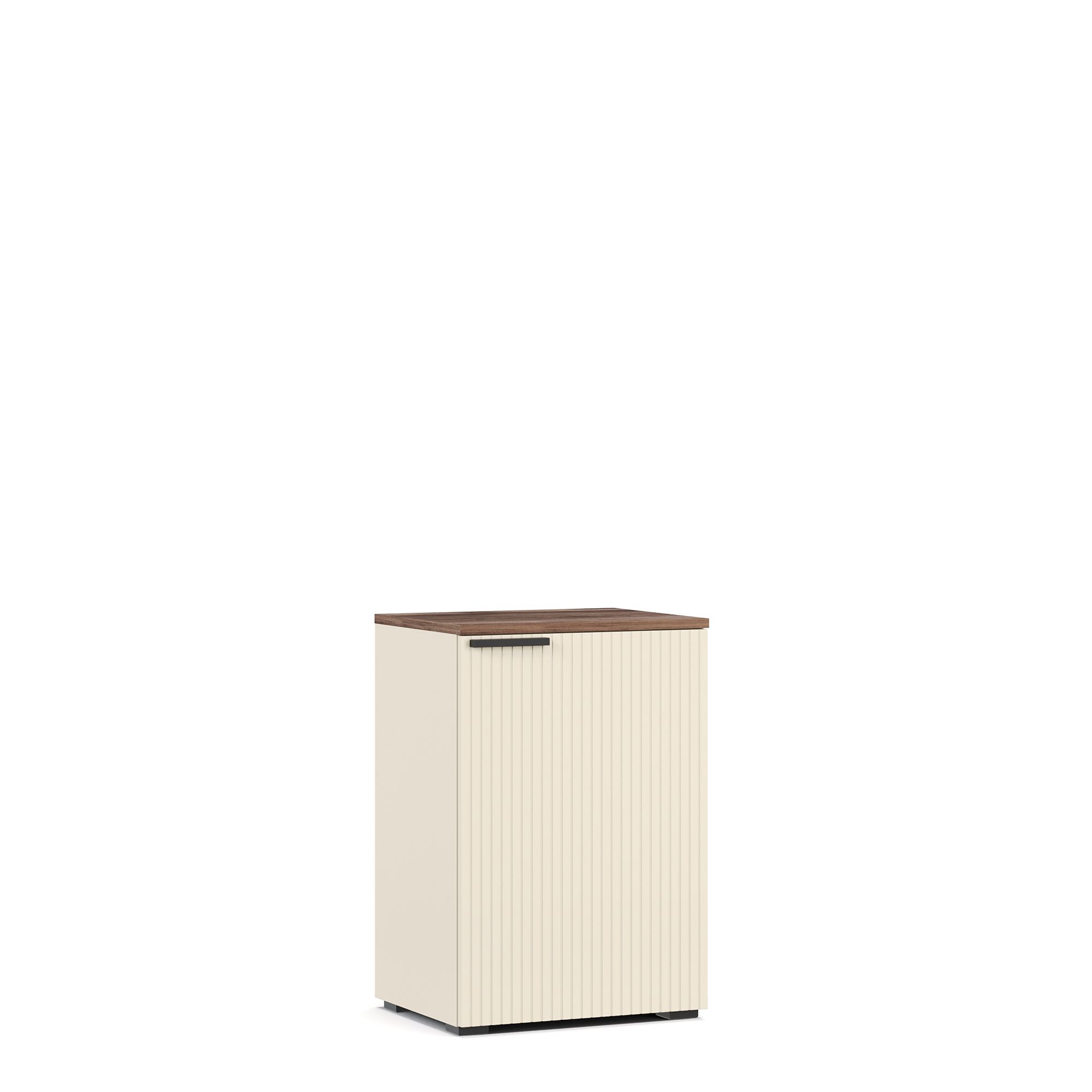 Прикроватная тумба NAPOLI с крышкой в отделке древесной текстурой (входит в комплектацию модели) оснащена распашным фасадом в отделке вертикальной фрезеровкой. Возможно как левое, так и правое открывание фасада. За фасадом располагается полка из ЛДСП. В качестве опции предлагается установка тумбы на опоры высотой 12 см (заказываются отдельно).