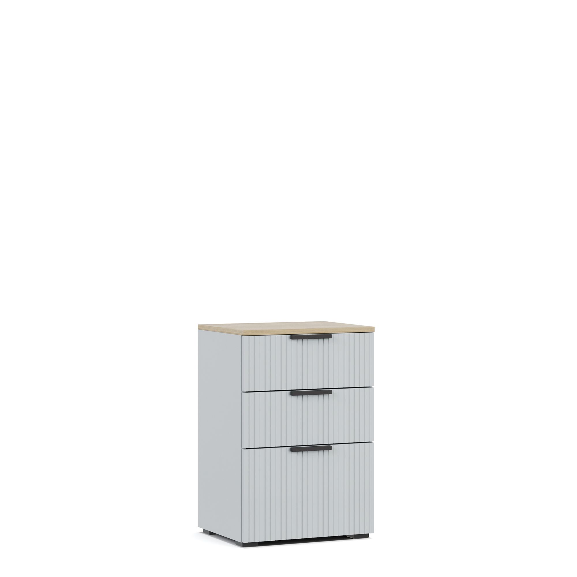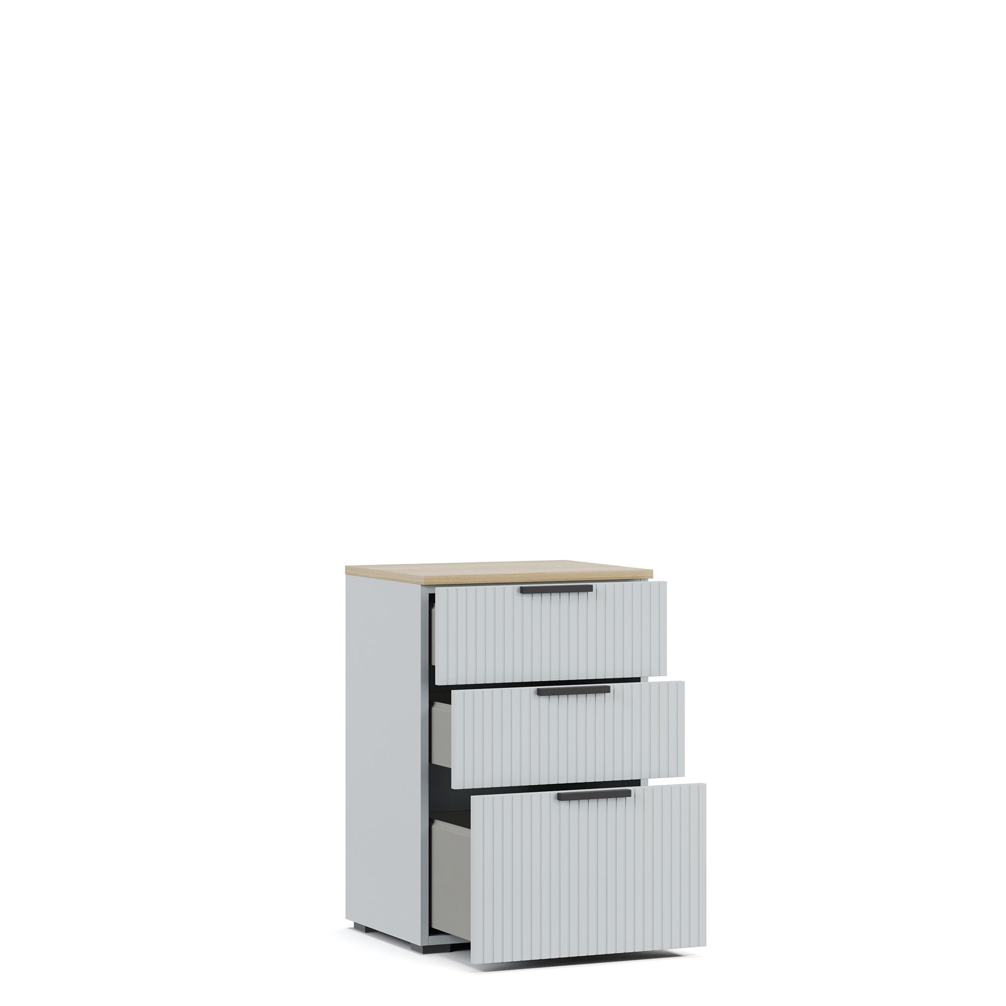 Прикроватная тумба NAPOLI с крышкой в отделке древесной текстурой (входит в комплектацию модели) оснащена тремя выдвижными ящиками, фасады которых декорированы вертикальной фрезеровкой. Внутренняя отделка ящиков выполнена в текстуре Шенилл. В качестве опции предлагается установка тумбы на опоры высотой 12 см (заказываются отдельно).