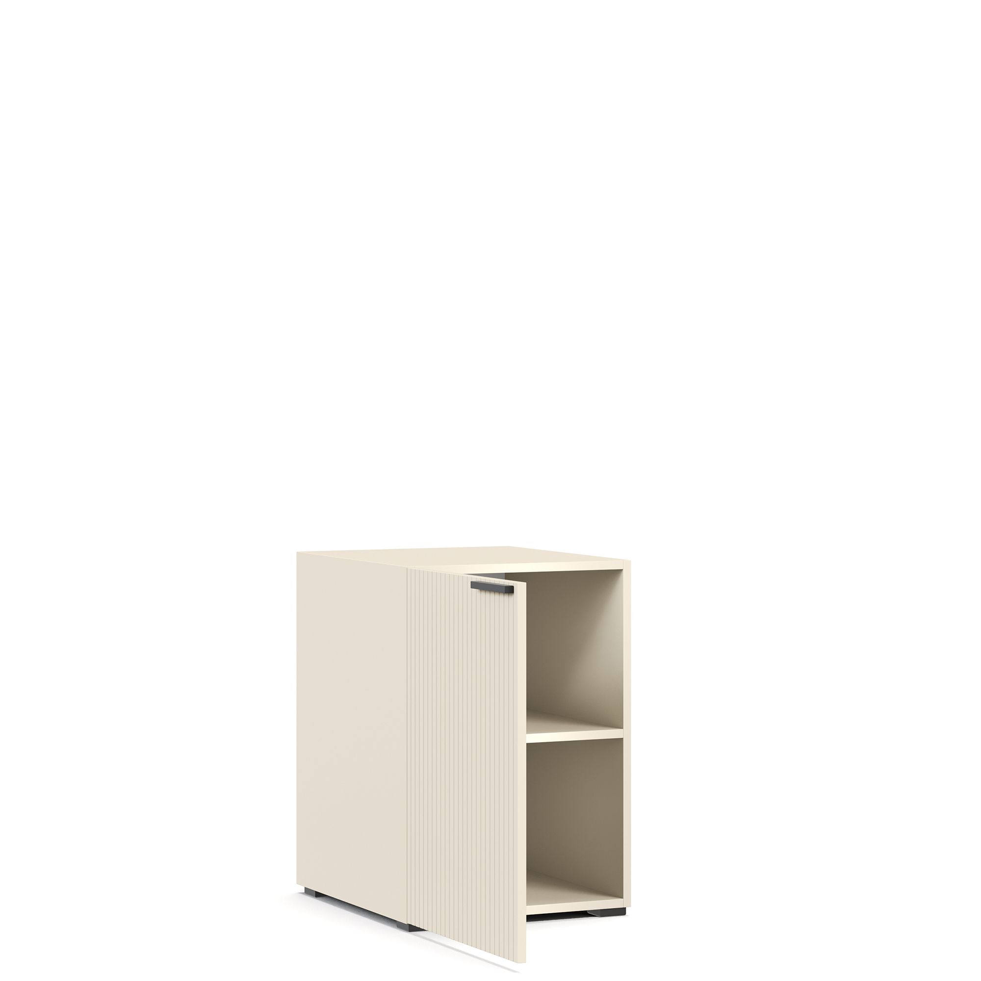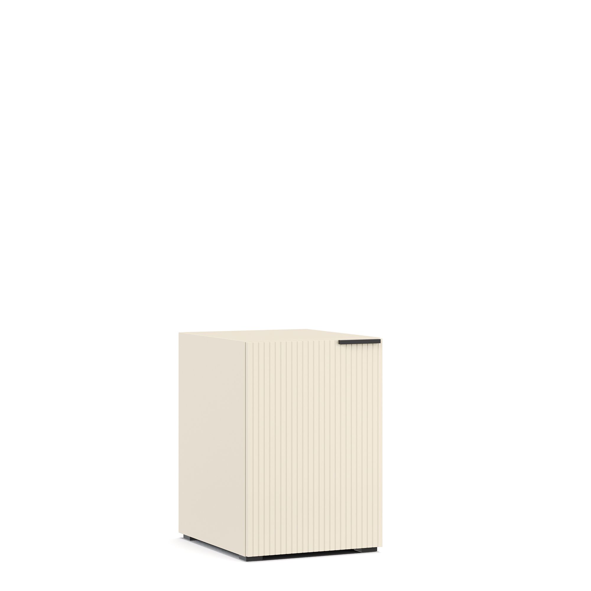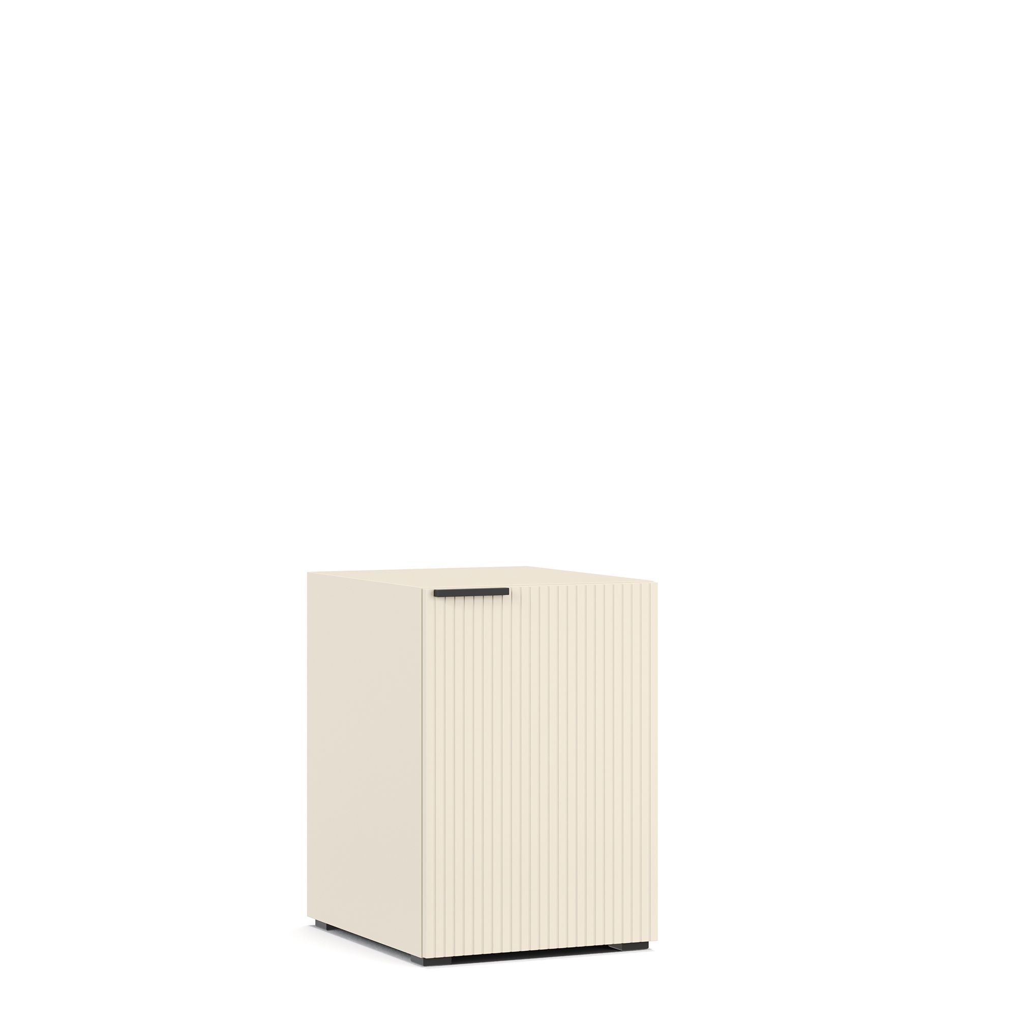 Тумба NAPOLI оснащена распашным фасадом, декорированным вертикальной фрезеровкой, за которым располагаются полки из ЛДСП. Возможно как левое, так и правое открывание фасада. В качестве опции предлагается возможность установки тумбы на опоры высотой 12 см (заказываются отдельно). В стоимость изделия включена крышка в древесной текстуре. Использование тумбы без этого элемента дизайном не предусмотрено.