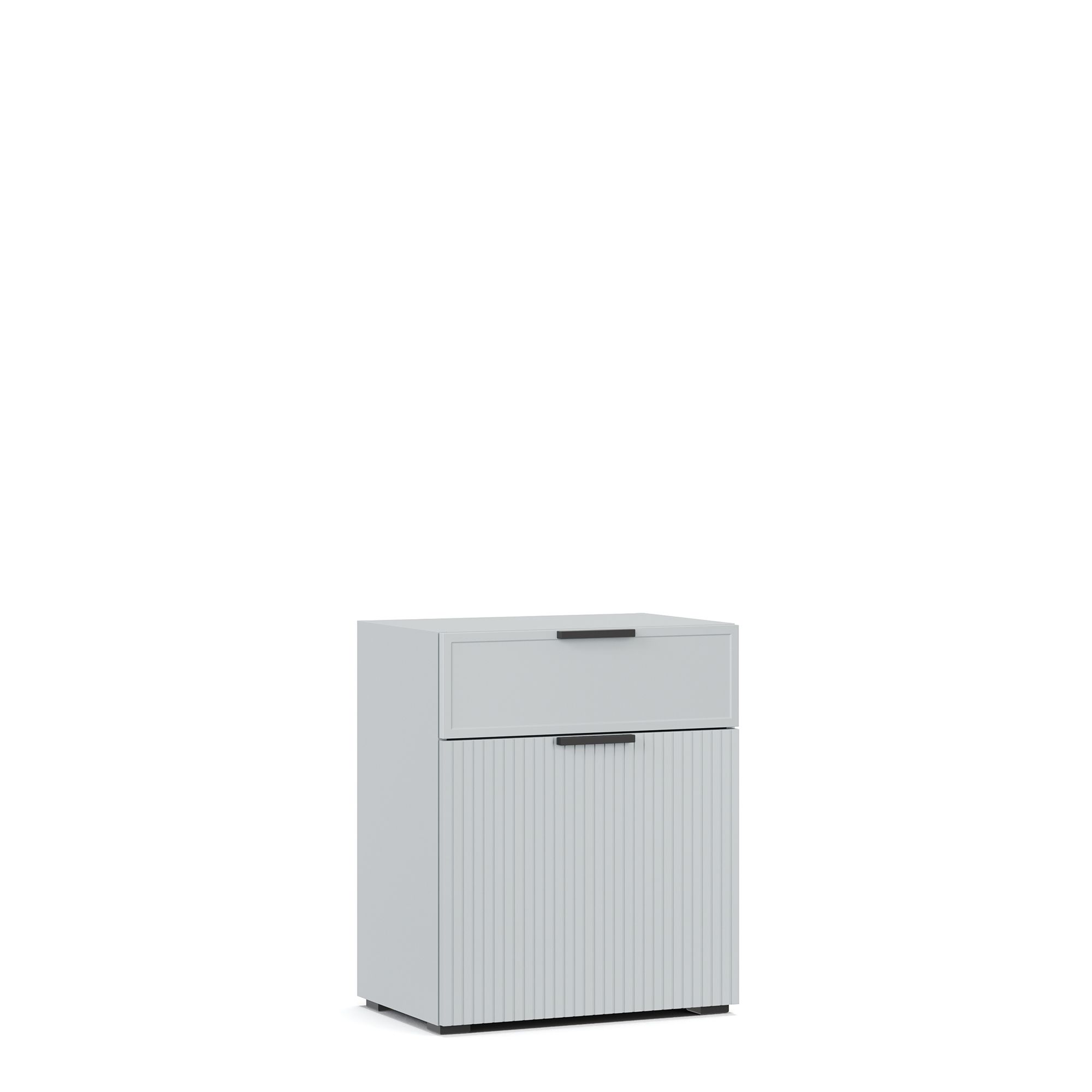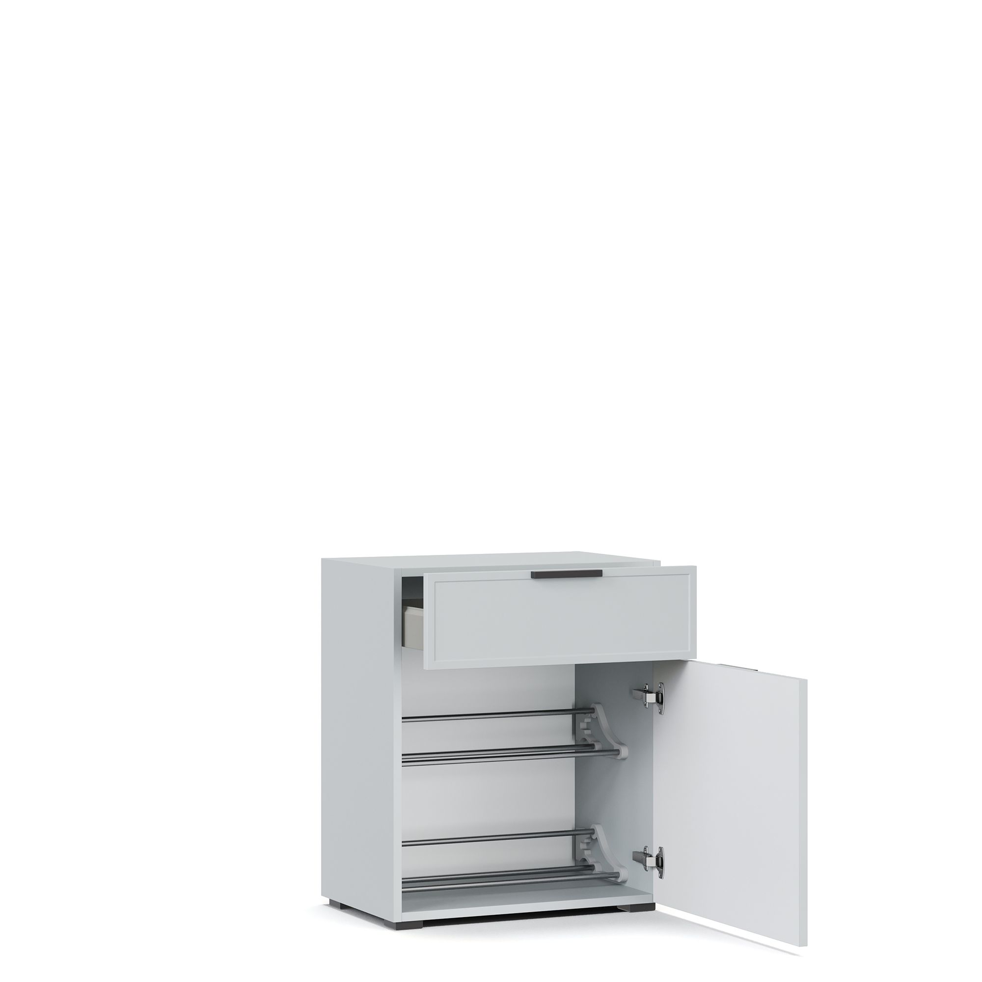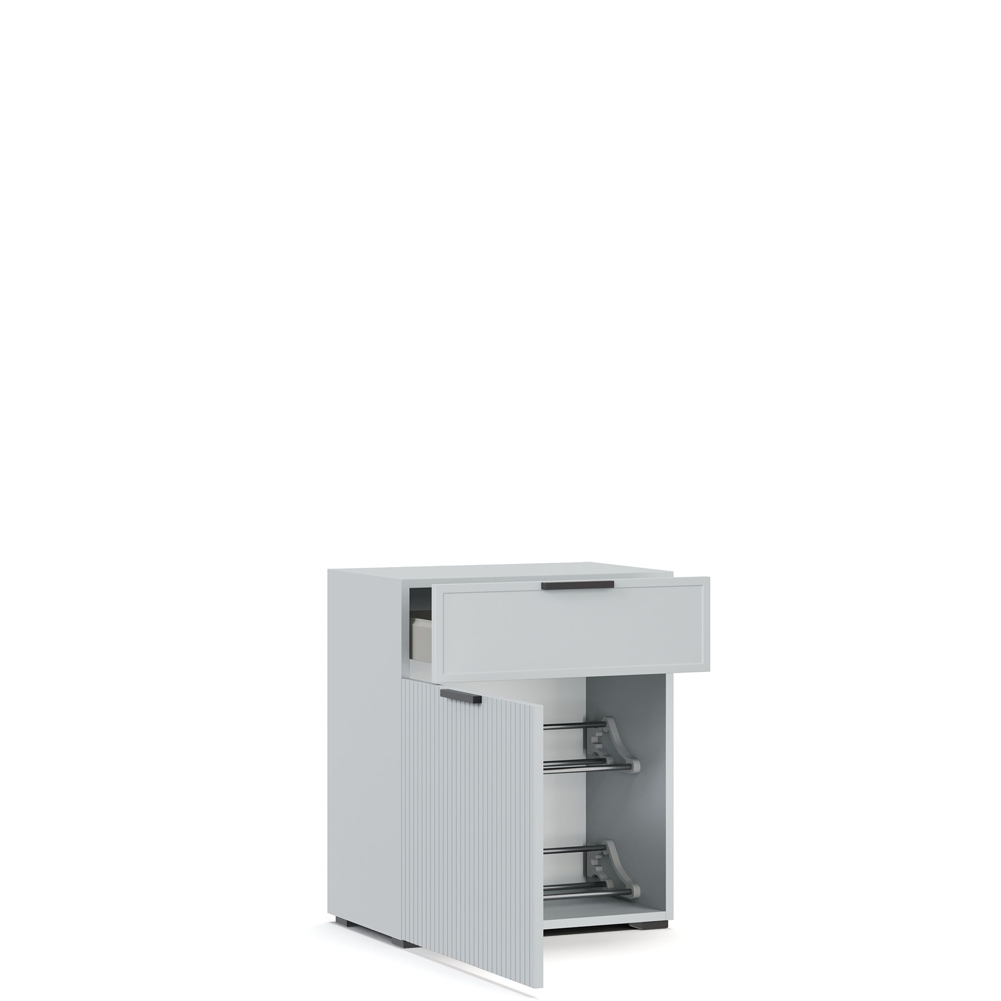 В верхней части тумбы NAPOLI располагается выдвижной ящик с фасадом в тонкой рамке. Внутренняя отделка ящика – текстура Шенилл. За распашным фасадом, декорированным вертикальной фрезеровкой, располагаются две металлических полки для обуви. Возможно открывание фасада как на правую, так и на левую сторону. В качестве опции предлагается возможность установки тумбы на опоры высотой 12 см (заказываются отдельно). В стоимость изделия включена крышка в тон фасадов (возможна замена на крышку в древесной текстуре). Использование тумбы без этого элемента дизайном не предусмотрено.