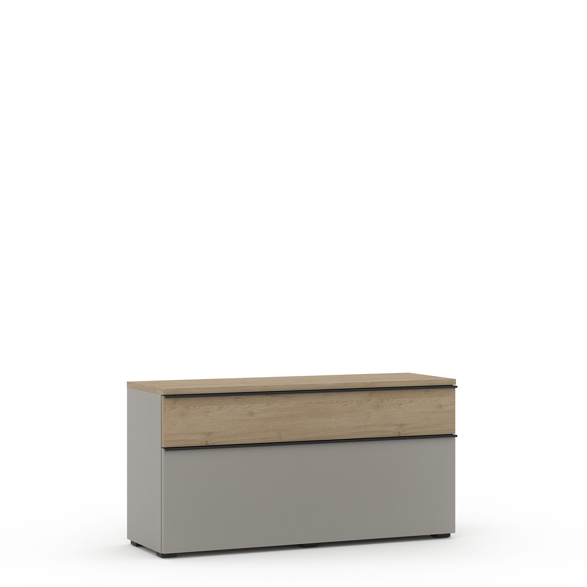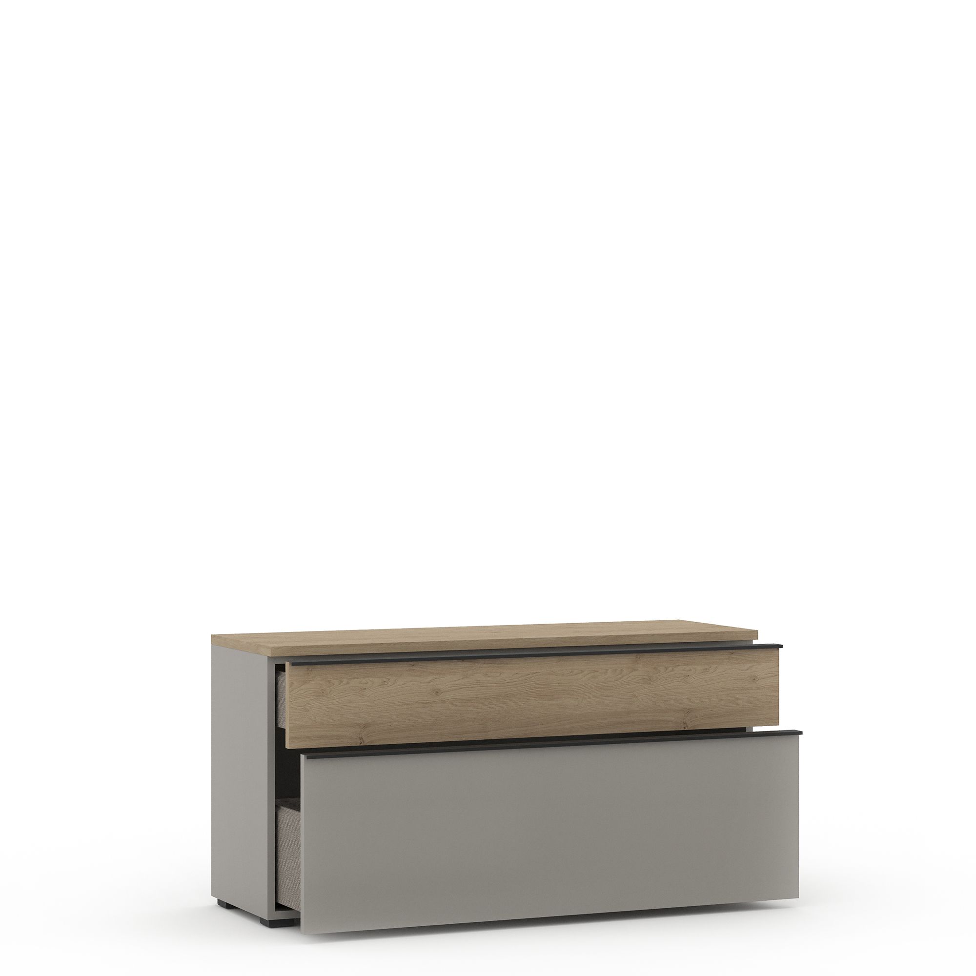 ТВ-тумба TERAMO с двумя выдвижными ящиками выполнена в сочетании древесной текстуры Дуб Кендал натуральный и монохромной отделки. Накладные ручки из алюминия с черным матовым покрытием входят в комплектацию.