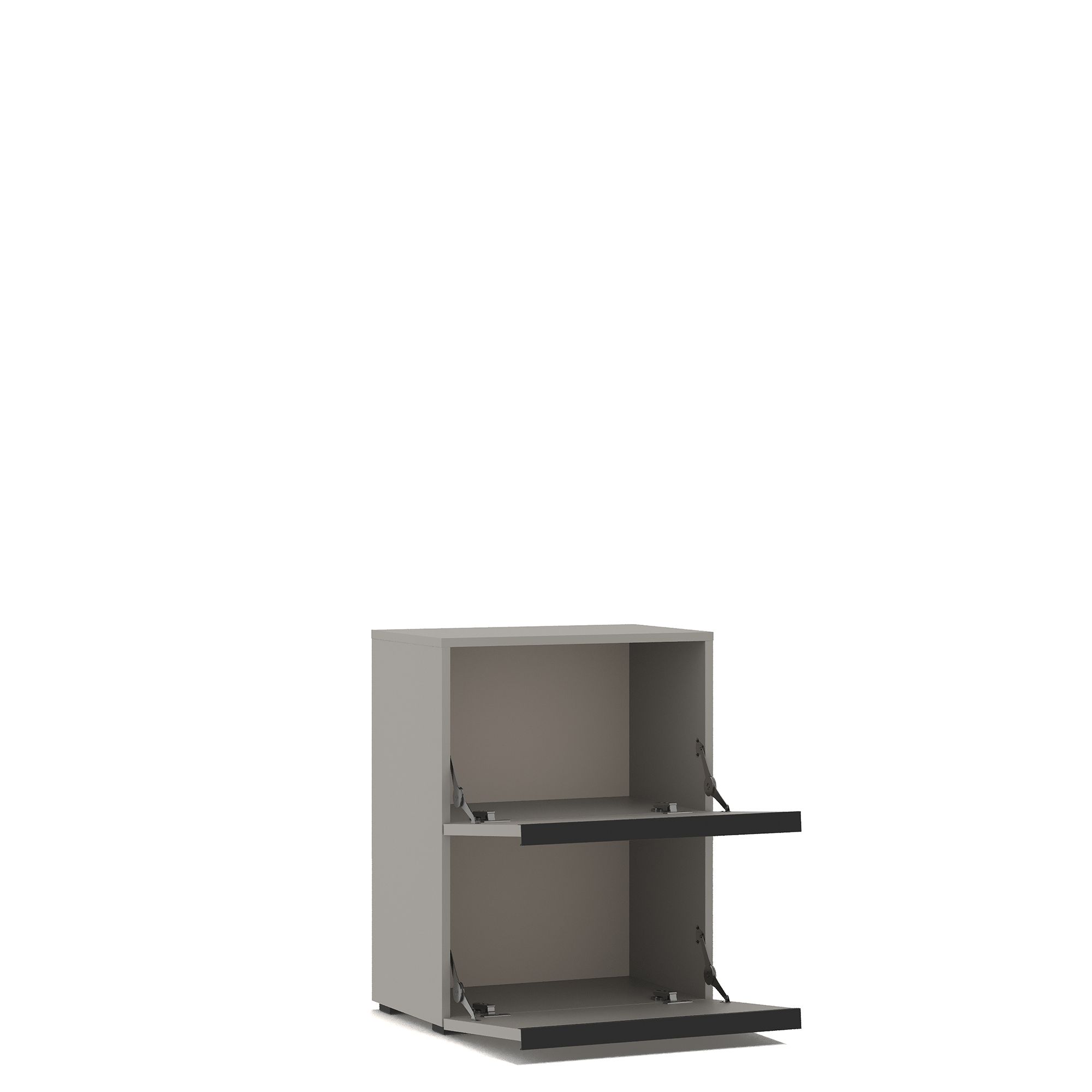 Обувная тумба ТЕРАМО / TERAMO оснащена двумя монохромными откидными фасадами (открывание вниз). Возможно оборудование тумбы металлическими полками для обуви (заказываются отдельно).