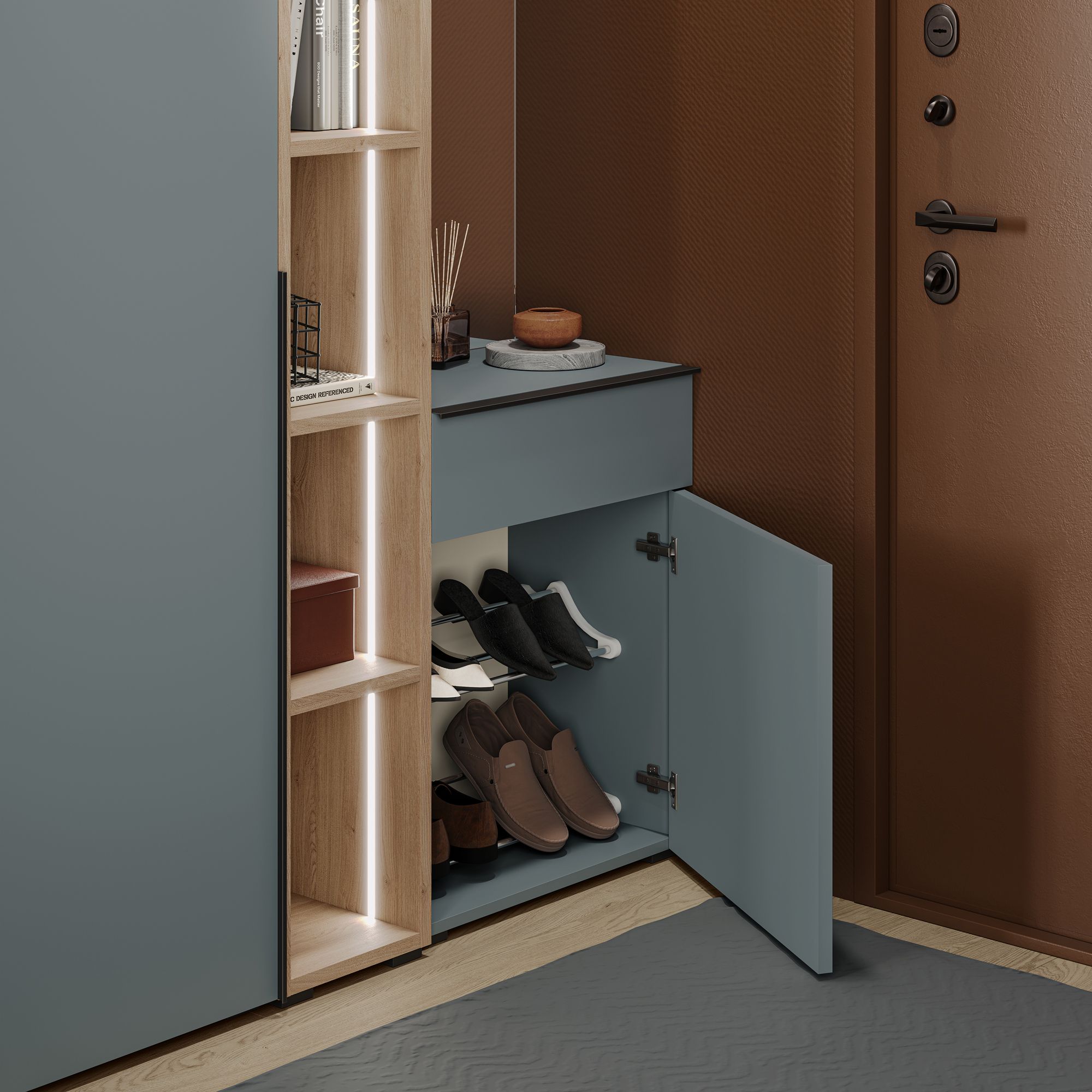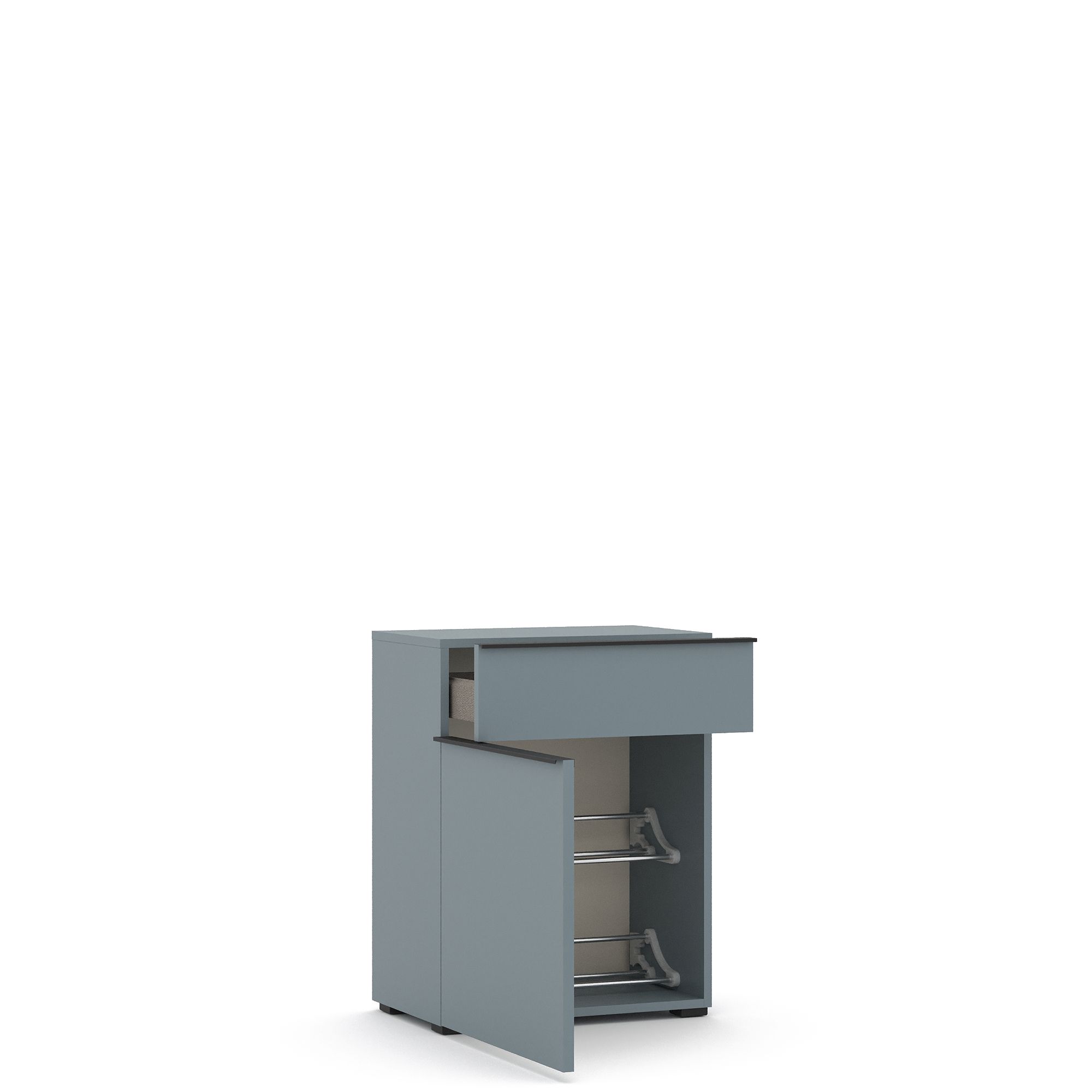 Обувная тумба TERAMO оснащена выдвижным ящиком и распашным фасадом с системой открывания Push (возможно как правое, так и левое открывание). Внутреннее наполнение тумбы представляет собой две металлические полки для обуви.