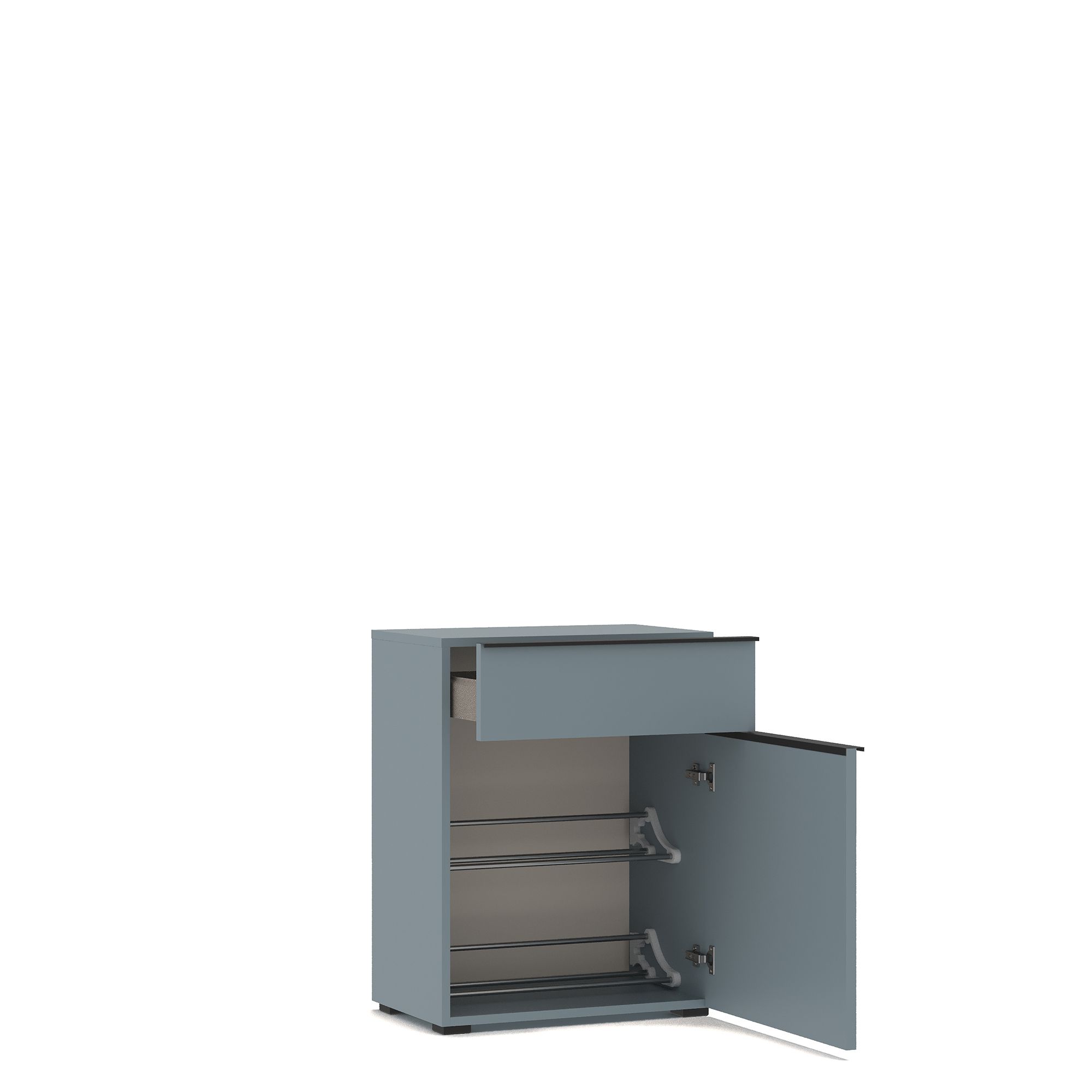 Обувная тумба ТЕРАМО / TERAMO оснащена выдвижным ящиком и распашным фасадом с системой открывания Push (возможно как правое, так и левое открывание). Внутреннее наполнение тумбы представляет собой две металлические полки для обуви.