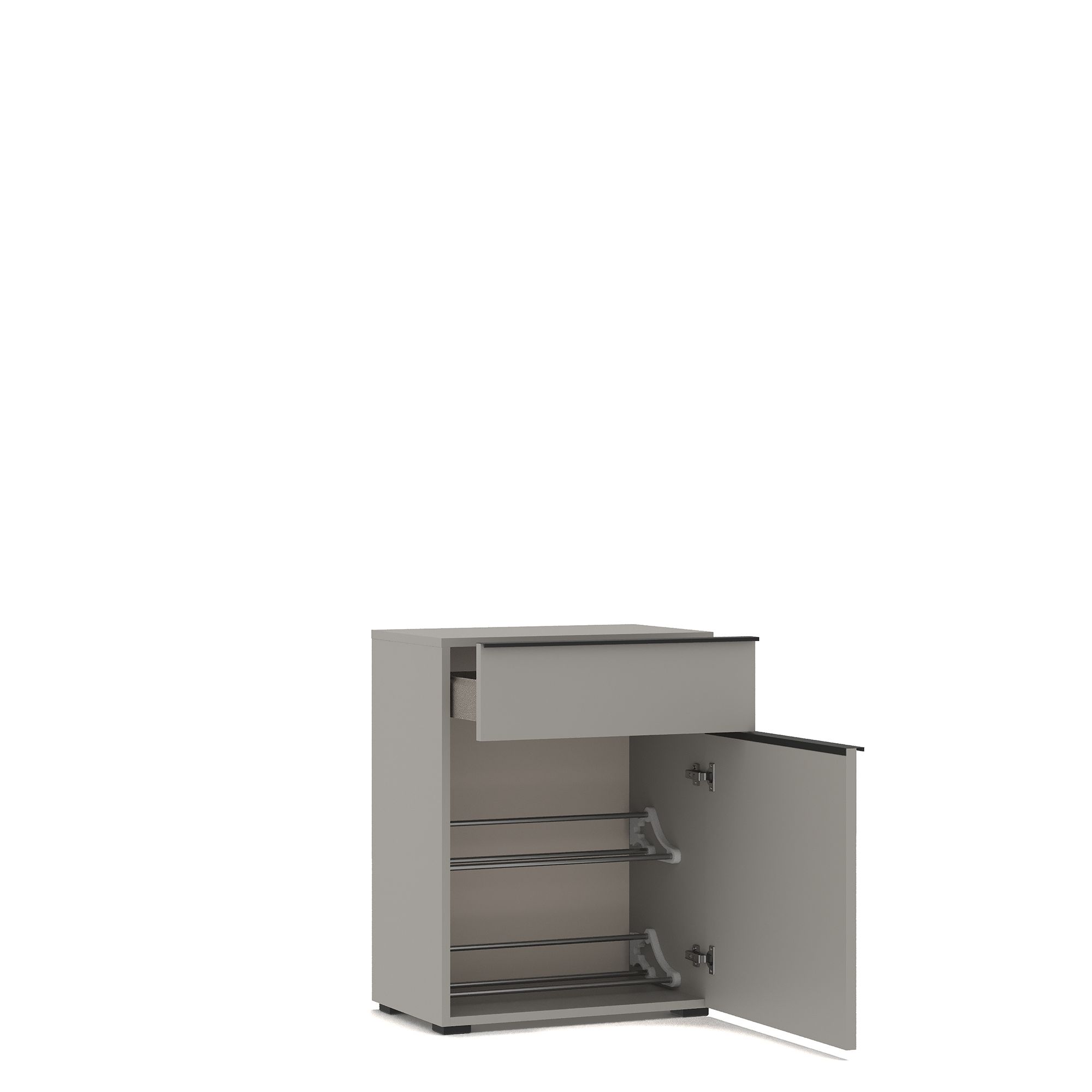 Обувная тумба ТЕРАМО / TERAMO оснащена выдвижным ящиком и распашным фасадом с системой открывания Push (возможно как правое, так и левое открывание). Внутреннее наполнение тумбы представляет собой две металлические полки для обуви.