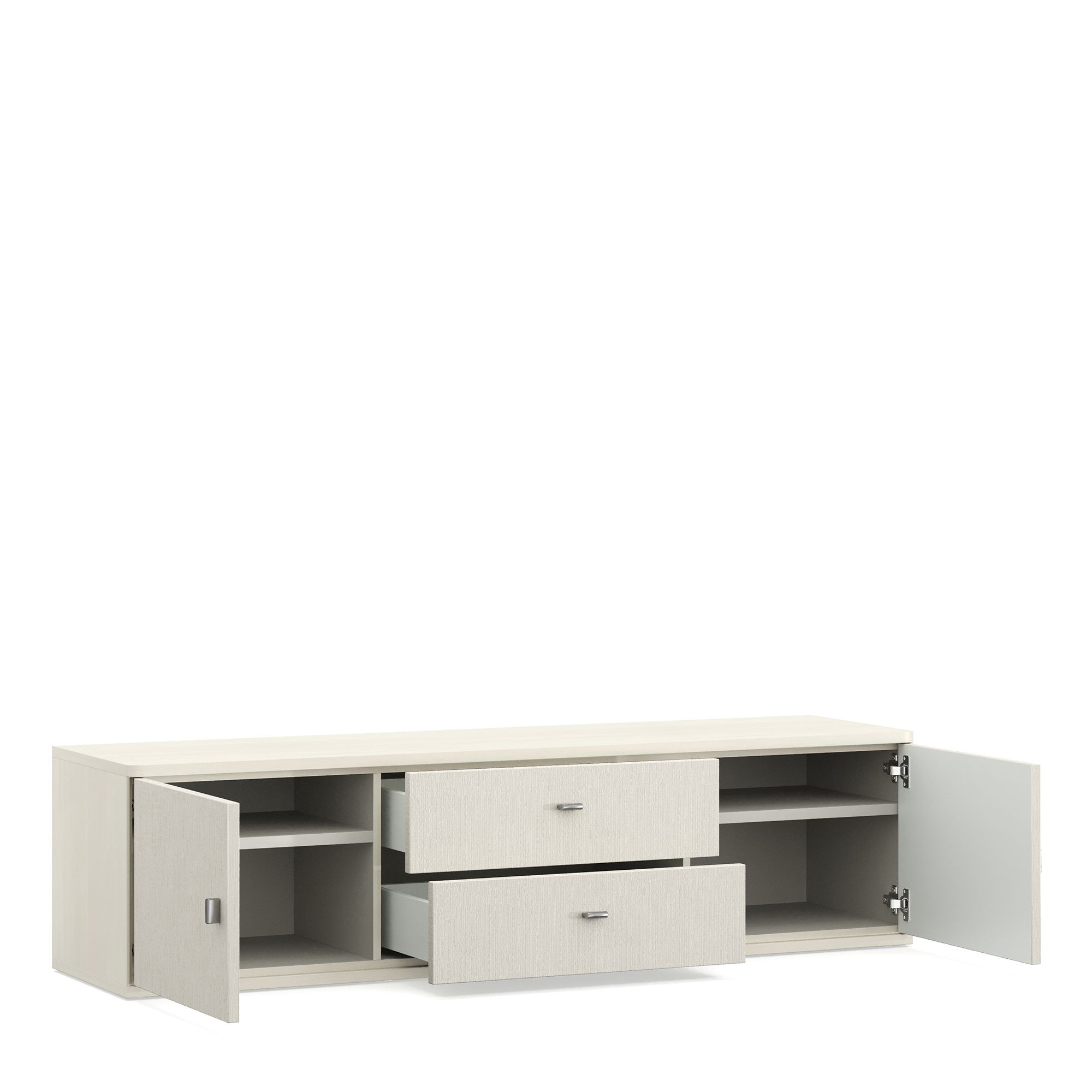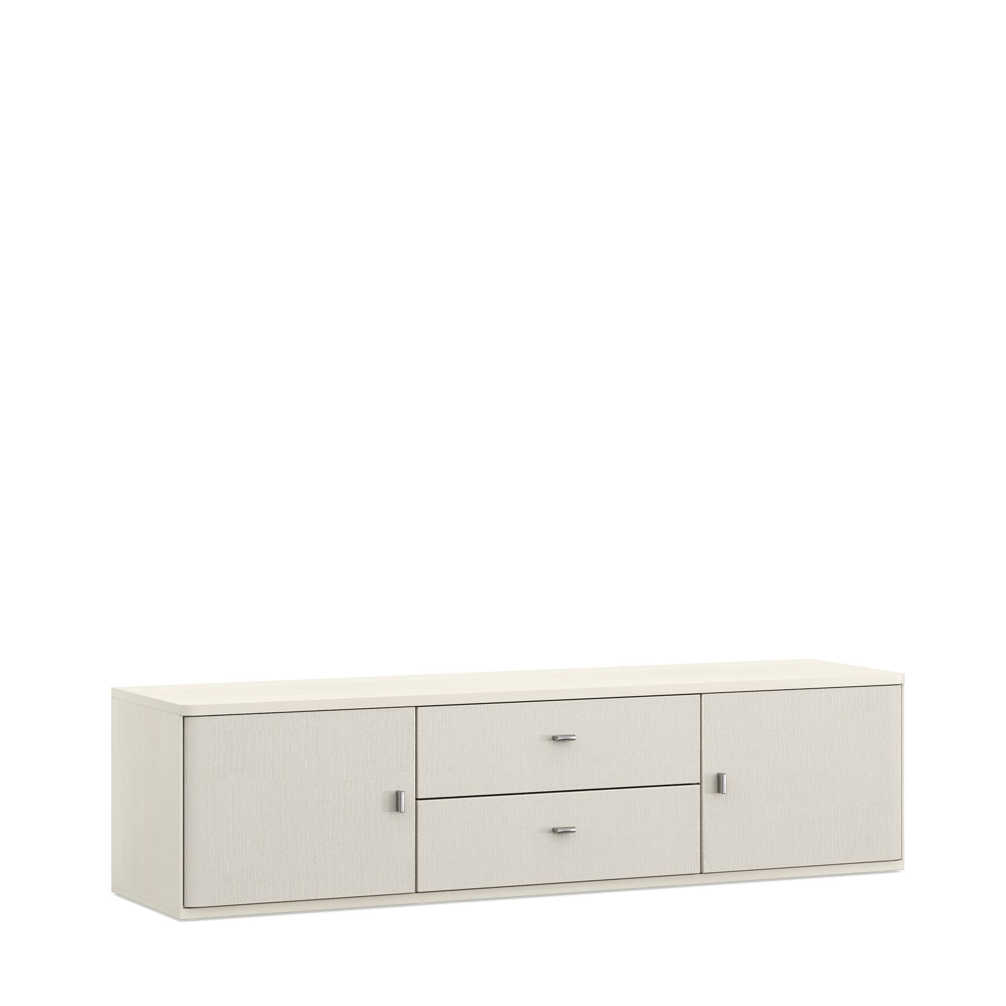 ТВ-тумба ELEGANTE в комбинации текстур Вяз Светлый и Tela оснащена двумя выдвижными ящиками и двумя отделениями с распашными фасадами. Конструкция модели предусматривает как напольное, так и навесное размещение. Максимально допустимая распределенная нагрузка на изделие – 20 кг.