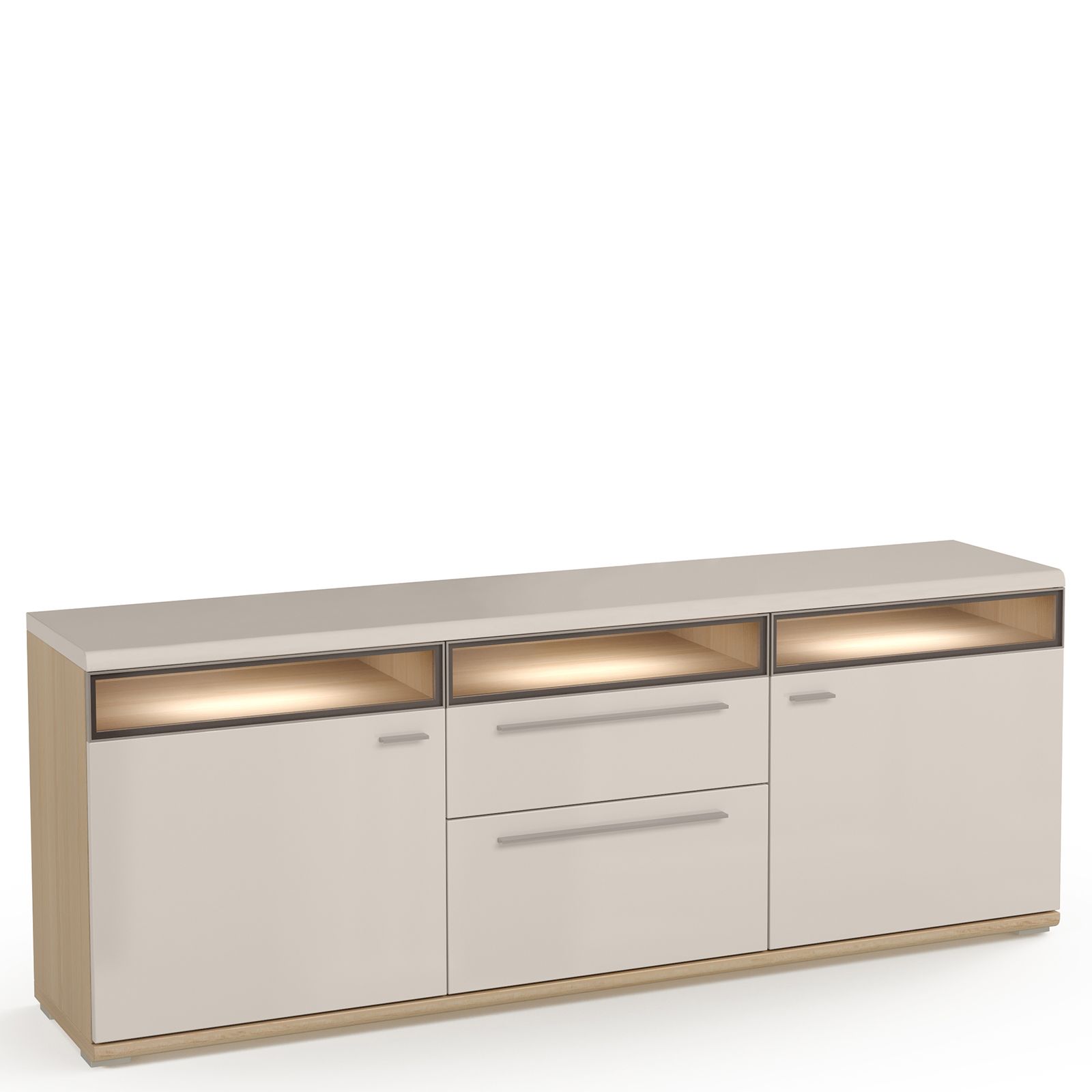ТВ-тумба ESTE оснащена двумя выдвижными ящиками и двумя распашными фасадами. За ставками с тонированным стеклом расположена система подсветки (система включения подсветки и удлинители заказываются отдельно).