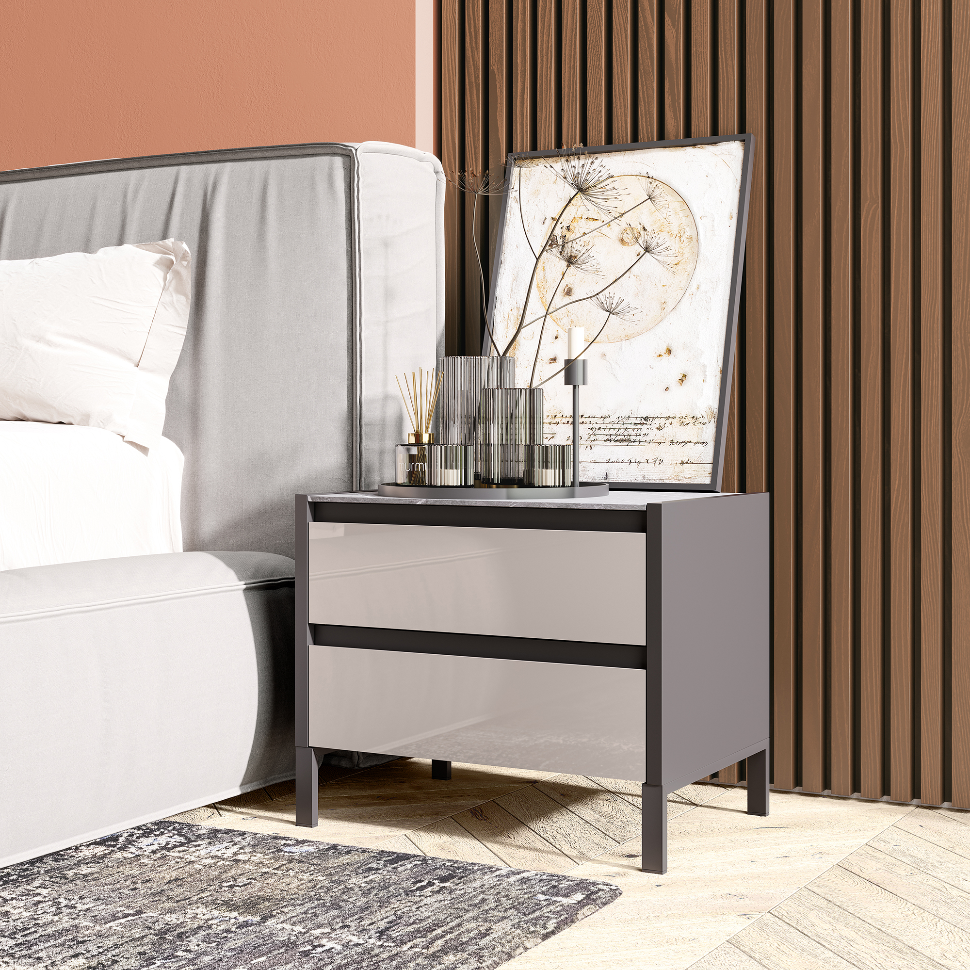 Прикроватная тумба BRUNO оснащена двумя выдвижными ящиками с эргономичной J-ручкой. Внутренняя отделка в текстуре Шенилл создает ощущение, что ящики застелены натуральной тканью. Верхняя крышка тумбы декорирована текстурой Мрамор Patagonia. Модель оснащается низкими регулируемыми опорами из пластика либо высокими опорами из металла в черной матовой отделке на выбор (в стоимость изделия не входят). ВАЖНО! Высота изделия указана без учета опор (опоры высотой 1,8 см или 11,5 см заказываются отдельно). * Внешний вид реальных изделий может незначительно отличаться от представленных на сайте. В частности, допустимо смещение рисунков древесной текстуры относительно друг друга.