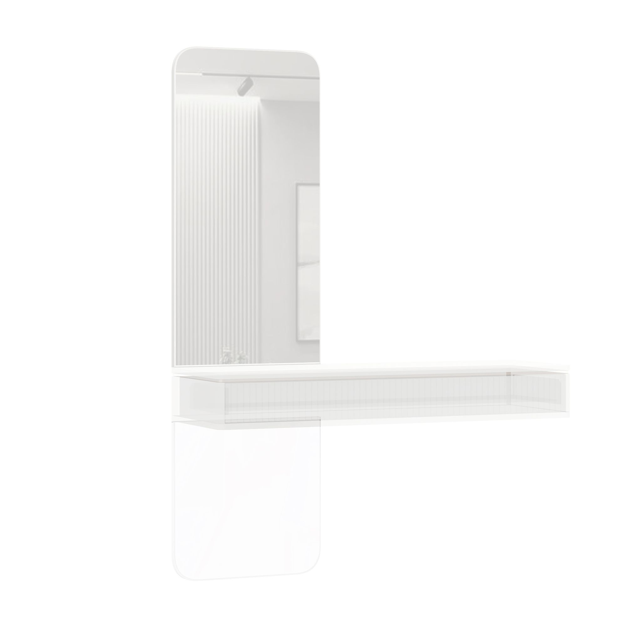 Зеркало со скругленными углами состоит из двух частей. В зависимости от интерьерной задачи, их можно использовать совместно или по отдельности, а также в комбинации с другими элементами. Например, с навесным столом-консолью, который визуально делит зеркальное полотно на две части.