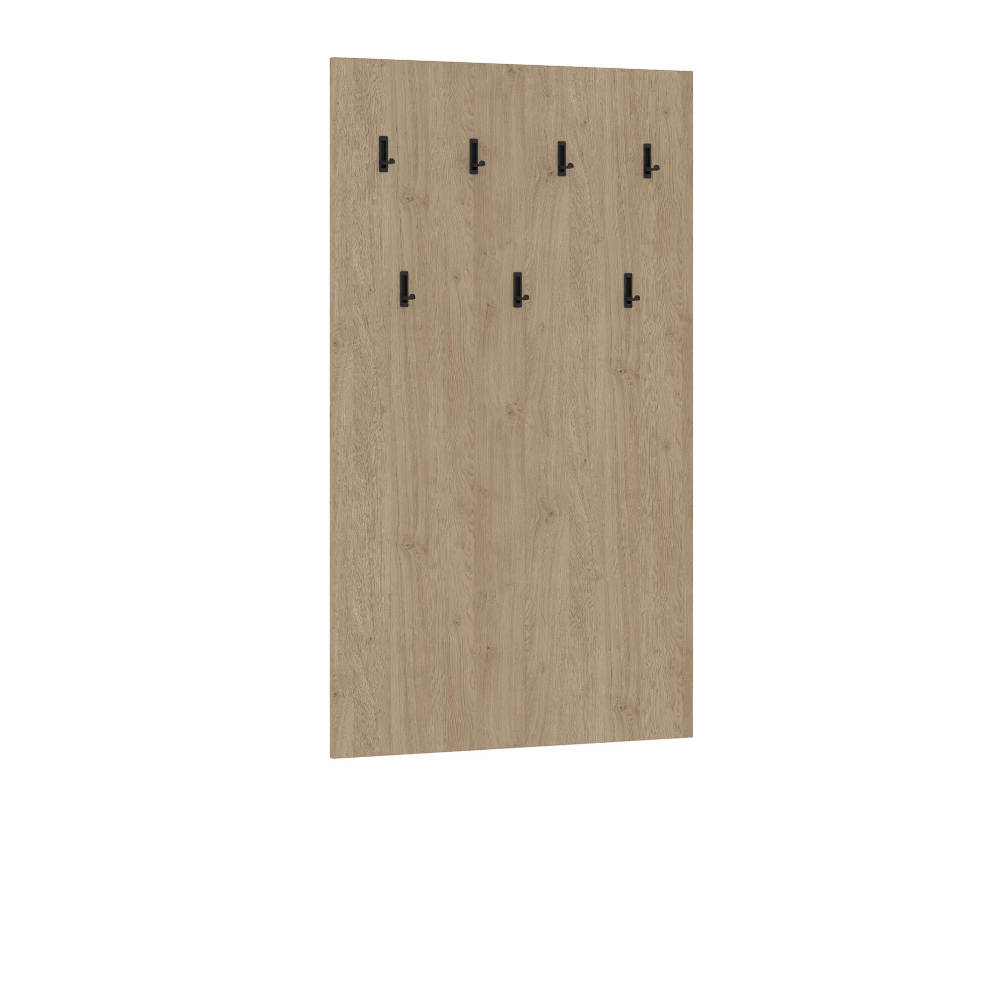 Система открытого хранения TERAMO представляет собой панель в отделке древесной текстурой Дуб Кендал, оборудованную семью откидными крючками для верхней одежды, головных уборов и аксессуаров.
