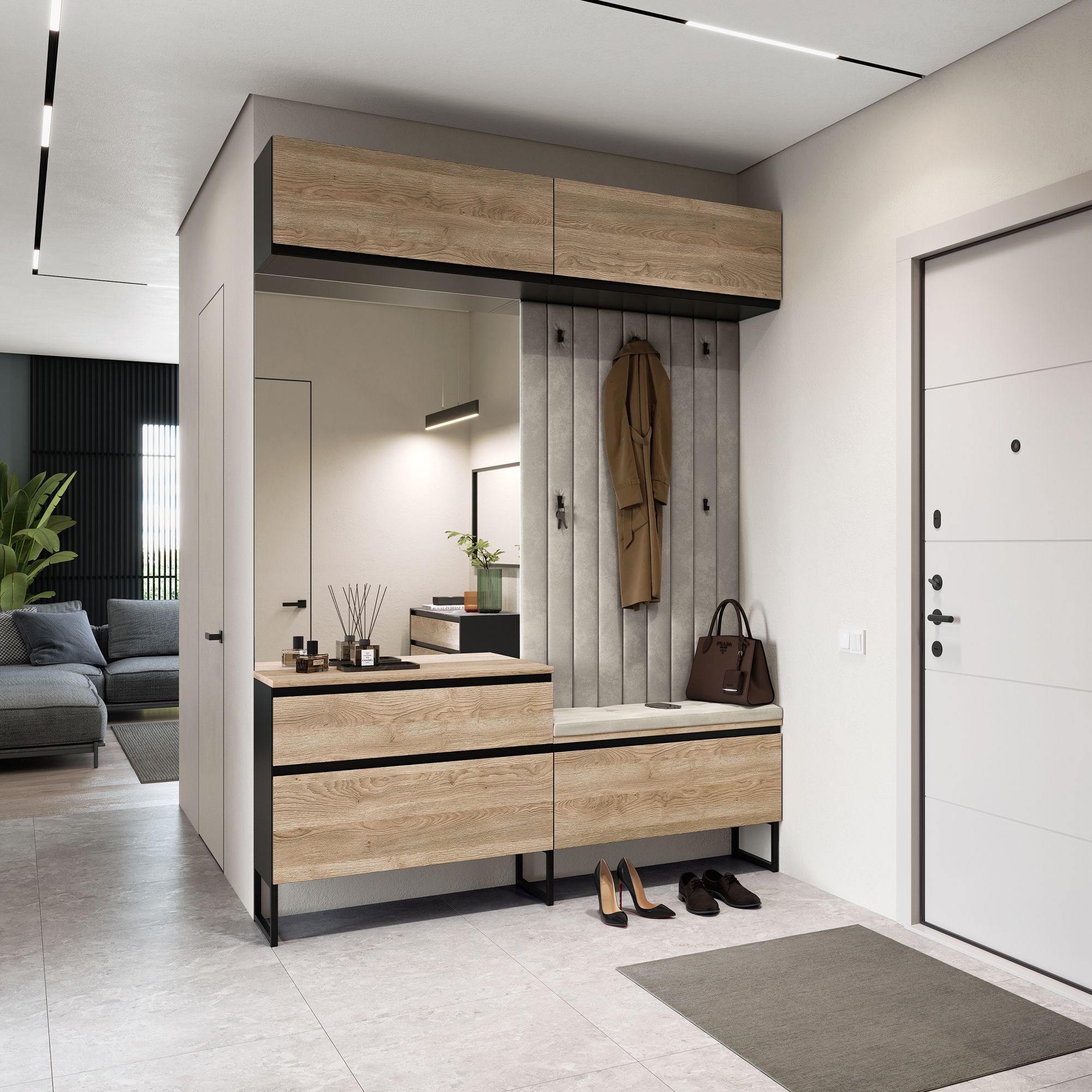 Мягкая настенная панель, выполненная в отделке велюром, делает интерьер прихожей особенно уютным. Ткань обладает приятными тактильными свойствами, повышенной износостойкостью и плотностью. Исполнение «антикоготь» оценят владельцы домашних питомцев.
