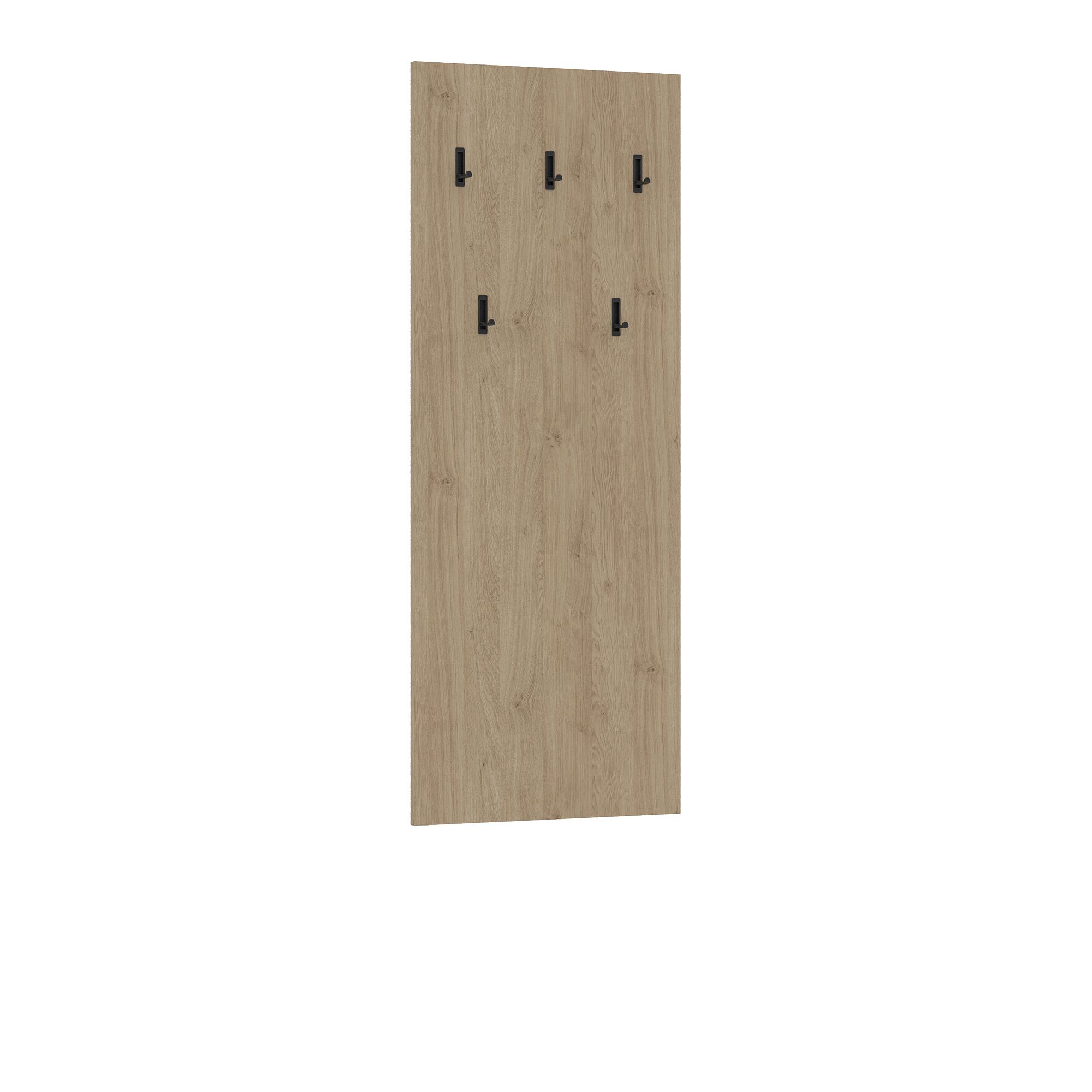 Система открытого хранения TERAMO представляет собой панель в отделке древесной текстурой Дуб Кендал, оборудованную пятью откидными крючками для верхней одежды, головных уборов и аксессуаров.