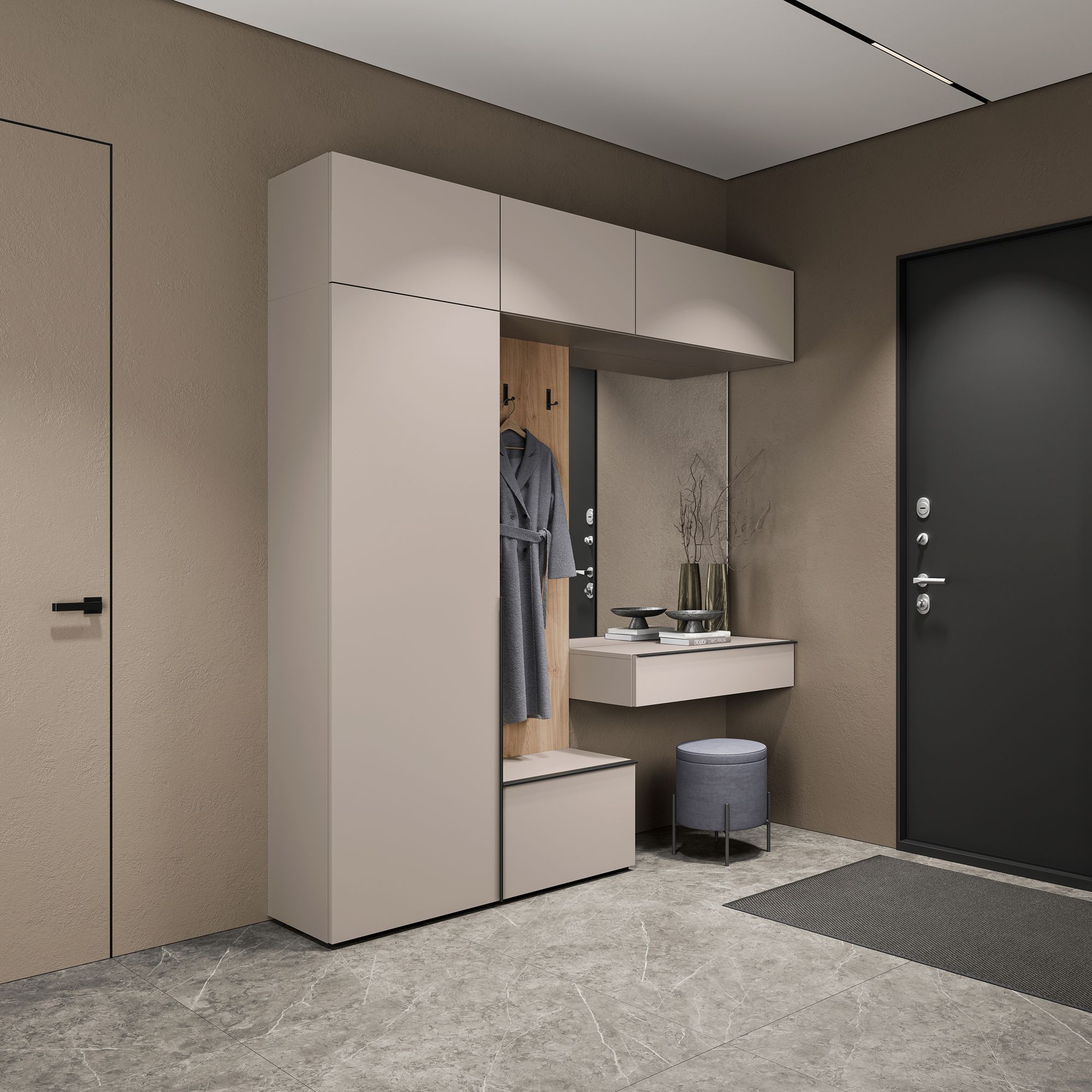 Вешалка в прихожей оснащена врезными откидными крючками для верхней одежды, головных уборов и аксессуаров.