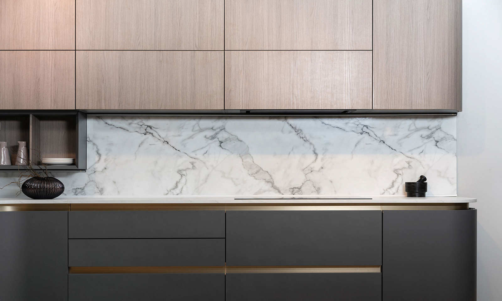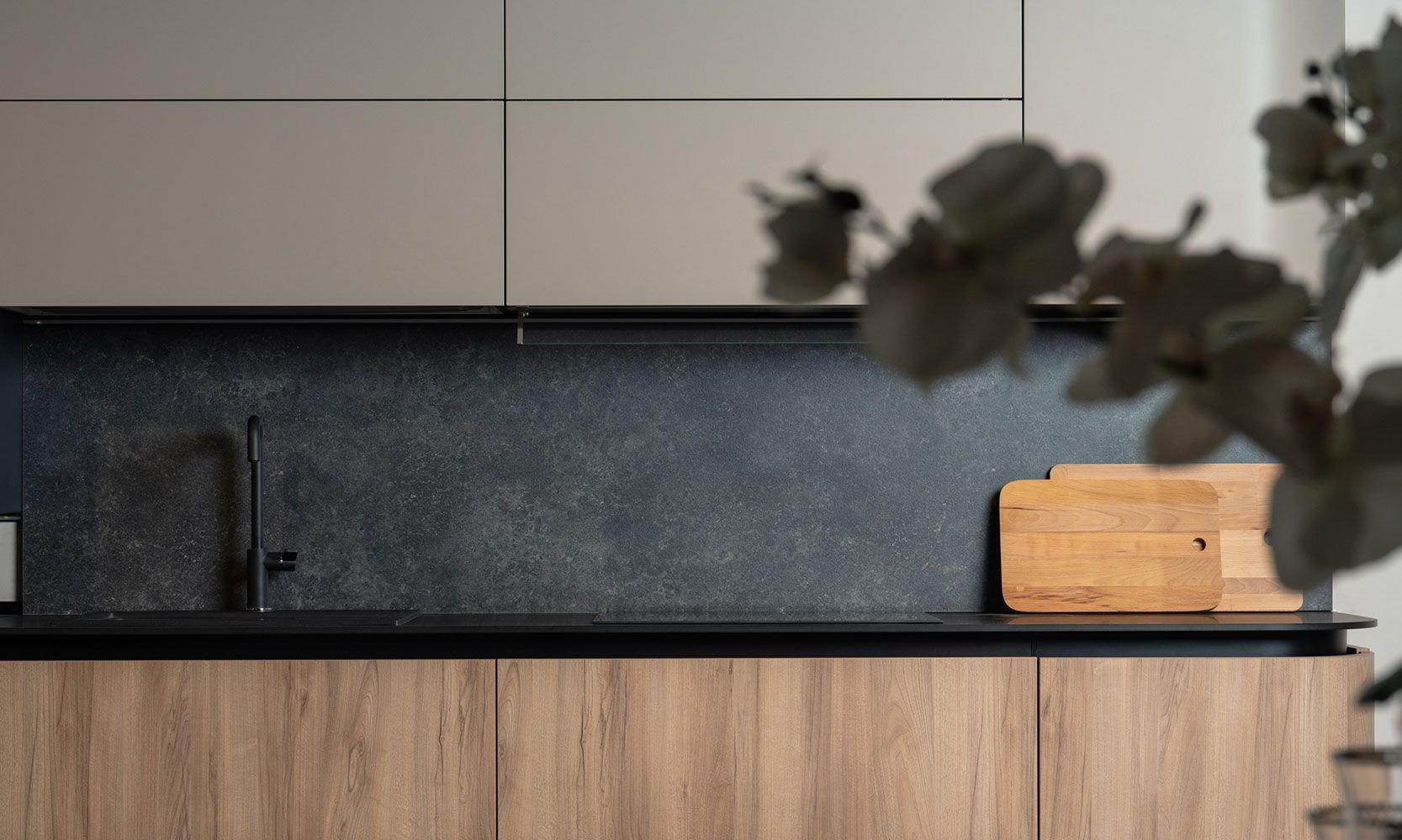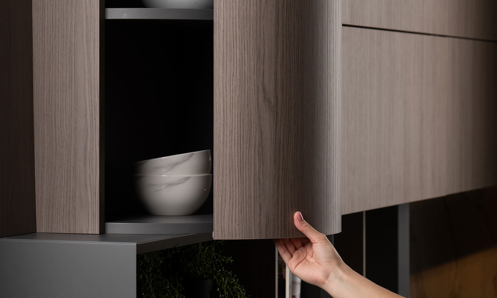Древесные текстуры матового пластика с эффектом soft touch по тактильным характеристикам неотличимы от натурального шпона, но устойчивы к перепадам влажности и температур, что важно для кухни. На таком материале не остается отпечатков пальцев. Это антивандальное покрытие, которое значительно превосходит пленку по прочностным характеристикам, устойчивости к выцветанию и механическим повреждениям.