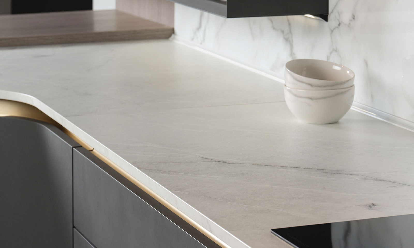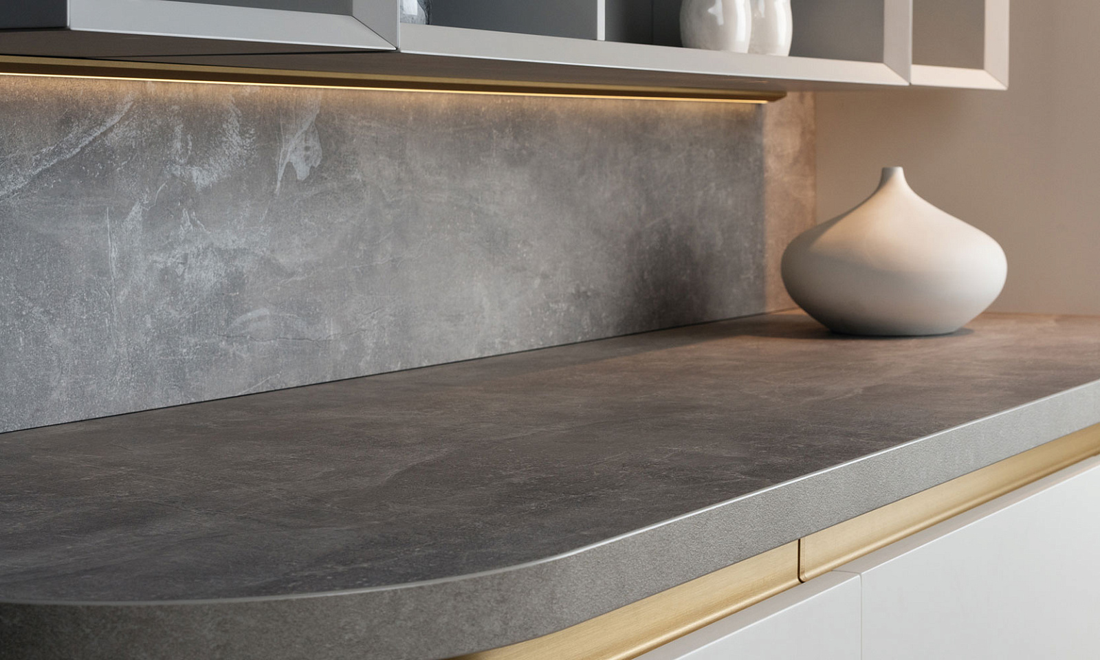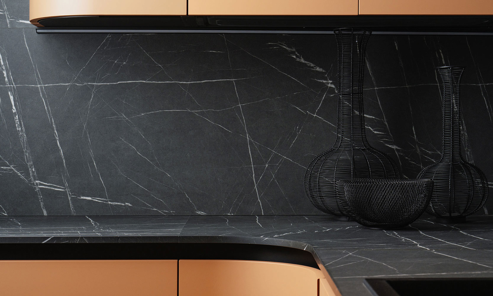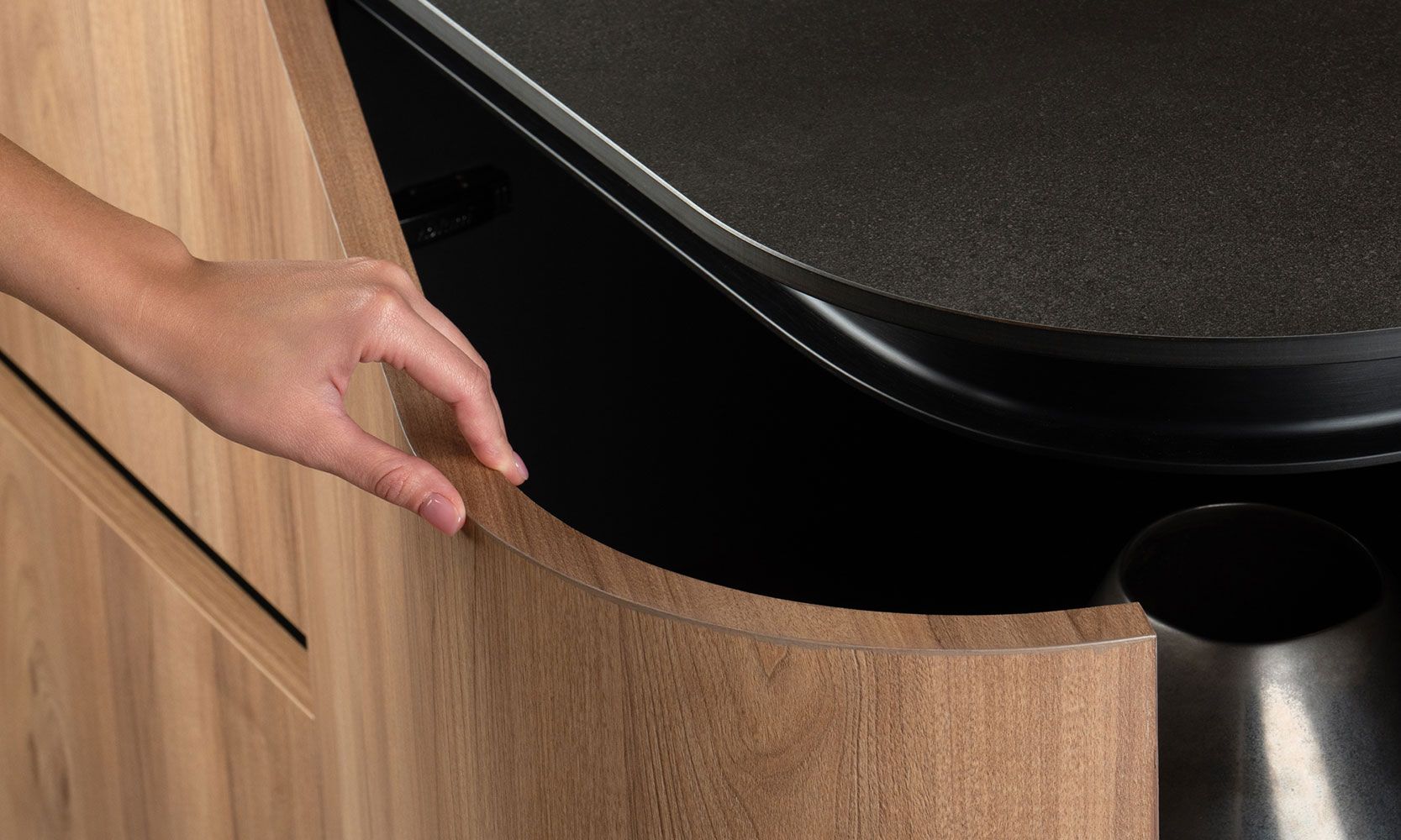 Древесные текстуры матового пластика с эффектом soft touch по тактильным характеристикам неотличимы от натурального шпона, но устойчивы к перепадам влажности и температур, что важно для кухни. На таком материале не остается отпечатков пальцев. Это антивандальное покрытие, которое значительно превосходит пленку по прочностным характеристикам, устойчивости к выцветанию и механическим повреждениям.
