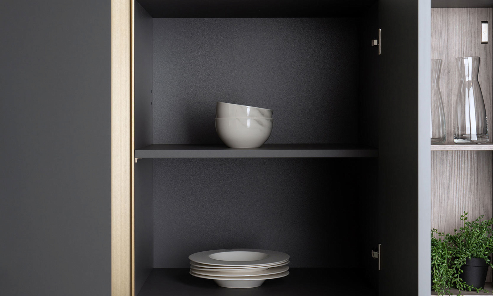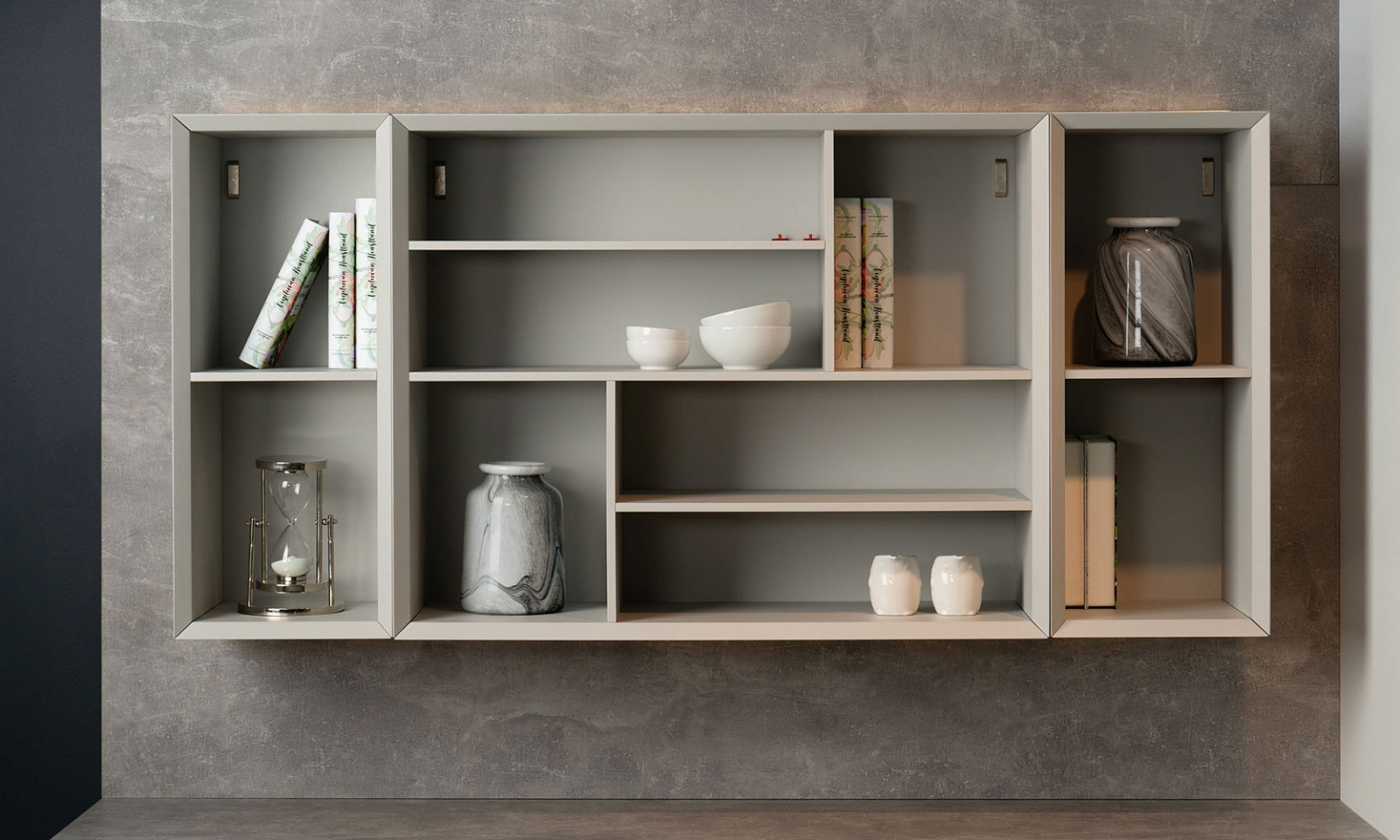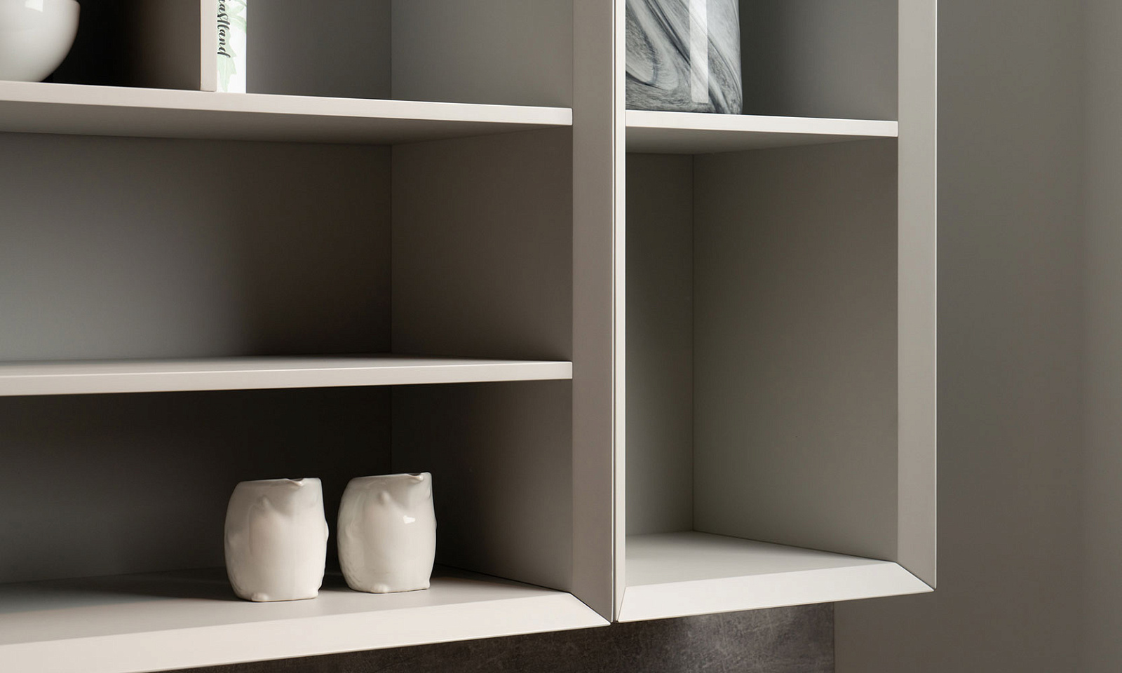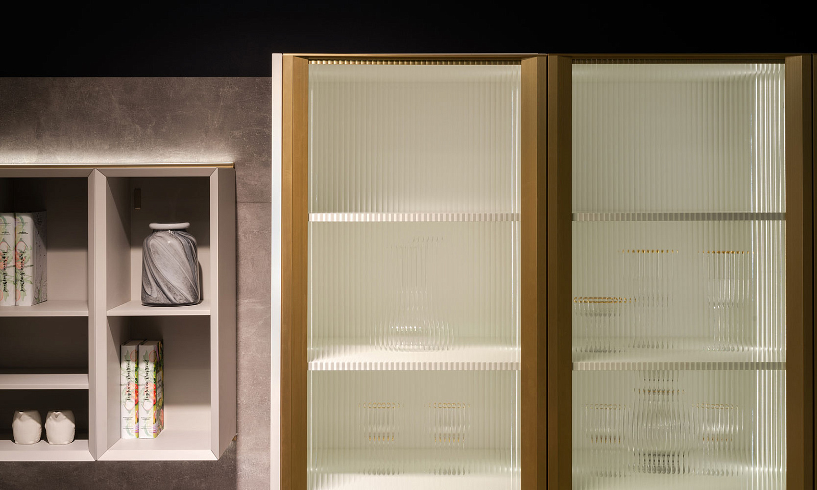 Элементы коллекции включают стеллажи и полки для создания плавного перехода между интерьерами кухни и гостиной. Дополнением служат открытые элементы в эмали контрастных оттенков или вставками в текстуре фасада.
