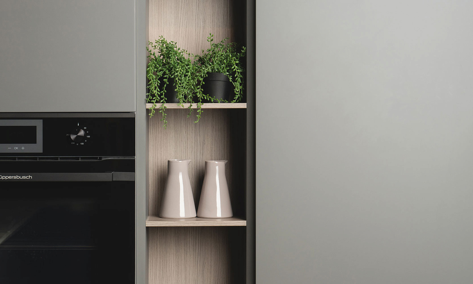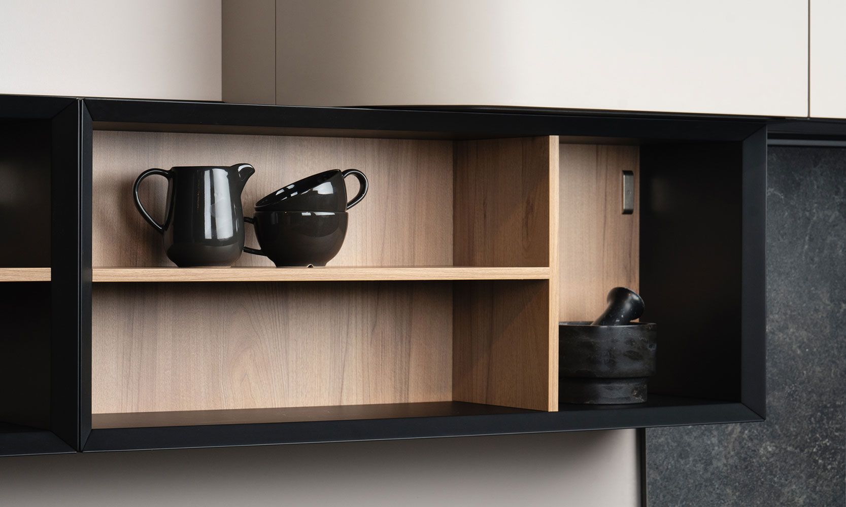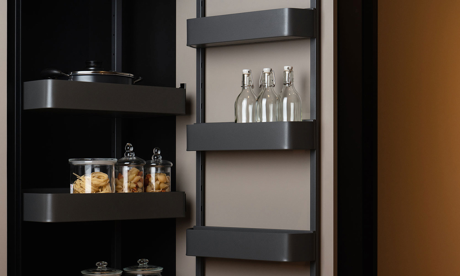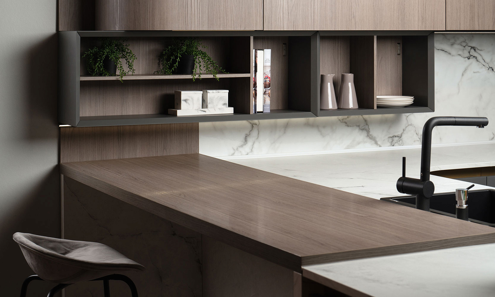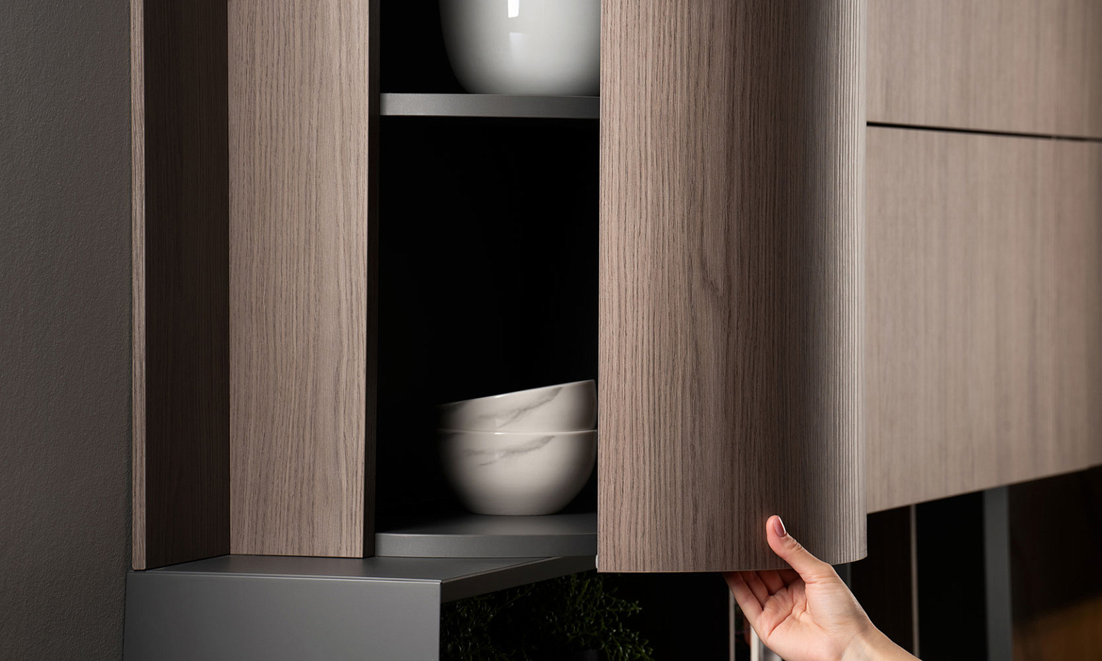 Элементы коллекции включают стеллажи и полки для создания плавного перехода между интерьерами кухни и гостиной. Дополнением служат открытые элементы в эмали контрастных оттенков или вставками в текстуре фасада.