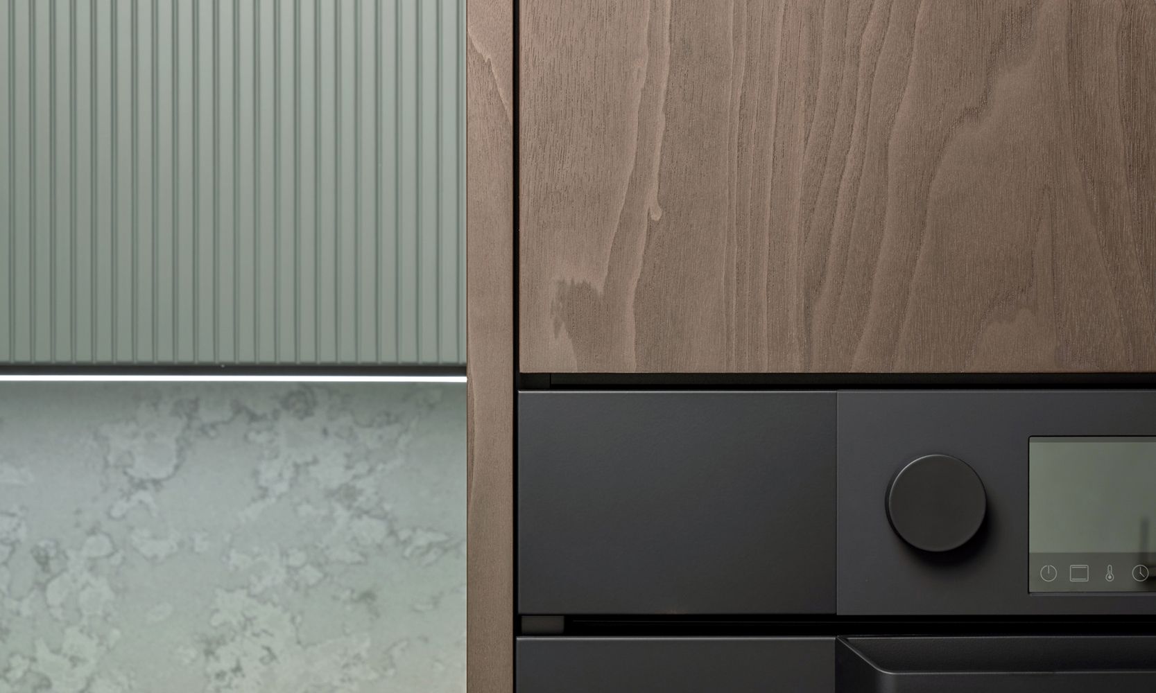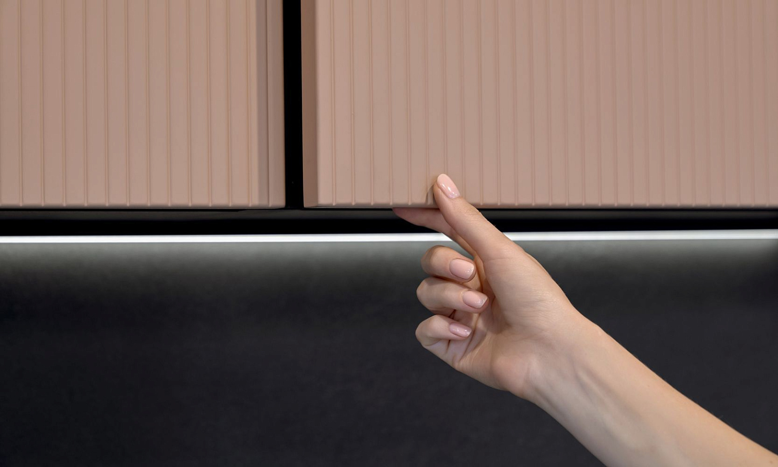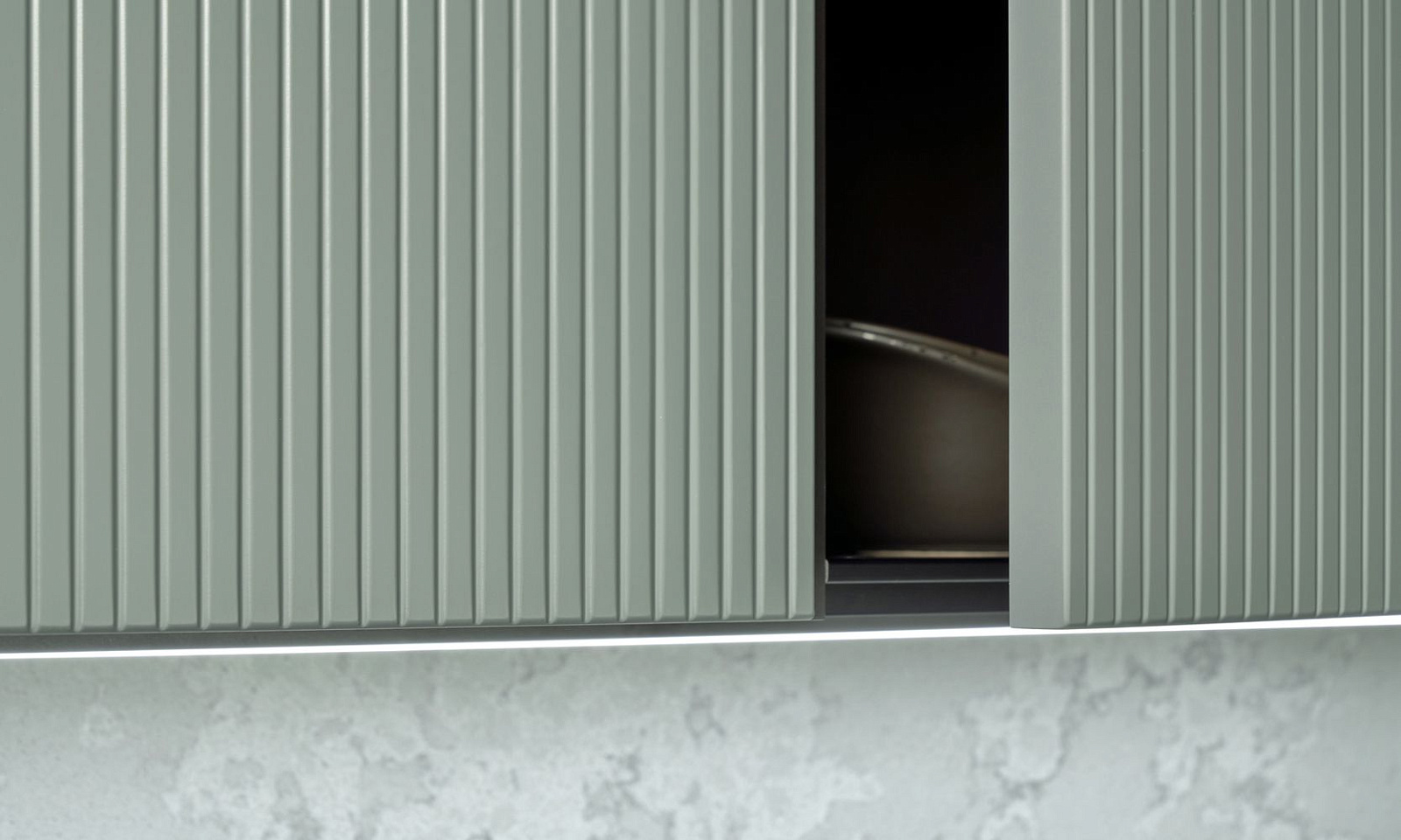 Фасады с отделкой матовой эмалью и вертикальной фрезеровкой Line очень приятны на ощупь. А еще – экологичны, влагоустойчивы и обладают высокой механической прочностью.