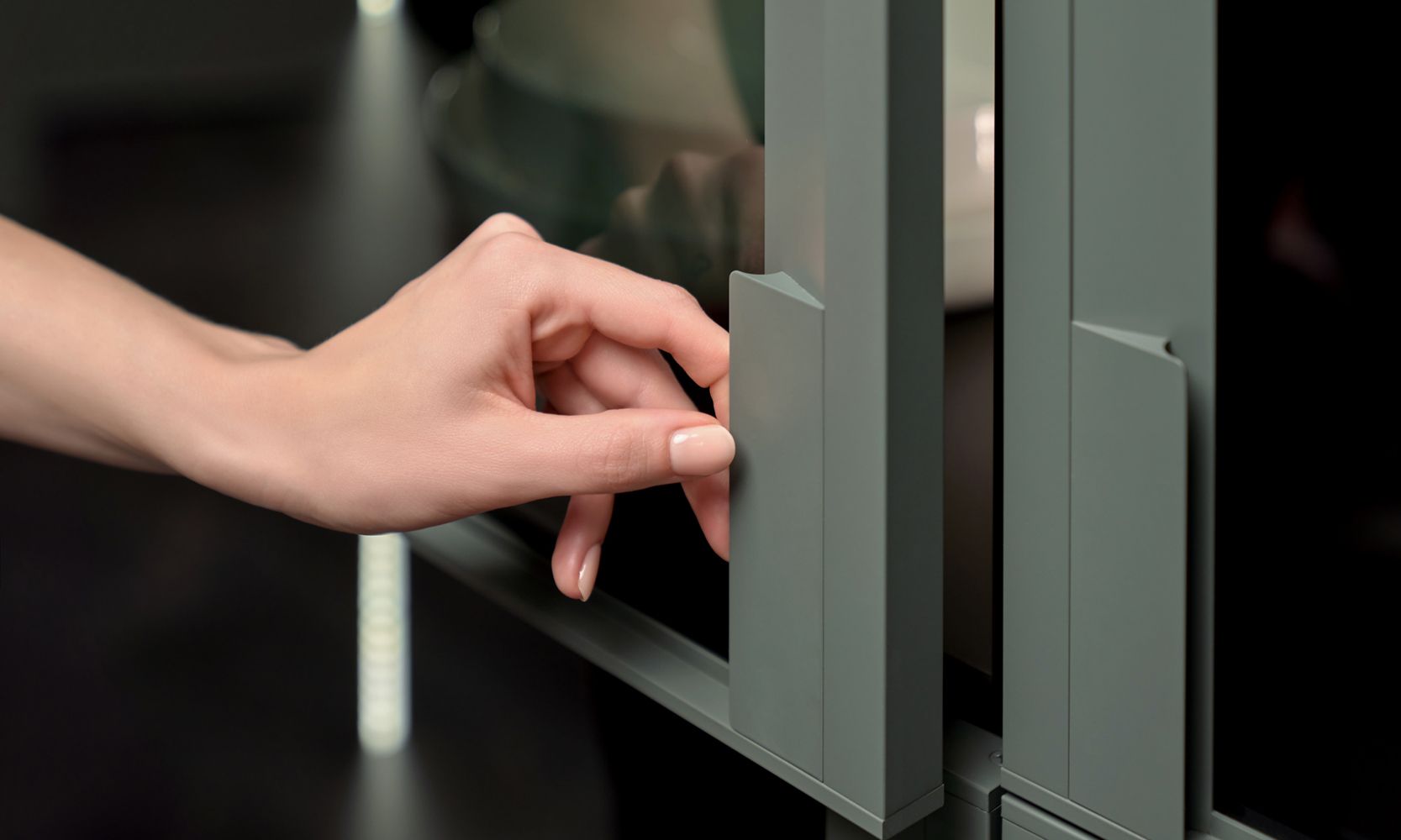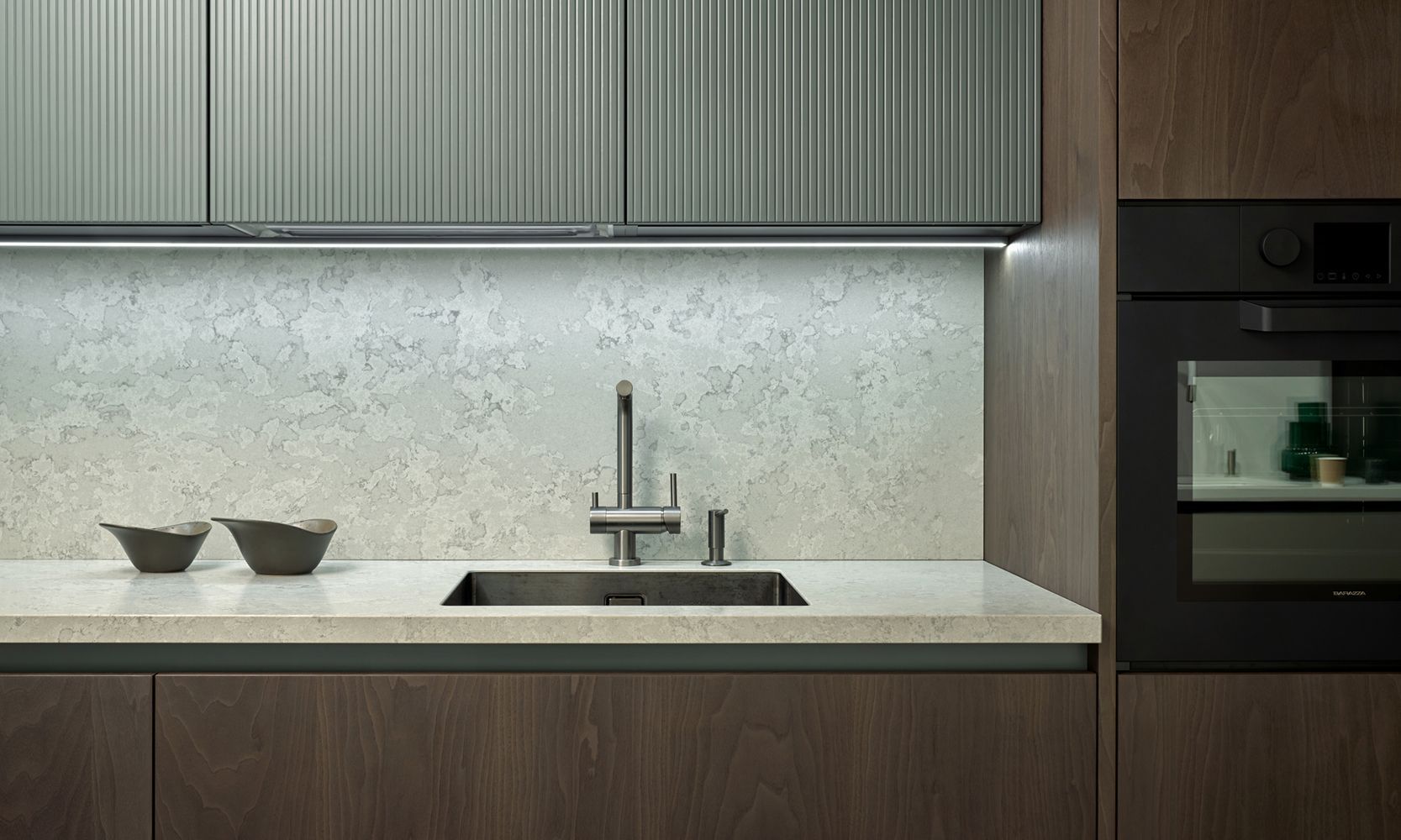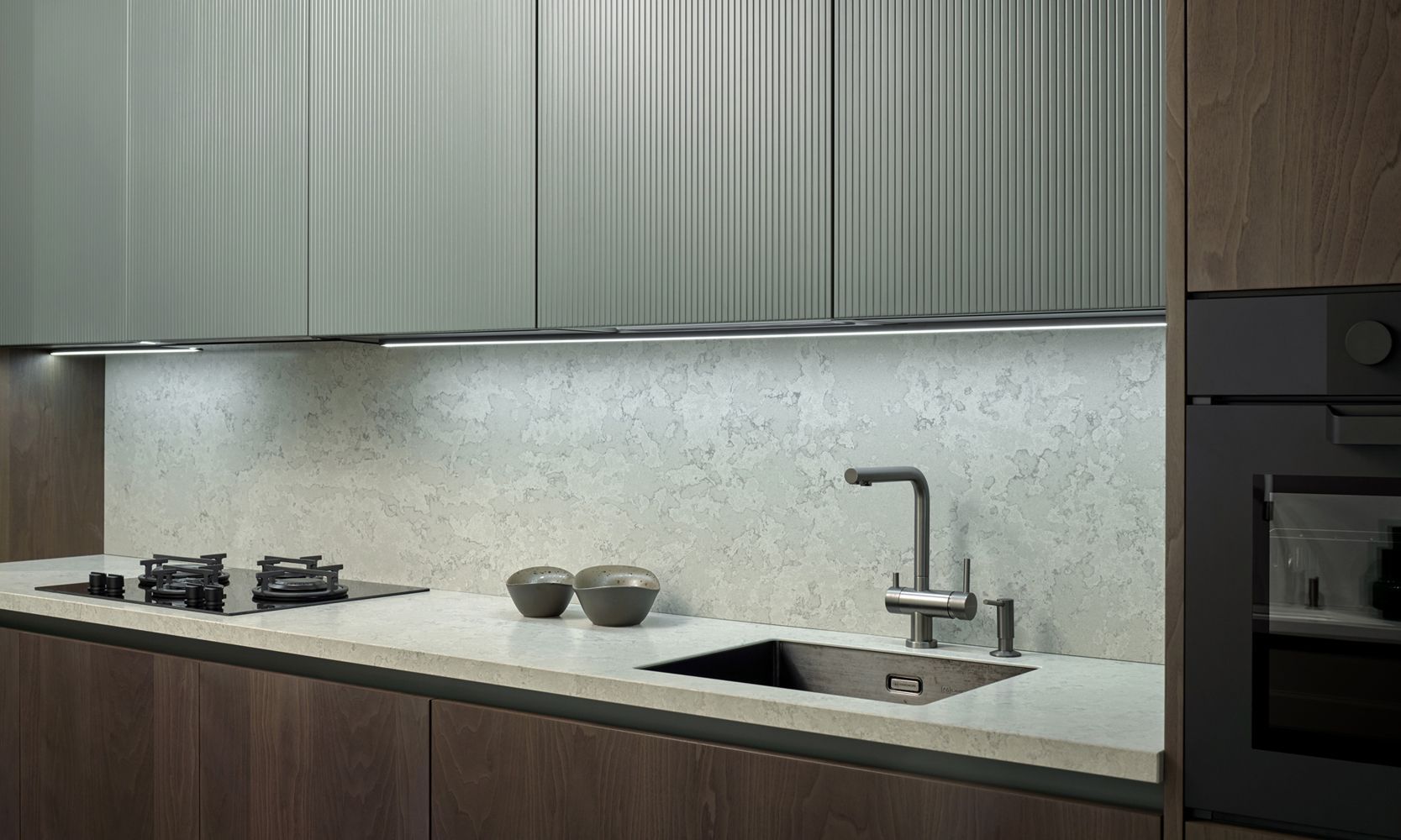 Фасады с отделкой матовой эмалью и вертикальной фрезеровкой Line очень приятны на ощупь. А еще – экологичны, влагоустойчивы и обладают высокой механической прочностью.