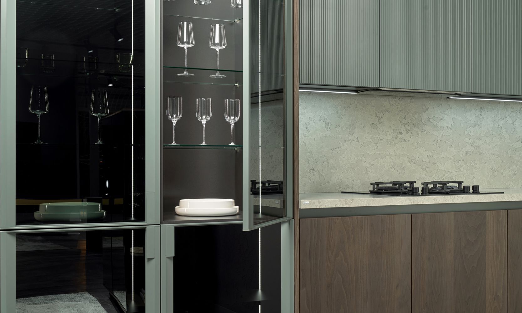 Украшением коллекции служат шкафы-витрины с подсветкой. Алюминиевая рамка их фасадов выполнена в трендовых оттенках Устричный и Никель.