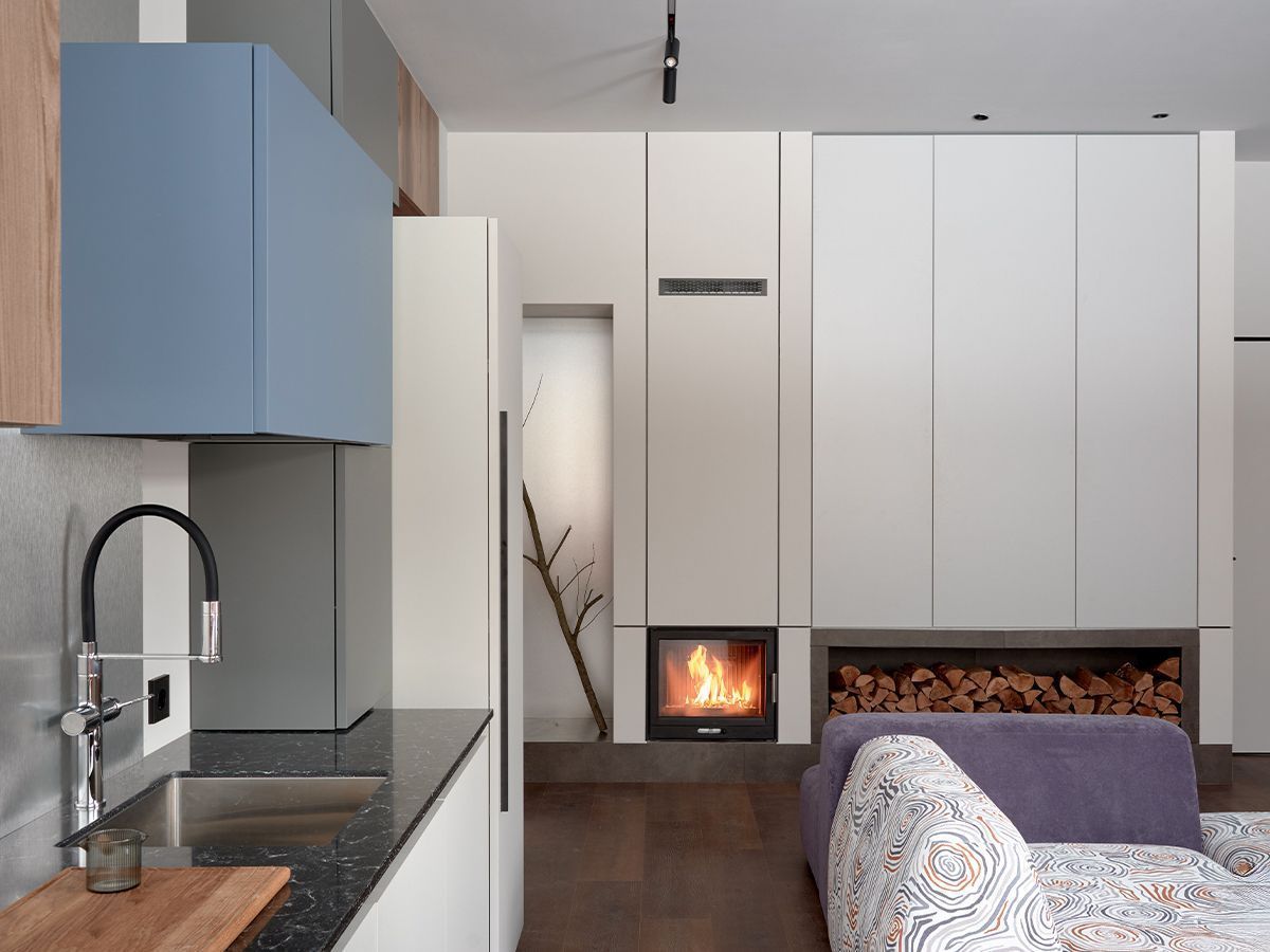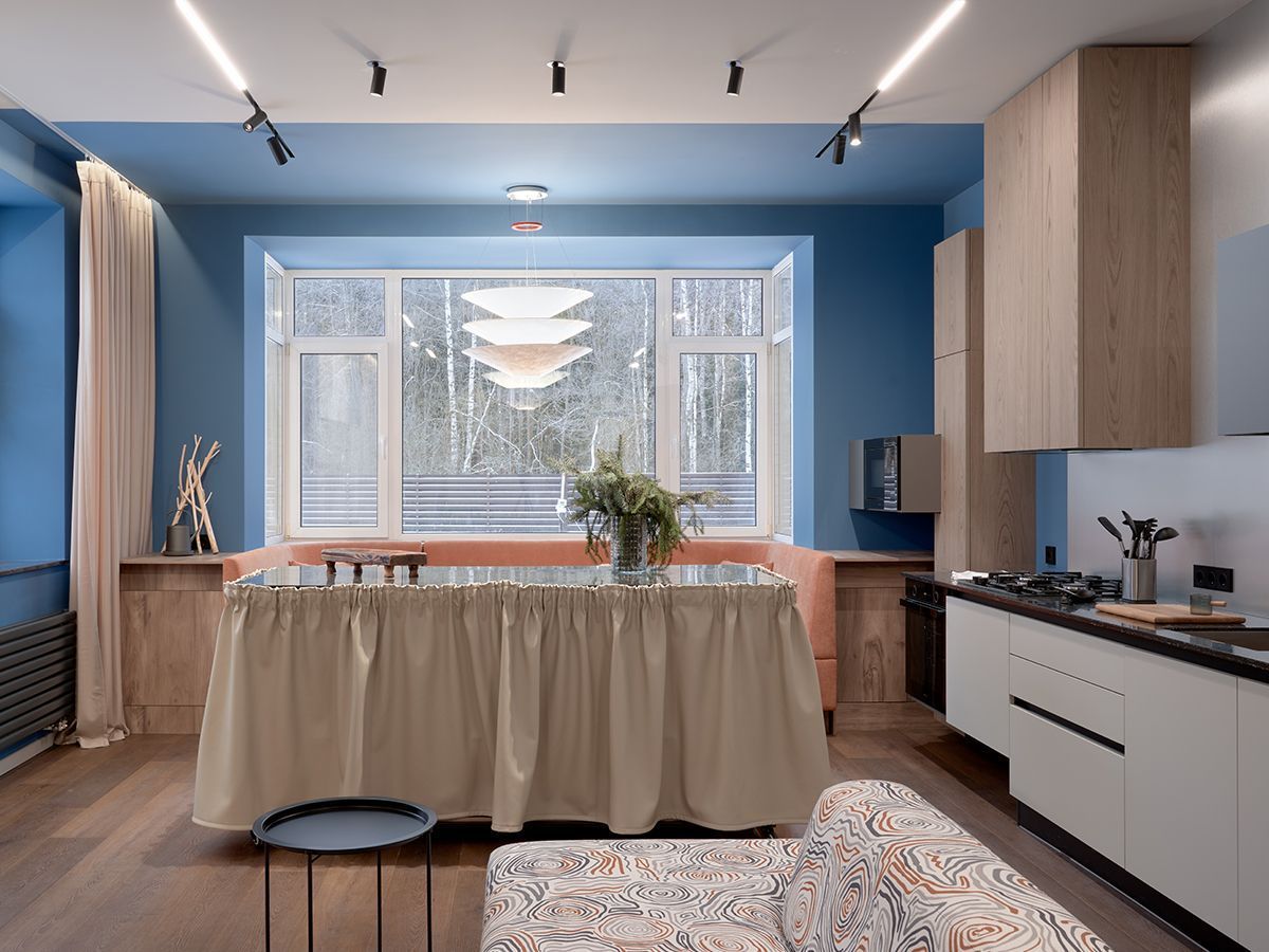 Многомерность подчеркивается цветовой гаммой: сочетанием белого матового покрытия, оттенка Серый оникс, древесной текстуры и акцентного синего.