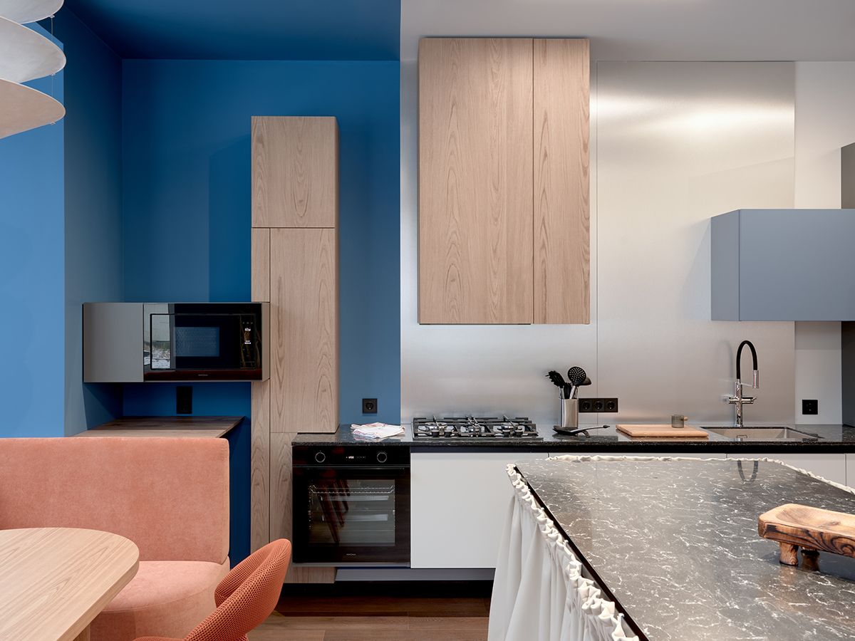 В подвесном шкафу над варочной панелью спрятана мощная вытяжка. Синий шкаф под сушку оснащен подъемным механизмом – его фасад откидывается вверх. Духовой шкаф имеет стандартное размещение. Почти стандартное, потому что в этом необычном проекте он «парит» над полом.