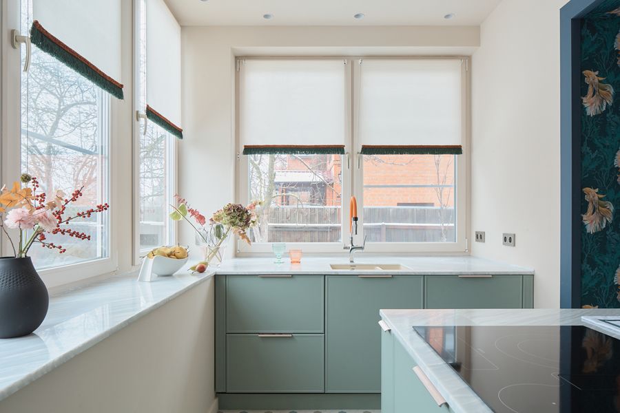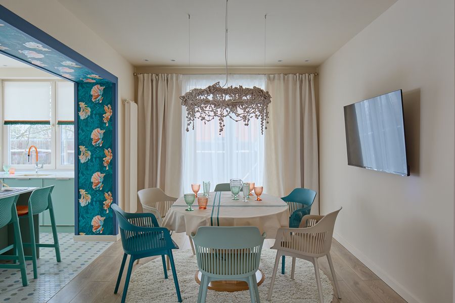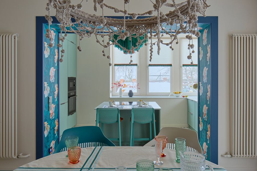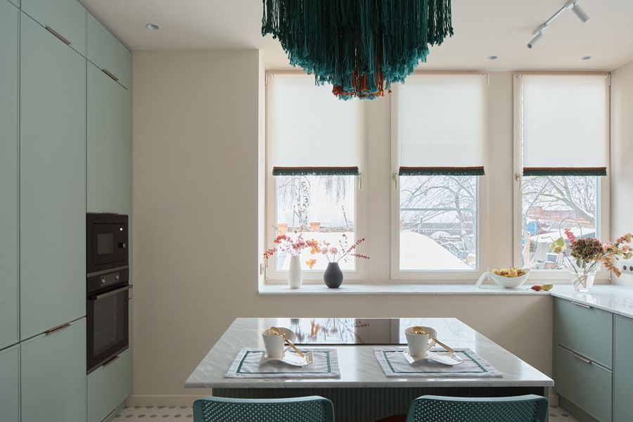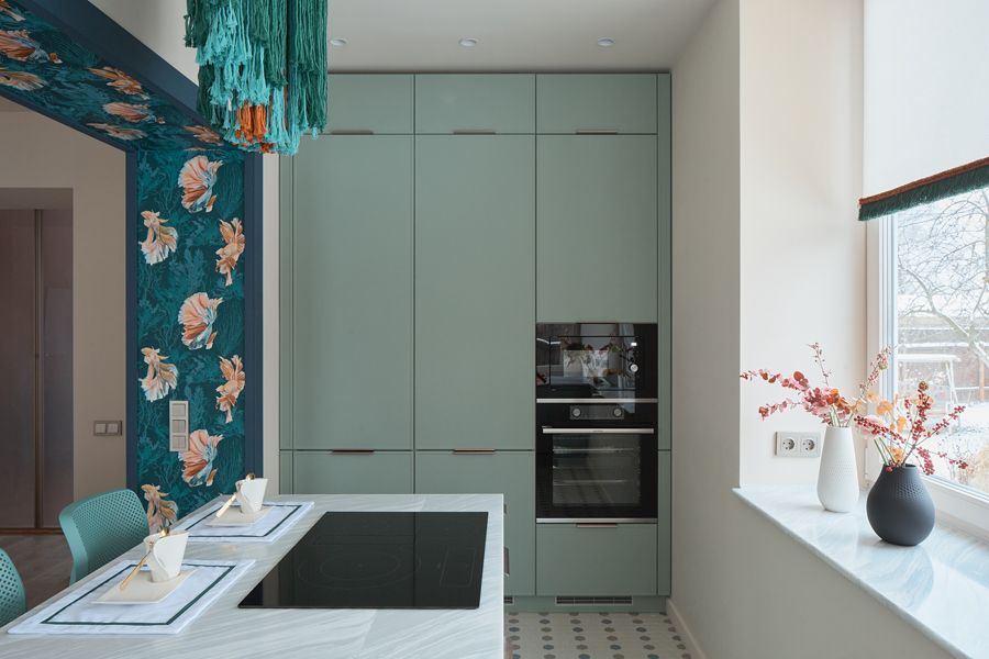 Герои программы, Валентина и Николай – заядлые рыбаки. Они даже участвовали в чемпионате и поймали самую большую форель весом 5 кг! Вдохновившись этим увлечением, дизайнер проекта Анна Громова создала для них интерьер, где обыгрывается тема рыбалки: декор и люстры в виде рыболовных сетей, обои с изображением экзотических рыб, цветовая гамма в оттенках морской волны с коралловыми акцентами. Отлично вписалась в него и кухня CANTI с матовыми фасадами пастельного оттенка Шалфей. Фасады выполнены из МДФ по технологии мембранного прессования. Эта технология, используемая на современном производстве в городе Дятьково, обеспечивает равномерное нанесение покрытия, не оставляя воздух в местах изгибов материала. Таким образом обеспечиваемся безупречный внешний вид фасадов в течение все срока эксплуатации.