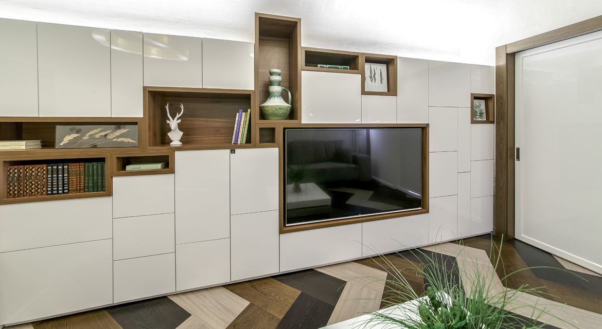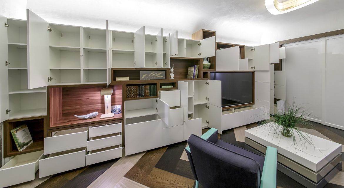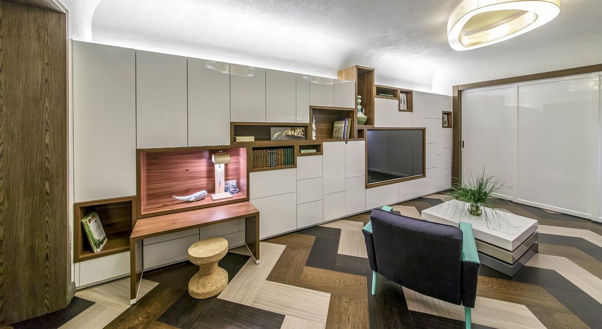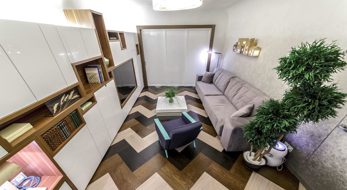 Вместо старомодного убранства — уютная гостиная, которая понравилась не только хозяевам, но и домашним любимцам — коту, собаке и трем попугаям. Обстановку 80-х годов сменил антистрессовый интерьер со скругленными углами, множеством мест для хранения, скалодромом, деревянной горкой и светящимся скворечником. Специально для нового интерьера экспертами «Дятьково» была сконструирована вместительная шкафная группа, выполненная по индивидуальному эскизу.