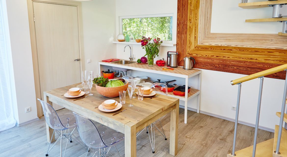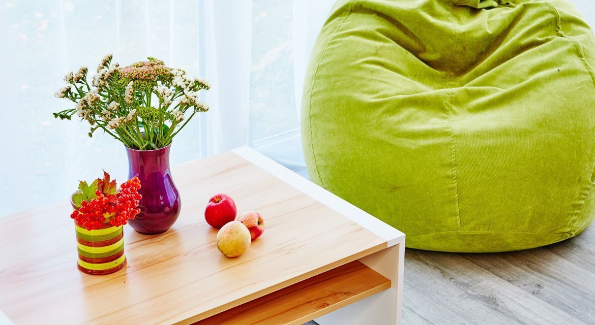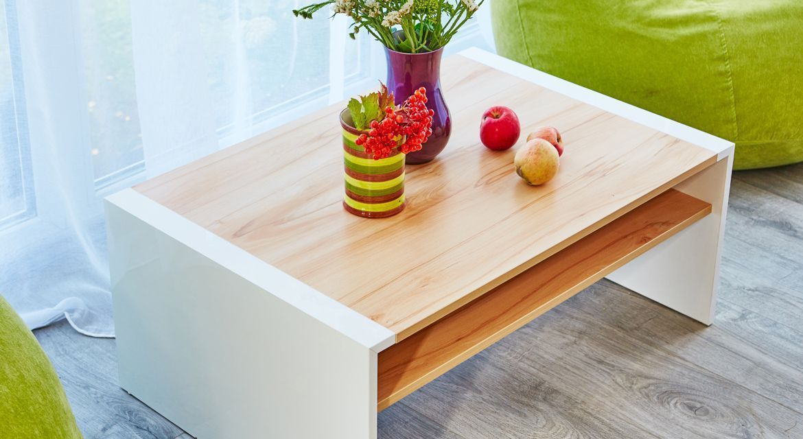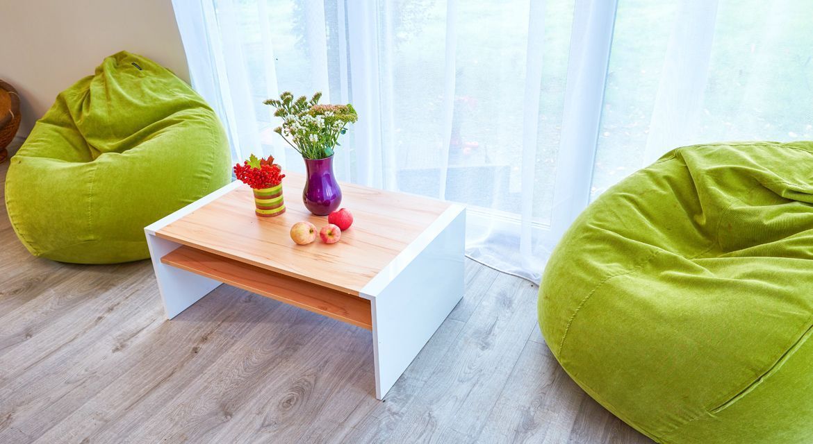 Интерьер в эко-стиле прекрасно дополнила стильная и минималистичная мебель коллекции PLAZA. При входе в комнату разместилась оригинальная вешалка с зеркальным фасадом, зрительно увеличивающим пространство, а у панорамного окна – журнальный столик из светлого дерева с белыми глянцевыми вставками.