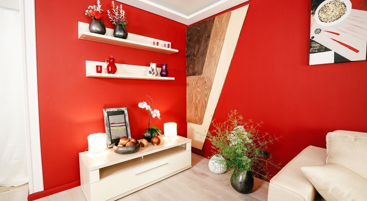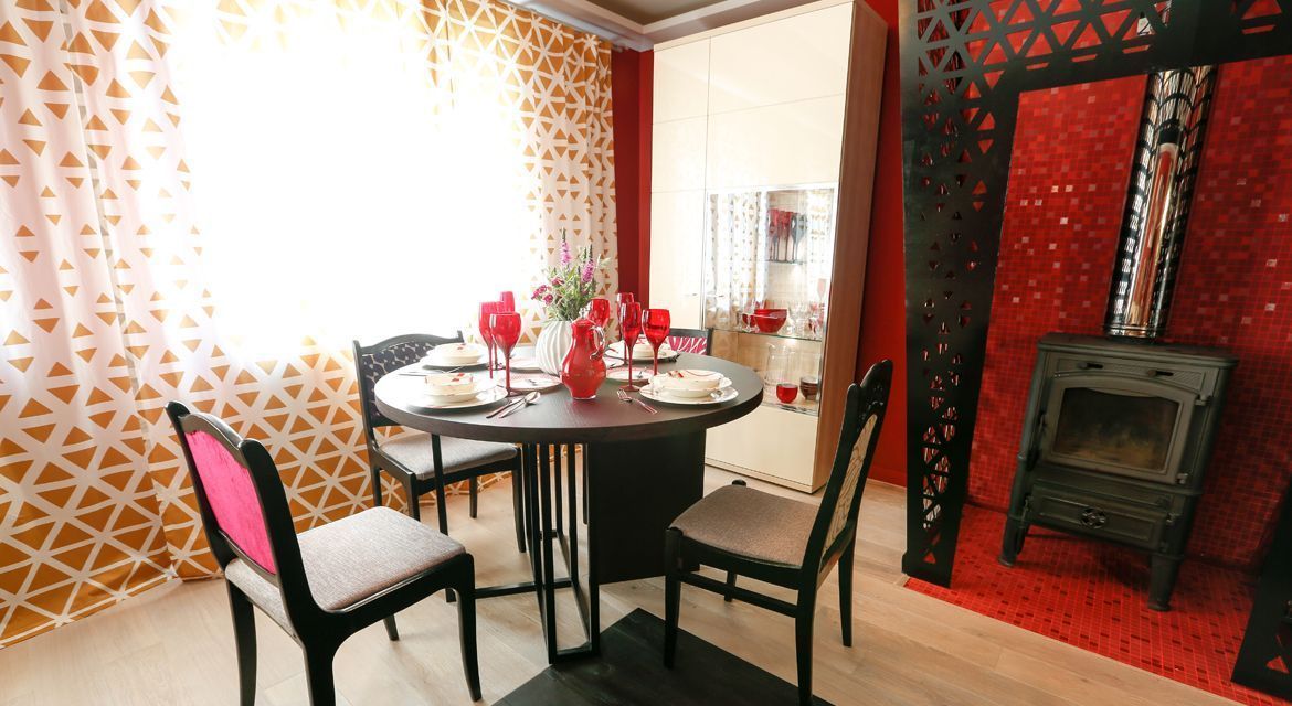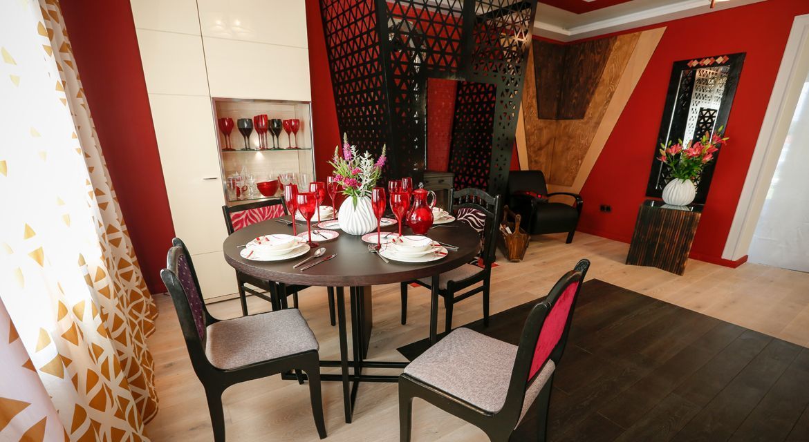 Основным цветом гостиной стал насыщенный красный. Выгодным фоном для него стала мебель из коллекции EDEL – тумба, открытые полки и вместительный шкаф. Глянцевые фасады, эксклюзивное поперечное тиснение, оттененное дизайнерской подсветкой, и стеклянные витрины в стильной металлической оправе идеально гармонируют с общим ансамблем гостиной, где каждый элемент выглядит самодостаточным, в то же время выгодно подчеркивая достоинства остальных. По словам ведущего Романа Будникова, мебель Дятьково сыграла партию скрипки в этой музыкальной импровизации.