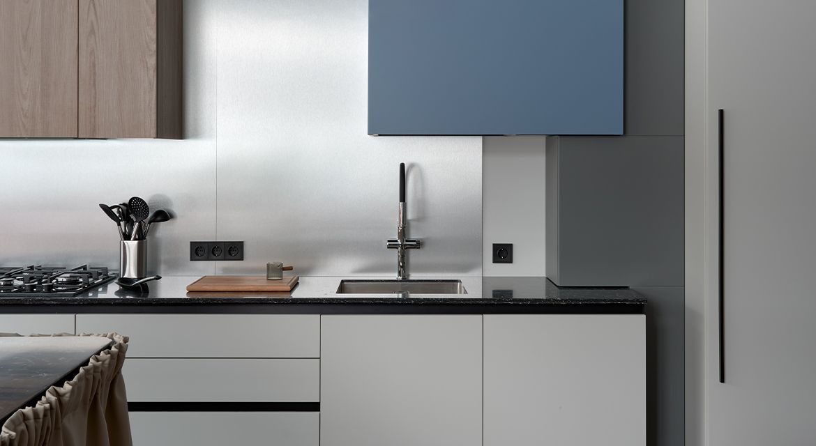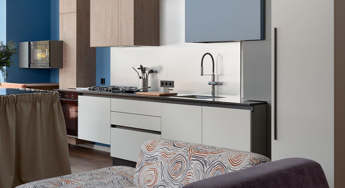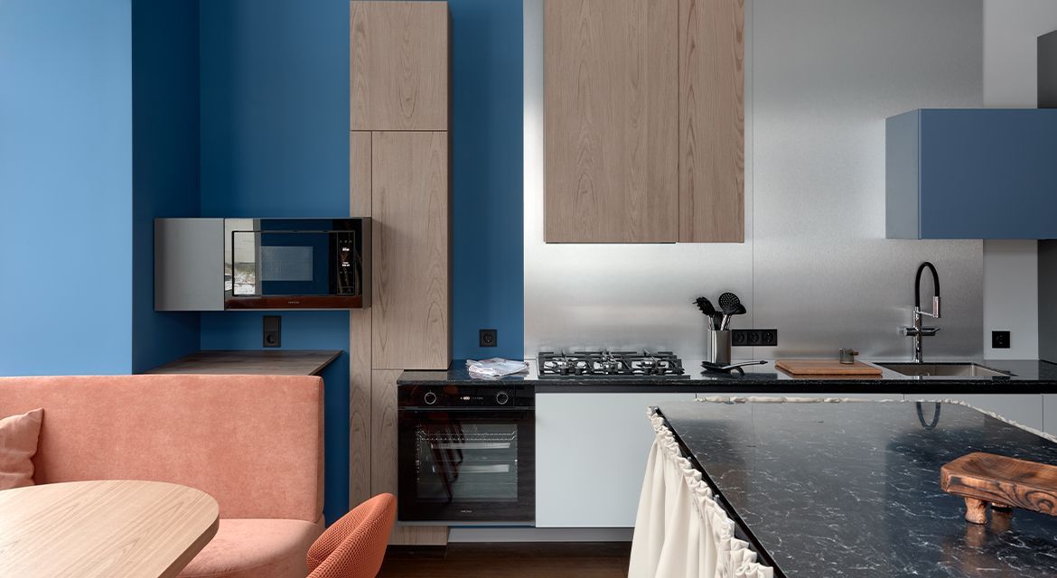 В подвесном шкафу над варочной панелью спрятана мощная вытяжка. Синий шкаф под сушку оснащен подъемным механизмом – его фасад откидывается вверх. Духовой шкаф имеет стандартное размещение. Почти стандартное, потому что в этом необычном проекте он «парит» над полом.