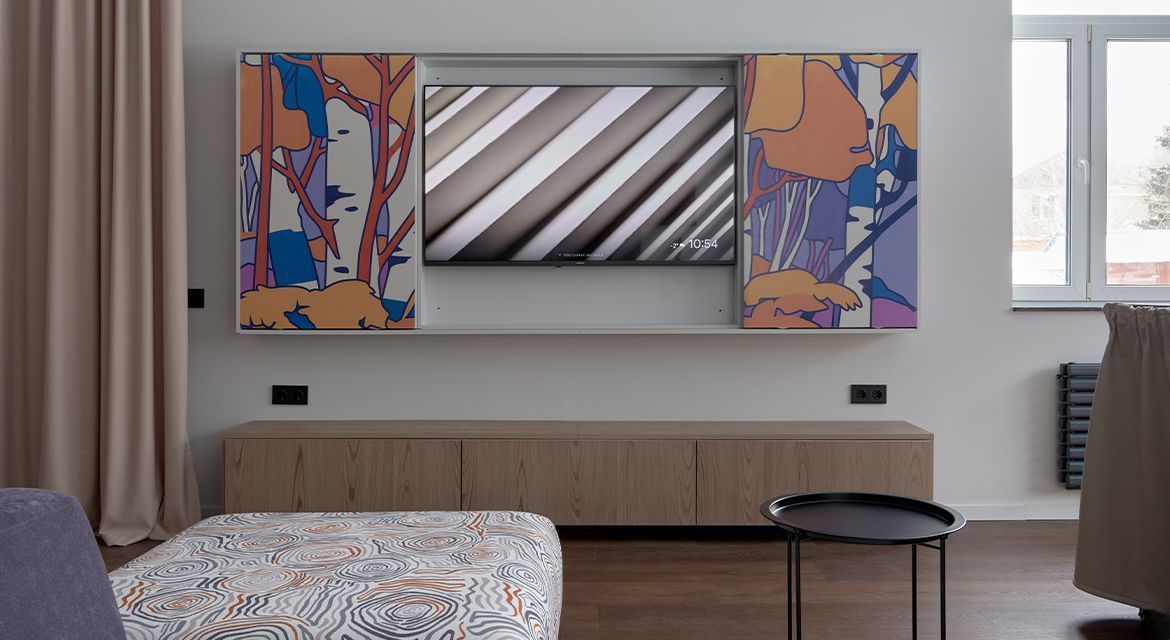 Дизайн элементов поддерживает общую колористику пространства и повторяется в оформлении гостиной зоны. Для нее на мебельном производстве в Дятьково изготовлены распашные настенные панели, а также вместительная 7-секционная ТВ-тумба. Элемент имеет навесное исполнение и оснащен встроенной подсветкой, создающей уютную атмосферу.