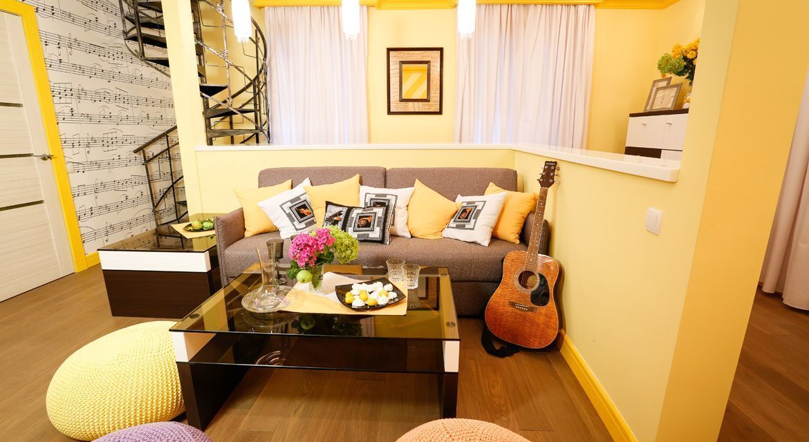 Для создания яркого и солнечного интерьера гостиной дизайнер выбрала TOKIO — одну из трендовых коллекций нашего ассортимента. Мебель поддерживает концепцию «музыкального салона», предложенную дизайнером. Контрастное сочетание темной древесной текстуры и белых фасадов с тиснением перекликается с рисунком стен, имитирующим нотную запись.