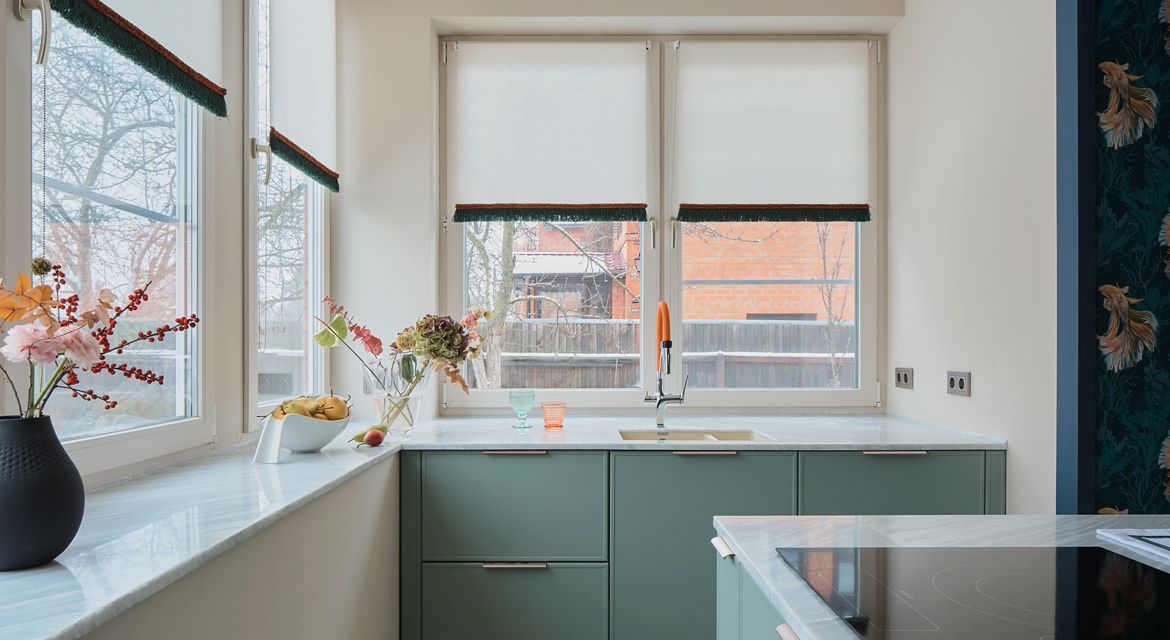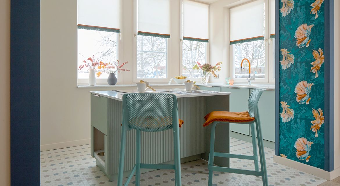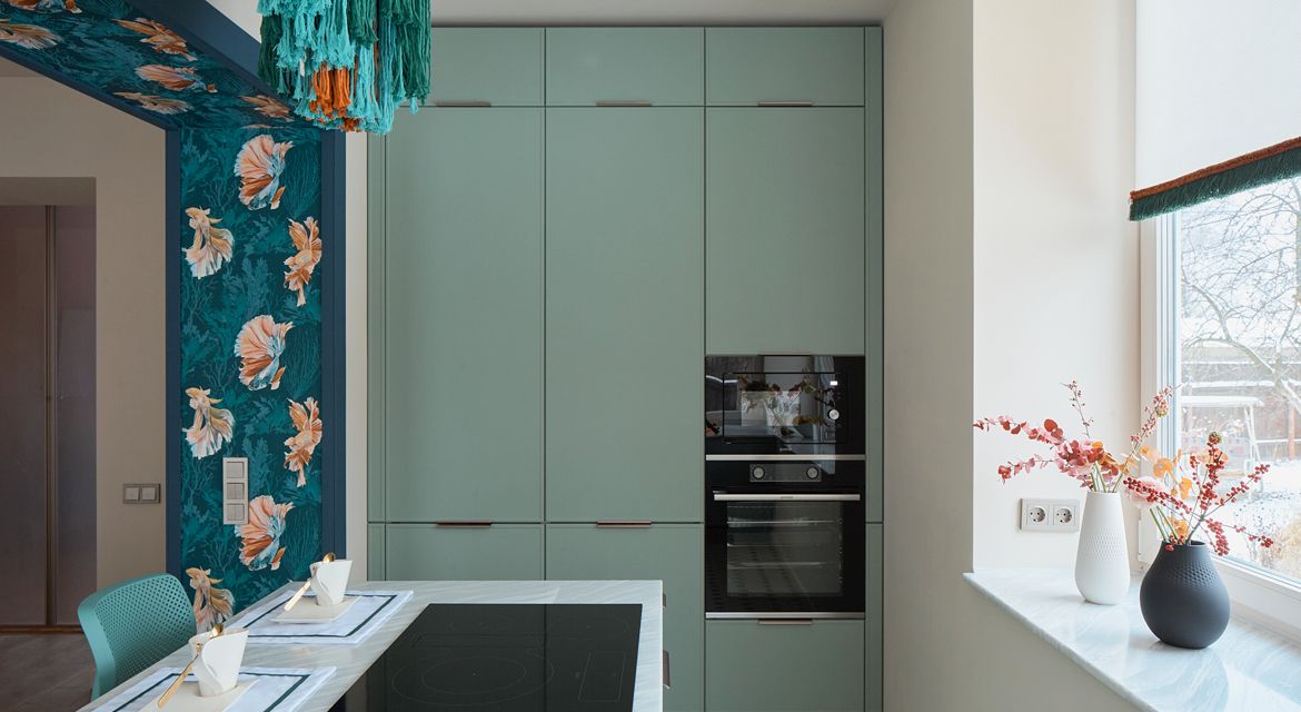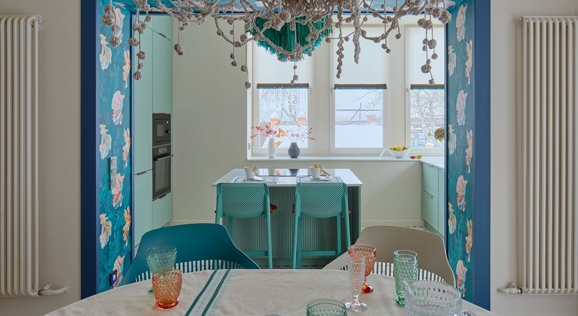 Герои программы, Валентина и Николай – заядлые рыбаки. Они даже участвовали в чемпионате и поймали самую большую форель весом 5 кг! Вдохновившись этим увлечением, дизайнер проекта Анна Громова создала для них интерьер, где обыгрывается тема рыбалки: декор и люстры в виде рыболовных сетей, обои с изображением экзотических рыб, цветовая гамма в оттенках морской волны с коралловыми акцентами. Отлично вписалась в него и кухня CANTI с матовыми фасадами пастельного оттенка Шалфей.